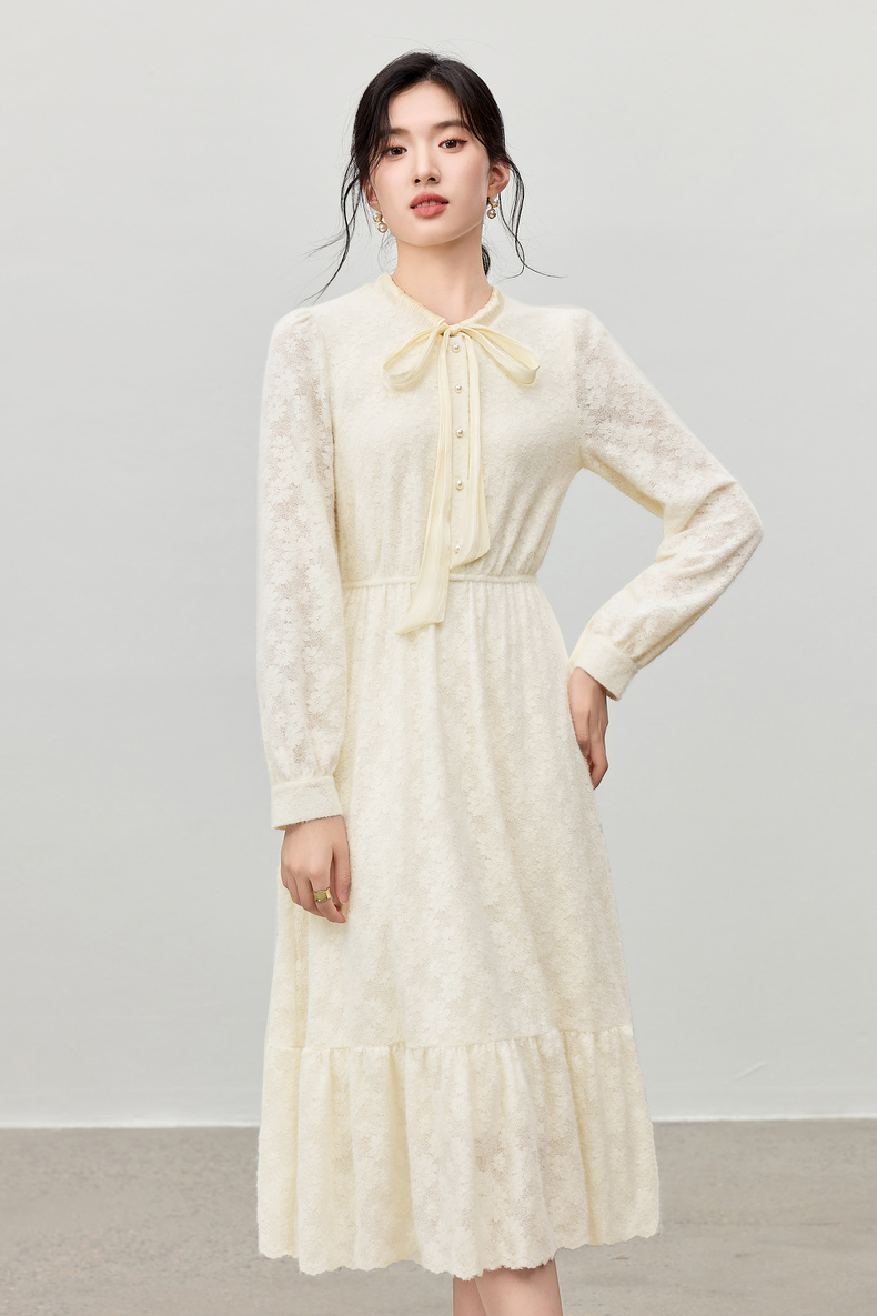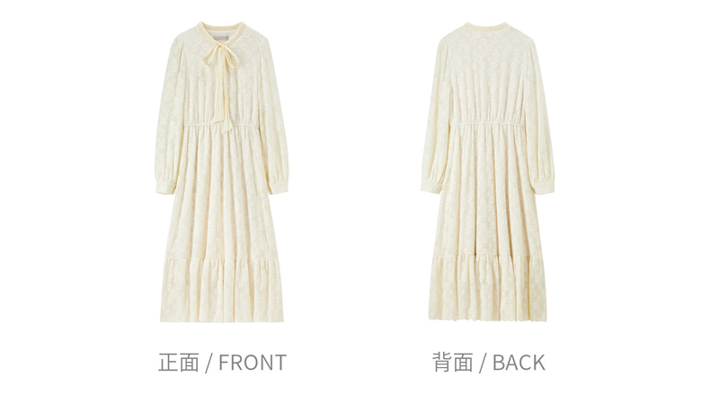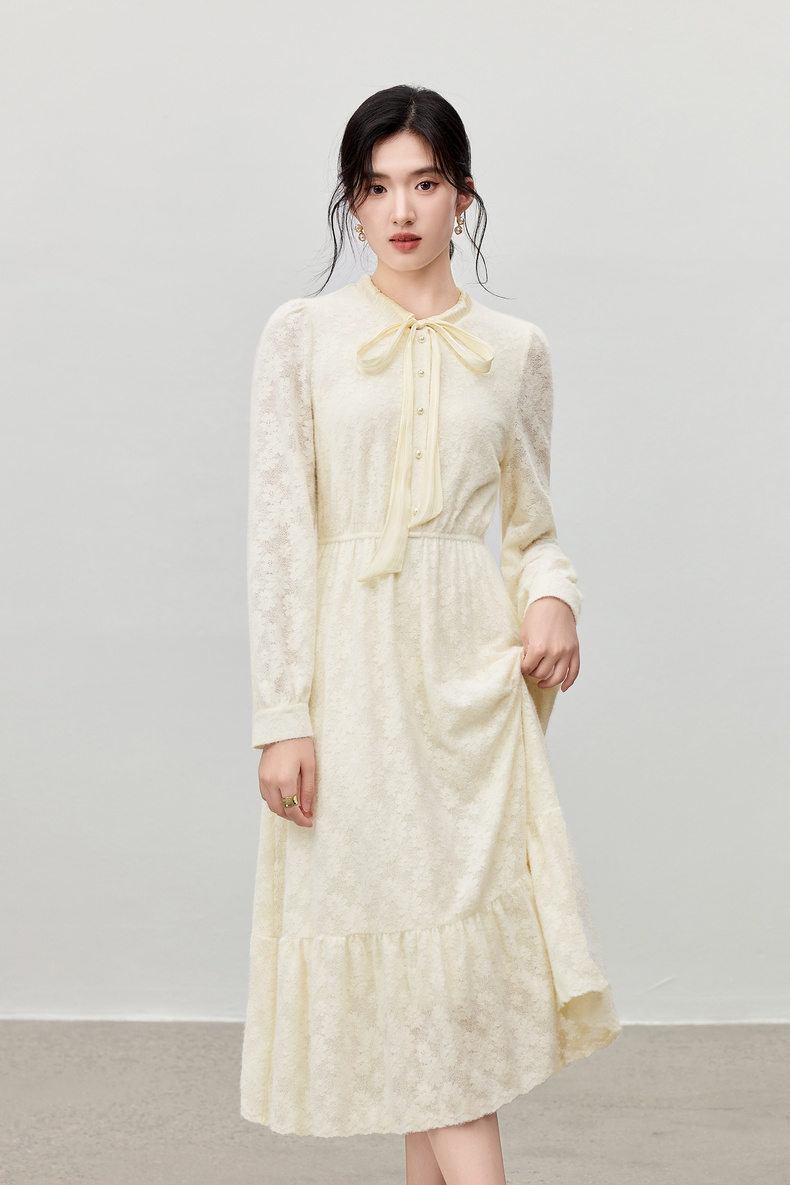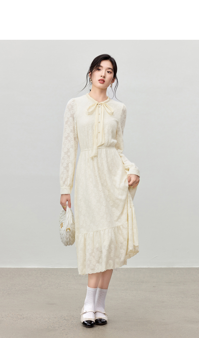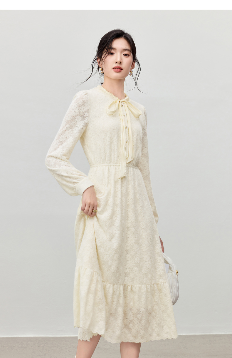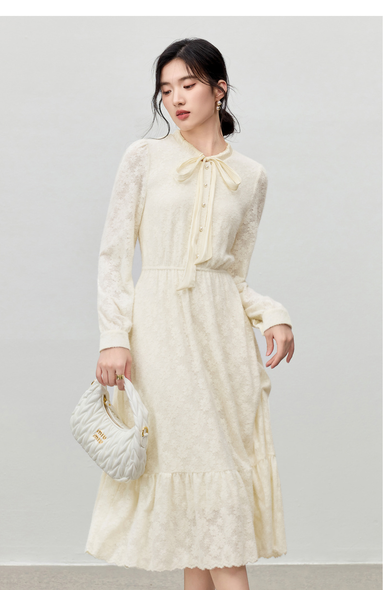 【内购】【飘带领】优雅通勤珍珠扣松紧腰拼接裙摆花朵磨毛蕾丝连衣裙-153LA3087