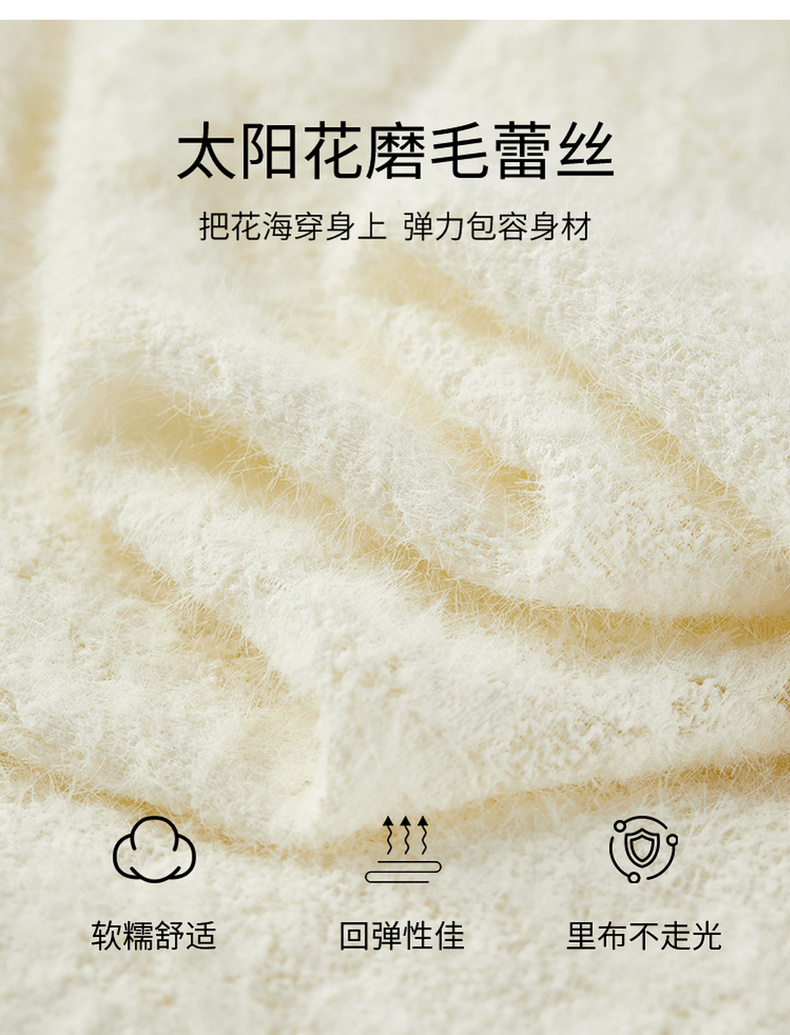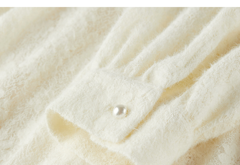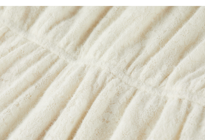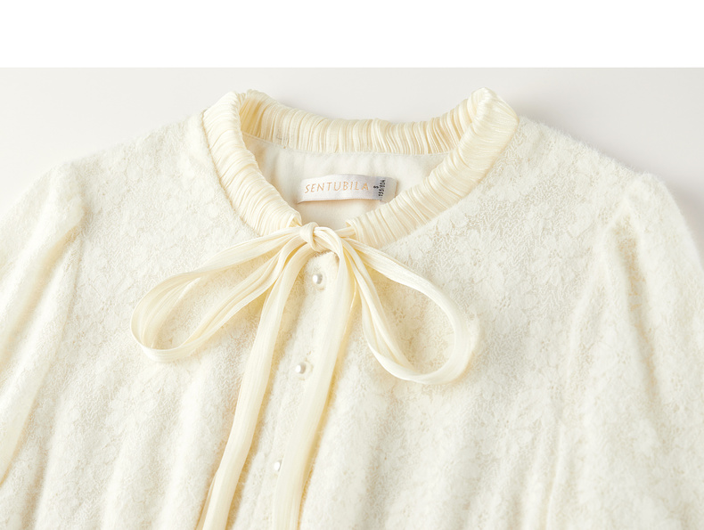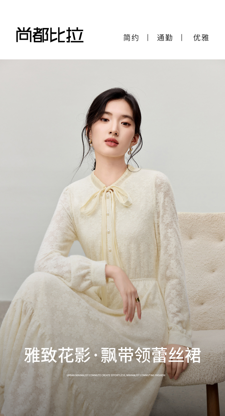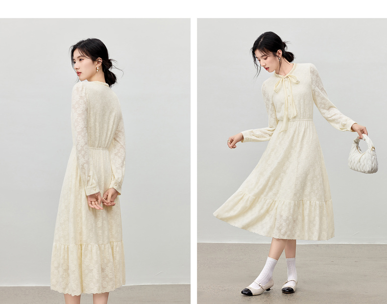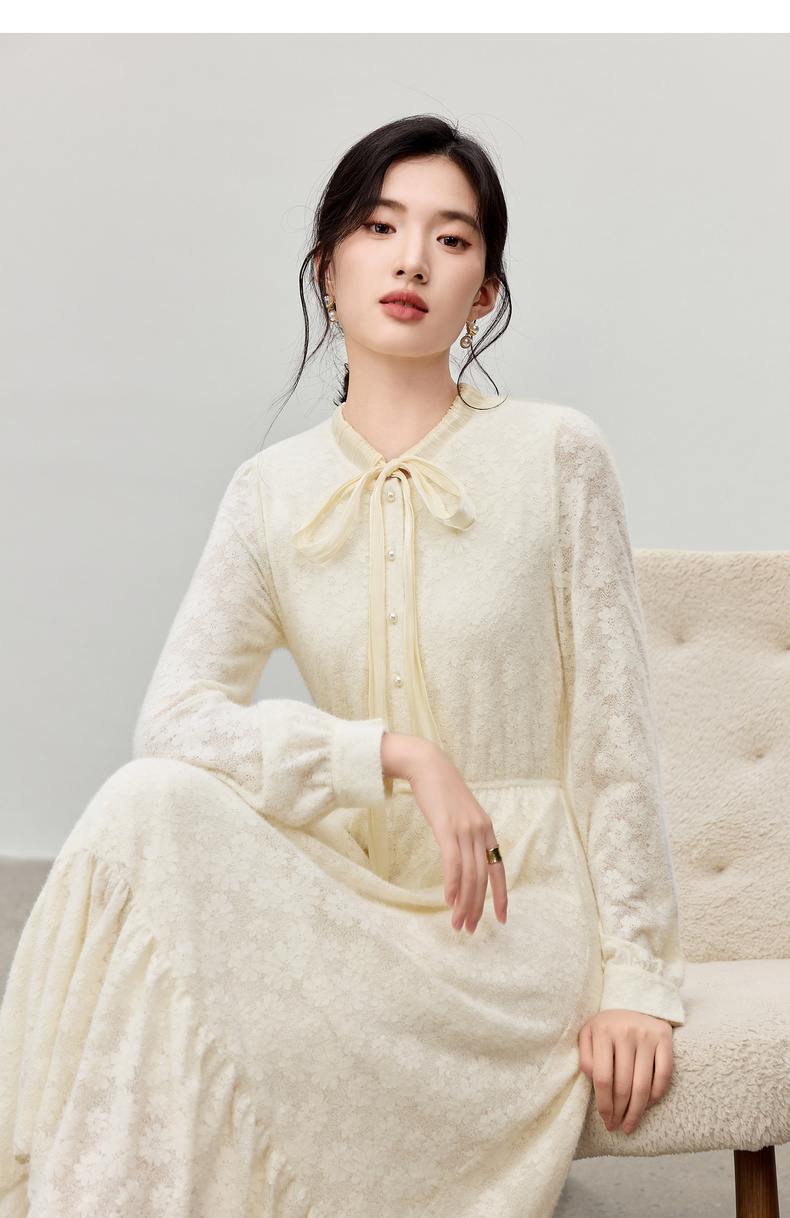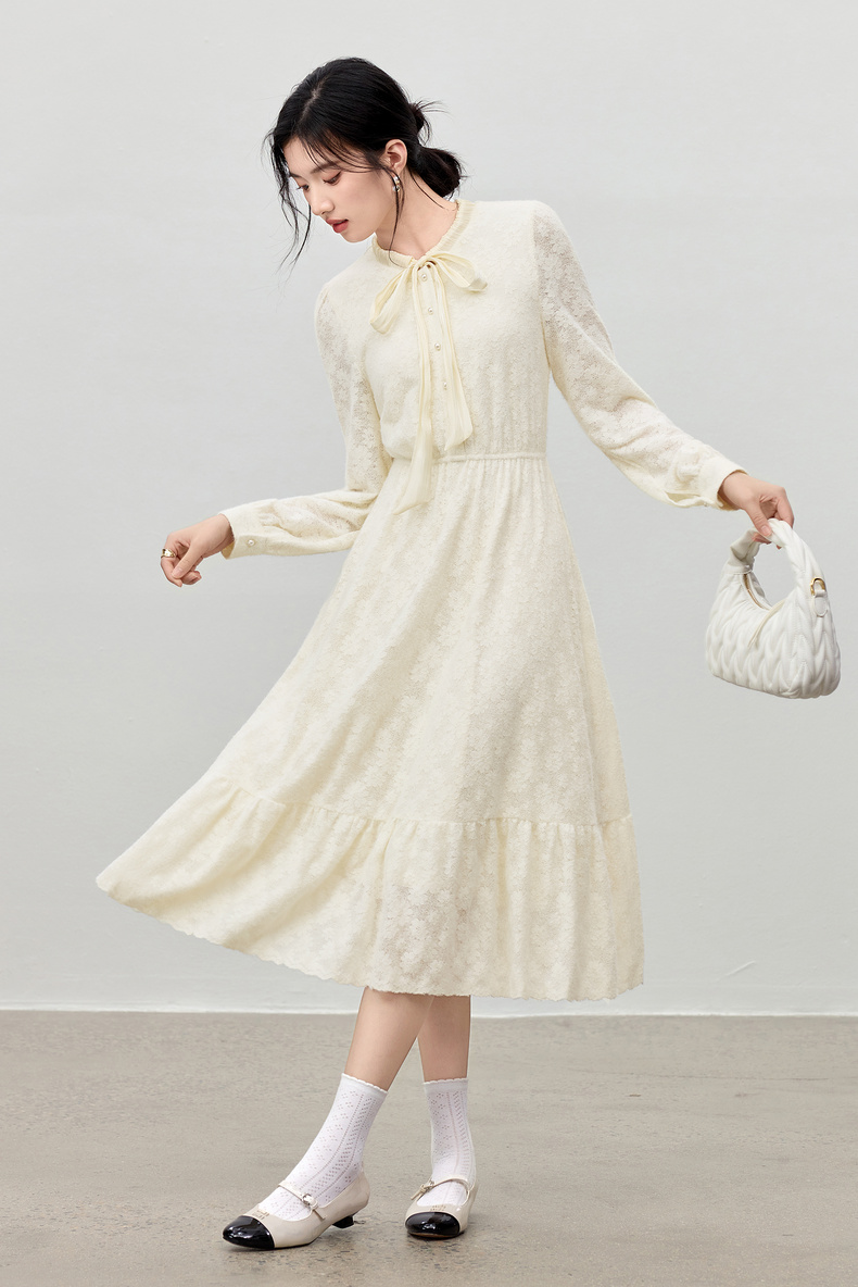 【内购】【飘带领】优雅通勤珍珠扣松紧腰拼接裙摆花朵磨毛蕾丝连衣裙-153LA3087
