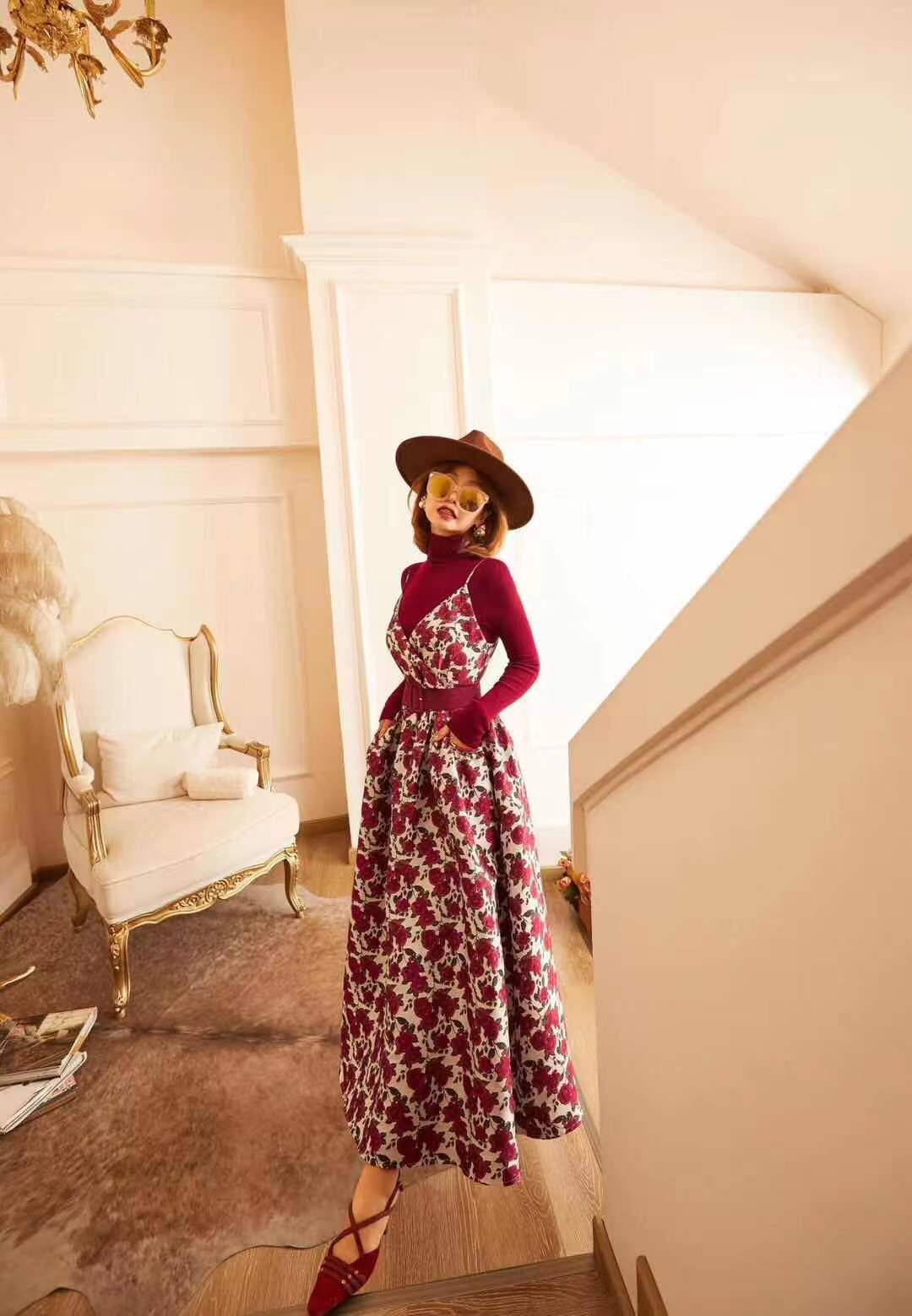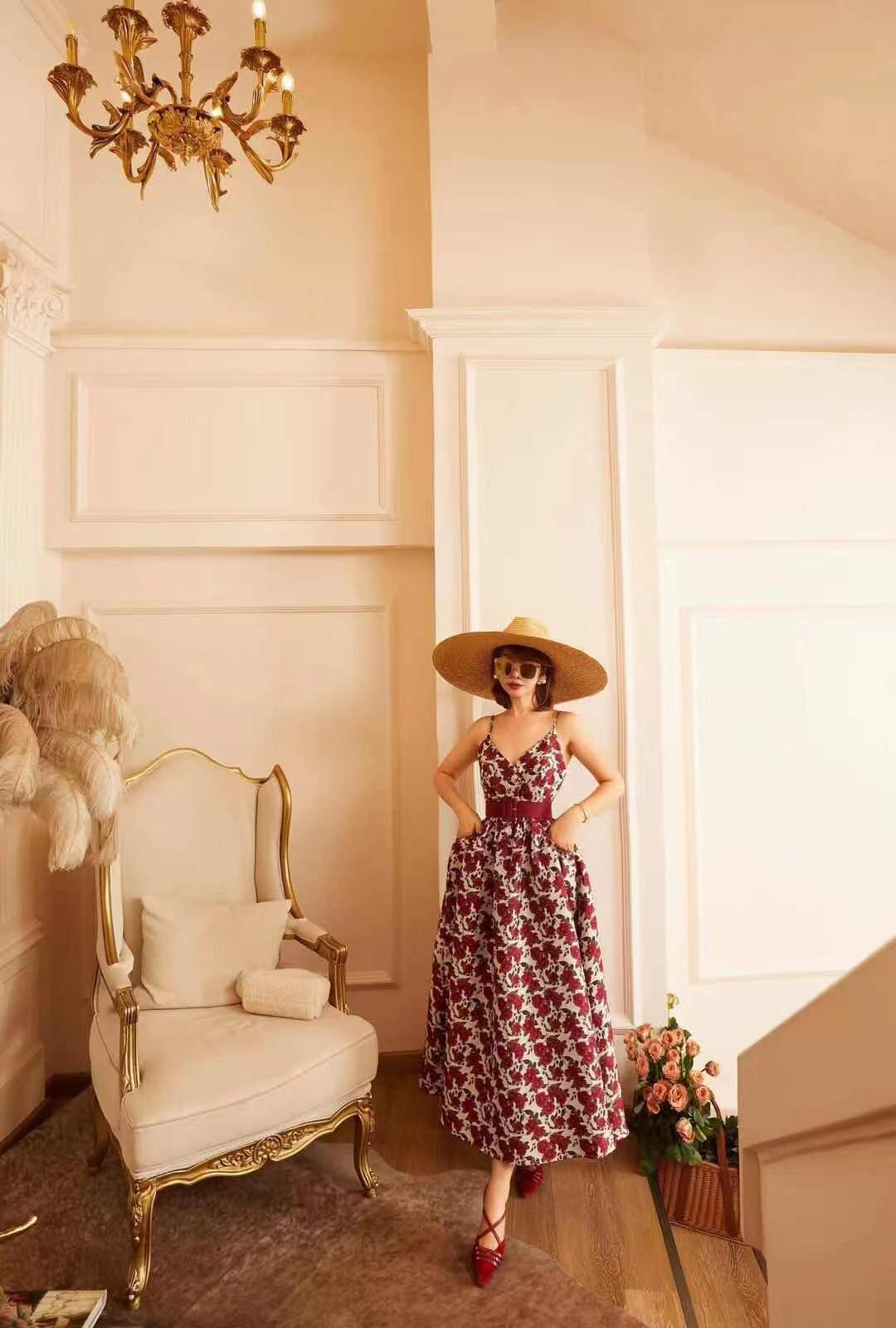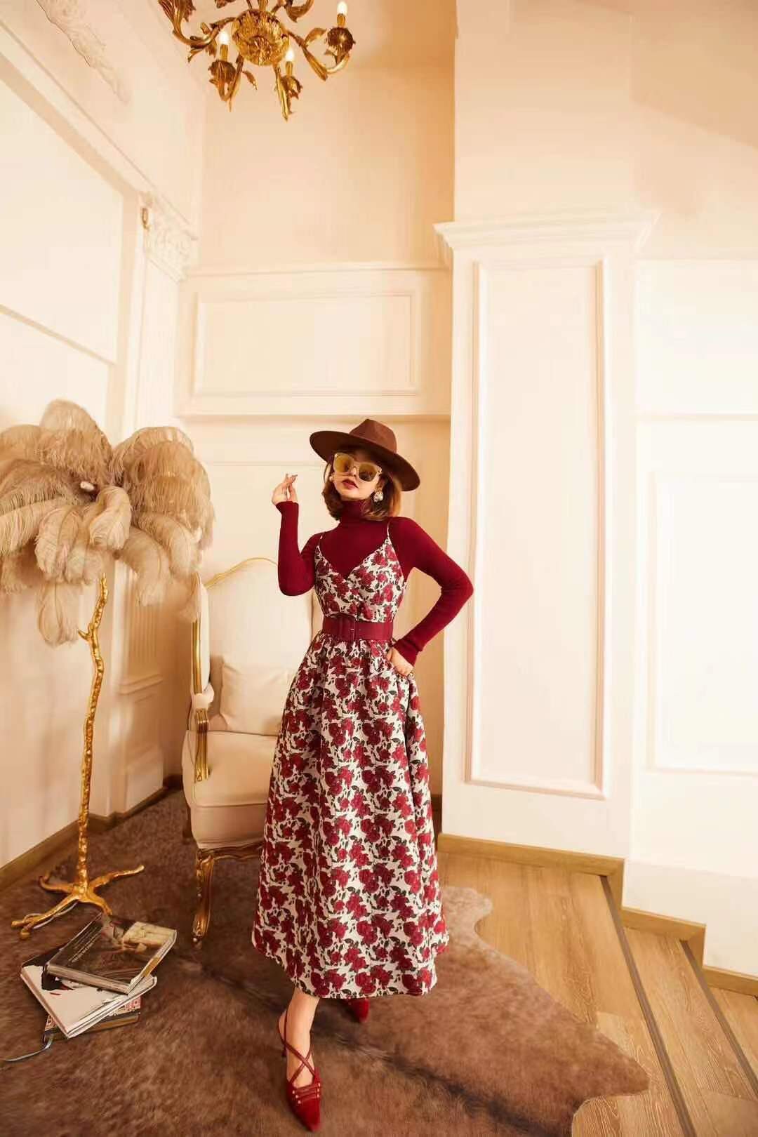 71557 # 早春款 贵气轻奢重工刺绣 复古精致高级连身裙 设计经典耐看 一眼心动 重工刺绣工艺 花型立体生动 红 S-XL码