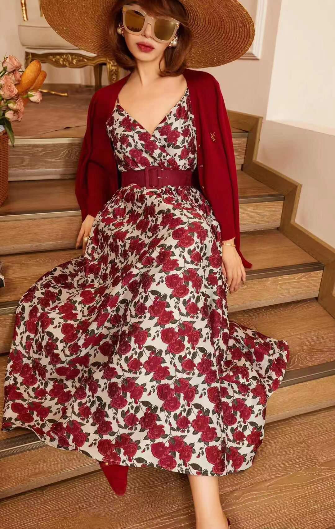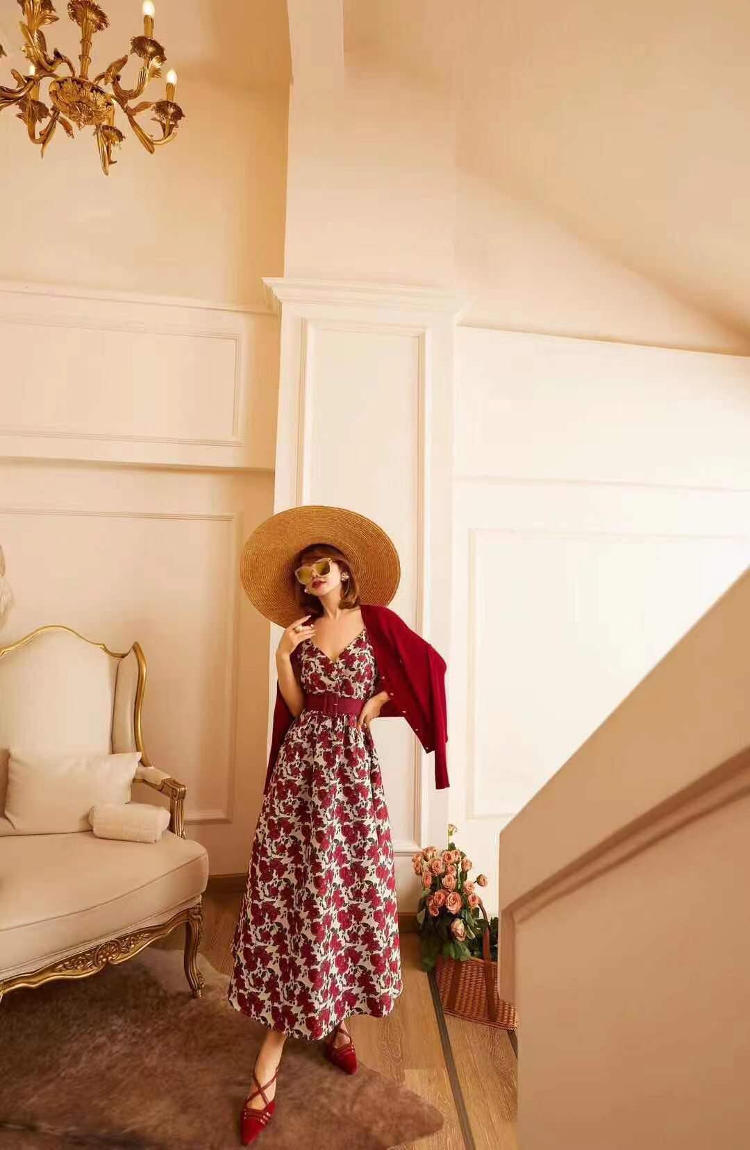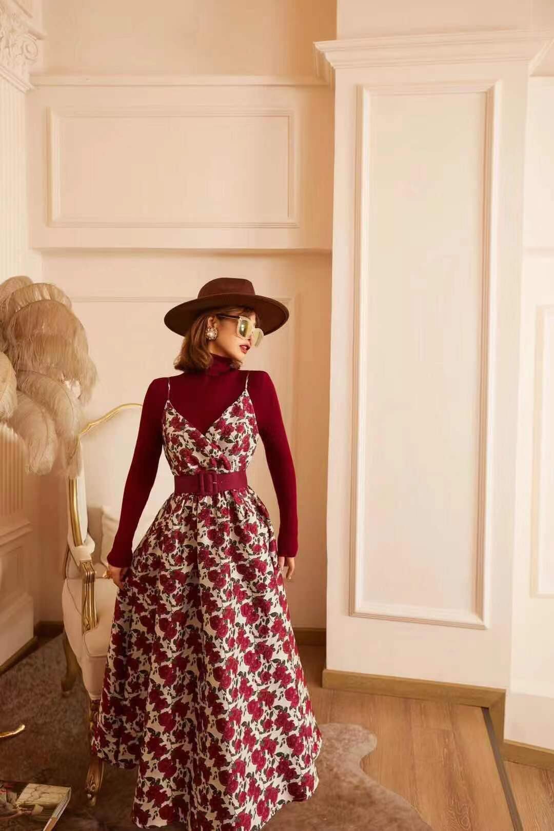 71557 # 早春款 贵气轻奢重工刺绣 复古精致高级连身裙 设计经典耐看 一眼心动 重工刺绣工艺 花型立体生动 红 S-XL码