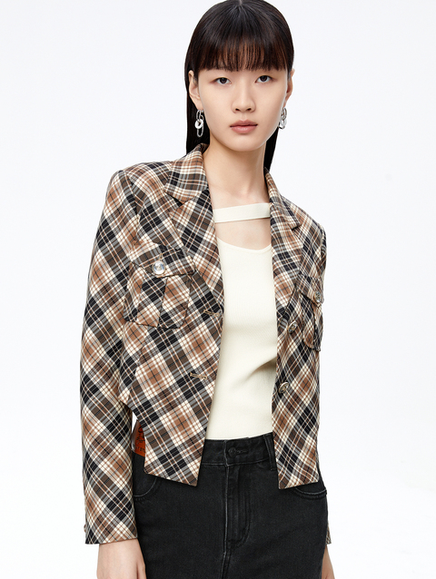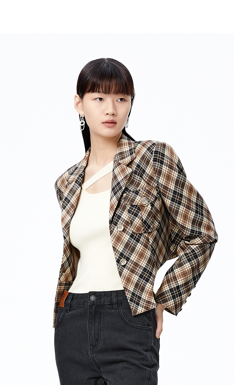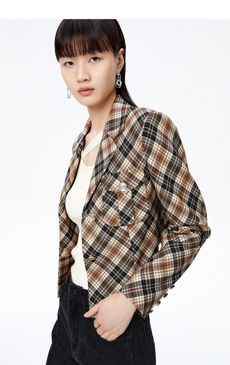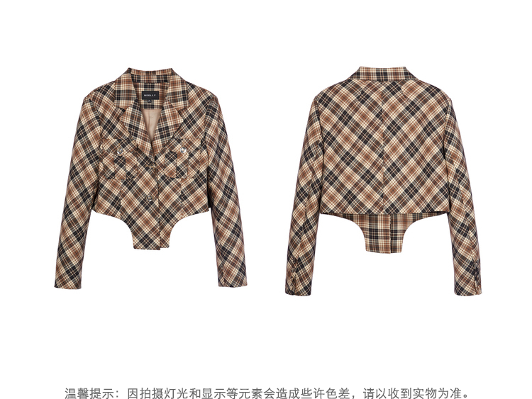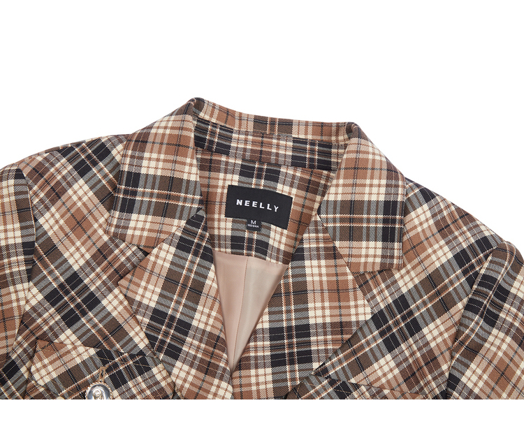 NEELLY纳俪商场同款复古格纹西装外套女秋季新款设计感短款上衣