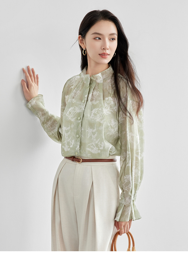 【内购】扎染底色优雅系列莱赛尔混纺荷叶边小立领花苞袖气质衬衫女-58061