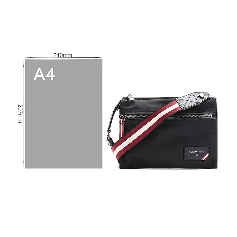 ![]() | 品牌:BALLY 巴利 产地:中国等国(批次不同,产地不同) 款式:男士 颜色:黑色 材质:织物 产品结构:拉链开合,内置1个拉链贴袋,2个贴袋,外置1个贴袋,1个拉链贴袋(内含1个贴袋) 产品尺寸:宽约27cm,高约20cm,厚约3cm,可拆卸可调节肩带长约136cm,宽约4cm