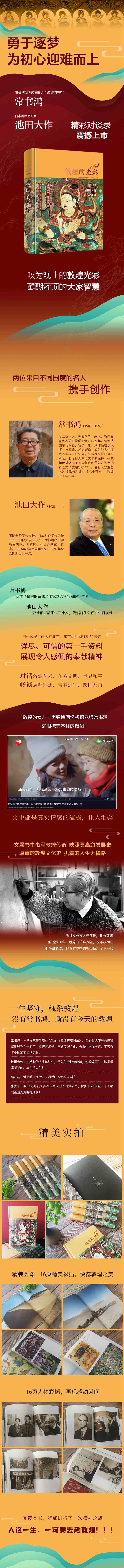 1.首任敦煌研究院院长、被誉为“敦煌守护神”的常书鸿先生与世界著名思想家池田大作先生有关敦煌艺术及东方文明的长篇对谈录。对谈从池田大作于第五次访华时(1980年)与常书鸿相识开始,收录了两人在北京、东京两地间往返的书信。2.这两位来自不同国度、有着不同经历的名人围绕敦煌,谈古说今,讲东道西,就中外艺术史、东方文明、世界和平等展开讨论,新见迭出,精彩纷呈。3.两人还谈到各自的志趣理想、人生经历和彼此的友情。言谈话语间,表现了两位作者让人泪目的奉献精神和社会责任感,彰显出醍醐灌顶的大家智慧。4. 一生坚守,魂系敦煌。没有常书鸿,就没有今天的敦煌。叹为观止的敦煌光彩,见证了常书鸿执着的人生无悔路。池田大作曾问常书鸿:“如果来生再到人世,你将选择什么样的职业?”常书鸿回答:“如果真的还有来世,我将还是常书鸿。我要去完成我想为敦煌所做而尚未做完的工作。”5.常书鸿:自从在巴黎看到伯希和的《敦煌石窟图录》,我的命运便与敦煌紧紧地联系在一起了。敦煌艺术是中国的传统文化,舍命也得保护它,不管有多少困难都必须克服。池田大作:在漫长的人生旅途中,常先生守护着敦煌,使敦煌再生,这是堂堂正正的、真正的人生! 赵朴初:常书鸿庶几近之,不愧为“敦煌守护神”。季羡林:筚路蓝缕,厥功至伟,常公大名,宇宙永垂。梁思成:书鸿兄,你这破釜沉舟的决心我太钦佩了!可惜我的身体太差了, 要不然我也想再跟你去一趟(敦煌)呢!张大千:我们先走了,你要在这里无穷无尽地研究、保护下去,这是一个长期的甚至无期的徒刑啊!