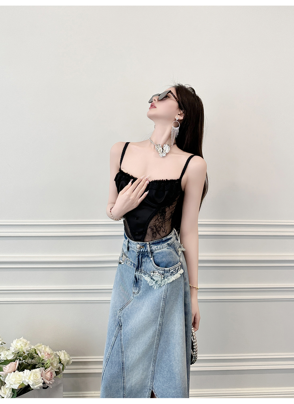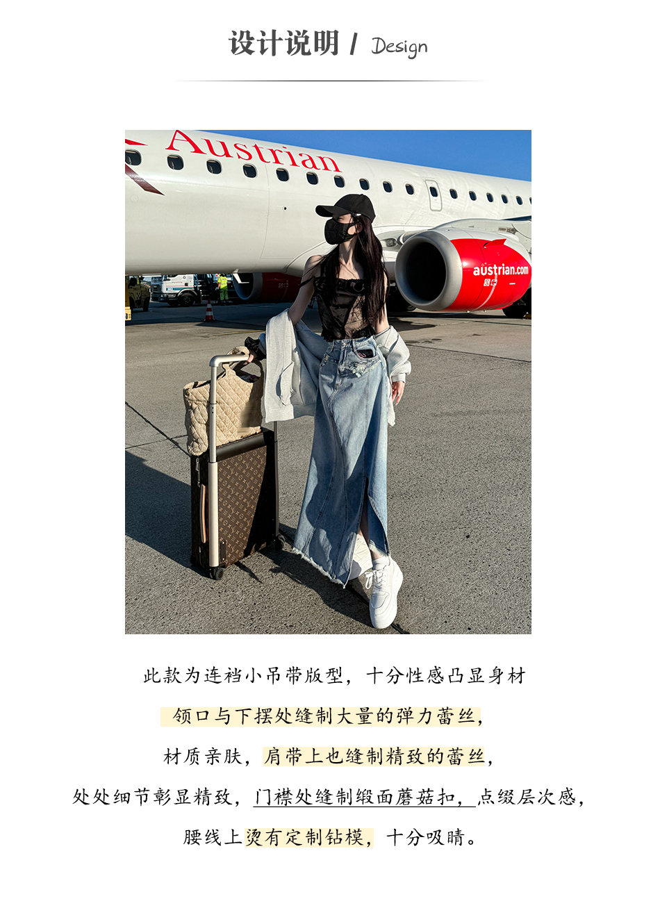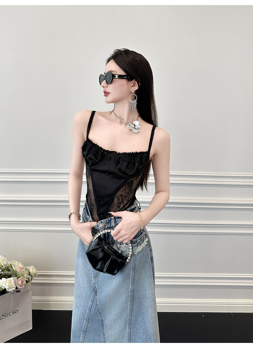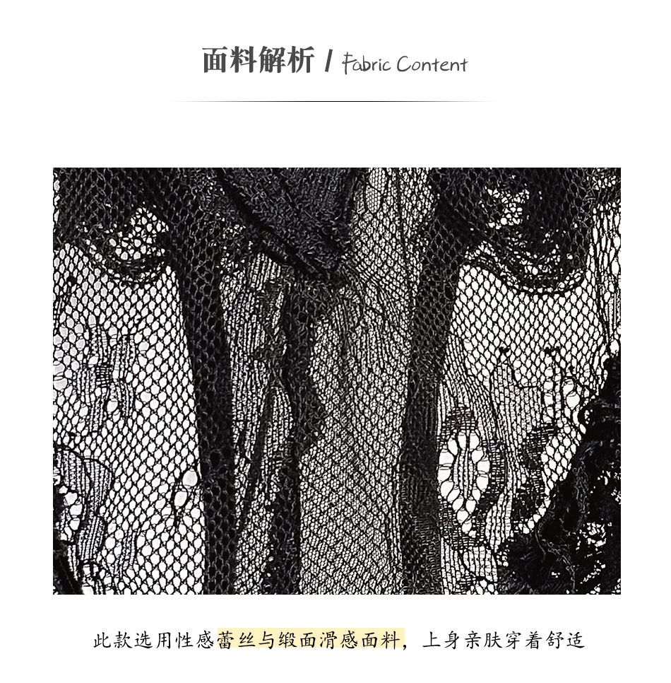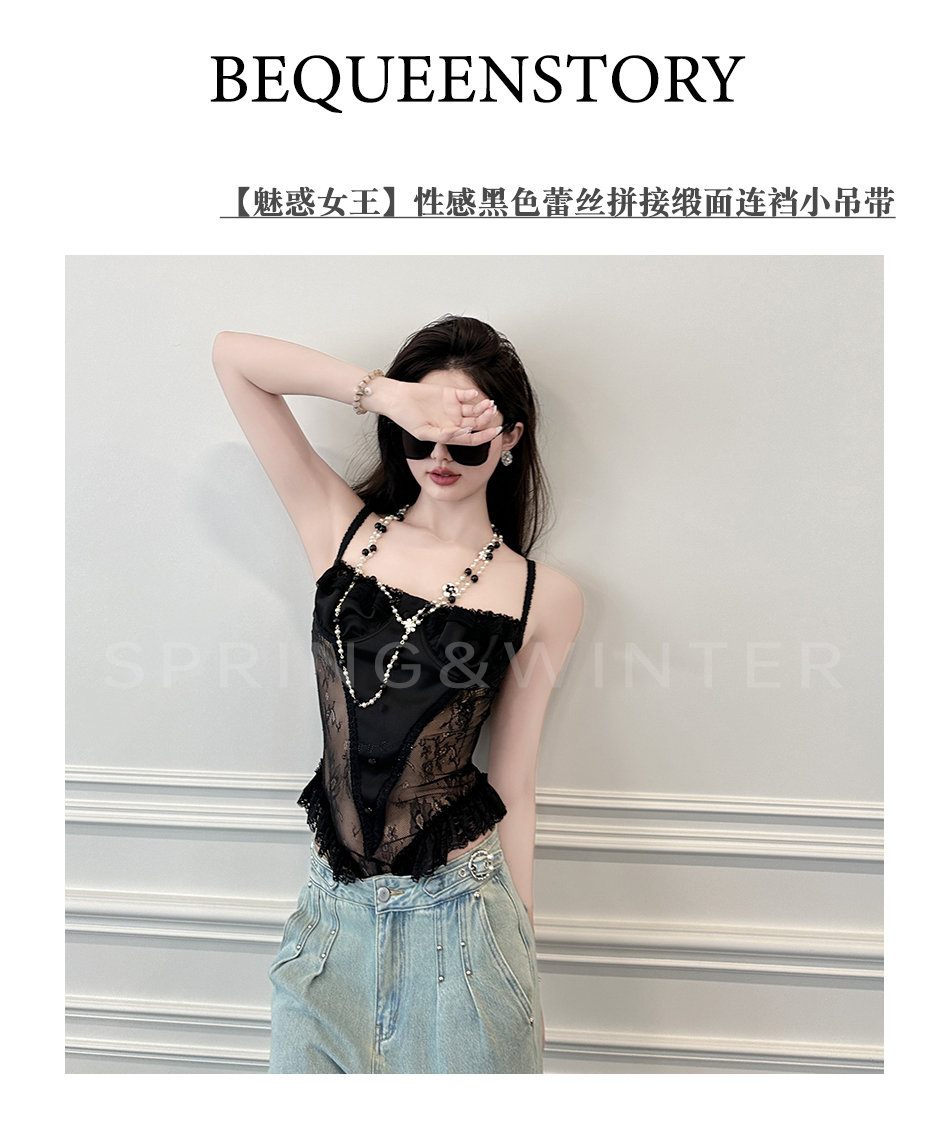 BeQueenStory【魅惑女王】黑色弹力蕾丝拼接缎面连裆小上衣