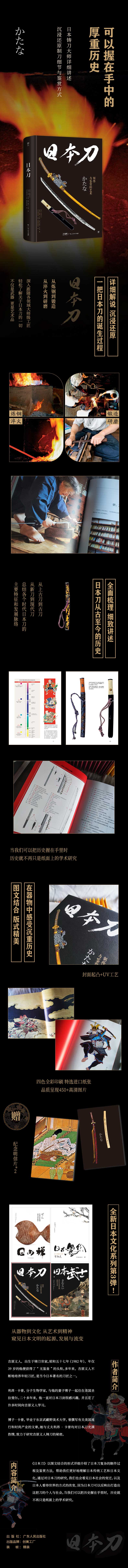 1.全新日本文化系列第3弹!从器物到文化,从艺术到精神,窥见日本文明的起源、发展与流变。2.不仅是武器,更是艺术品。当我们可以把历史握在手里时,历史就不再只是纸面上的学术研究而已。3.深入跟随各领域大师级工匠,从炼钢到锻造、淬火、抛光、研磨,沉浸还原一把日本刀的诞生过程。4.详细解说日本刀的各部位和鉴赏方式,轻松了解关于日本刀的一切。5.全面梳理日本刀从古至今的历史,总结各个时代日本刀的主要特征和发展脉络。6.图文结合,版式精美,多维度还原复杂的制作流程。7.四色全彩印刷,特种超感纸张,高清呈现450+细节图片。8.附赠主题明信片*2,深入领悟制作与鉴赏的艺术。