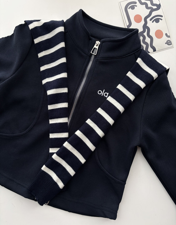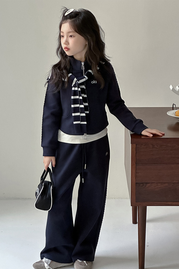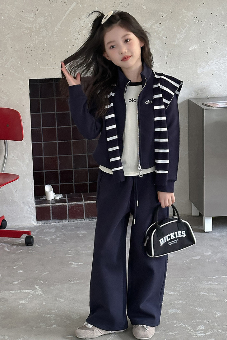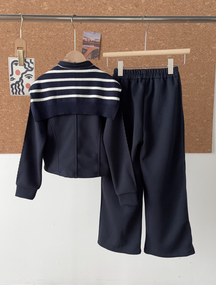 实物无滤镜实拍📷 一套封神!拯救搭配荒的超级救星来了! 再也不用为娃的OOTD头秃! 藏青外套+同色系神裤+灵魂条纹披肩 上身秒变学院风小绅士/韩系小欧尼~ 三件叠穿=气场全开!单穿拆搭=一周7天不重样!