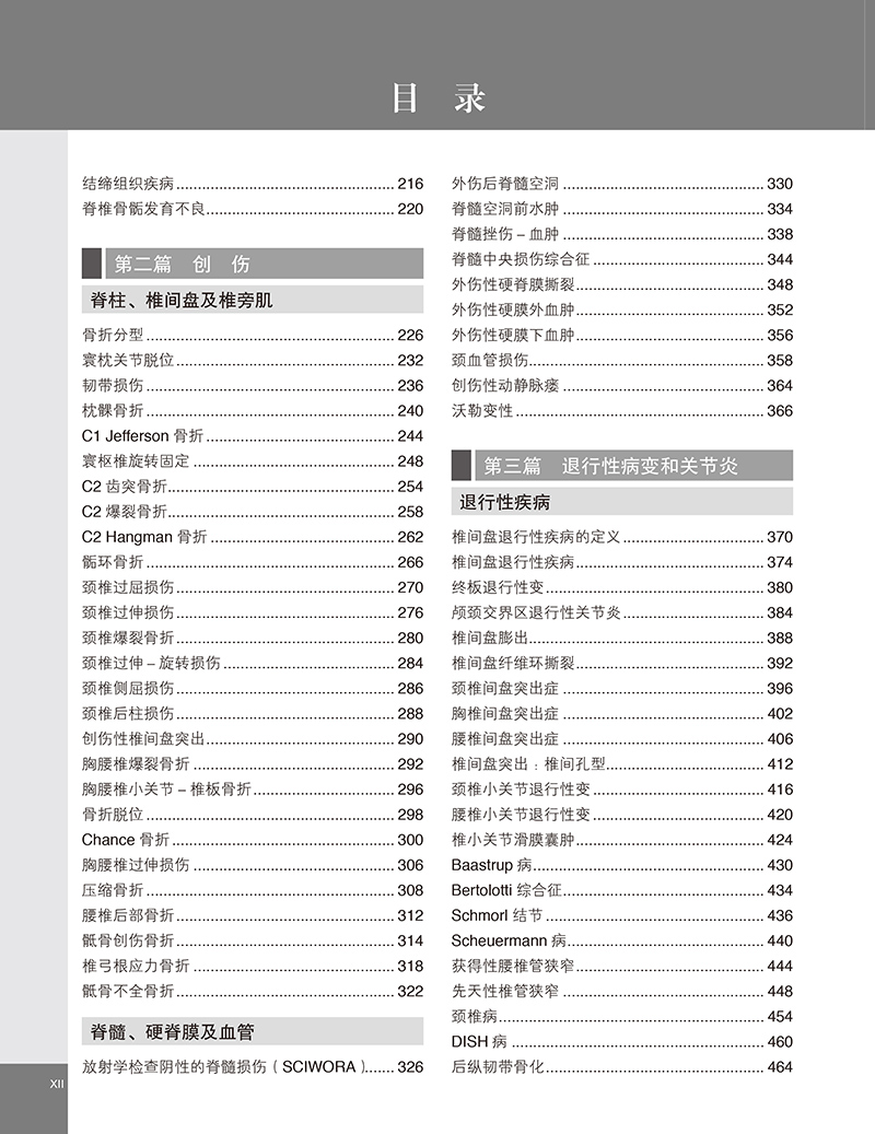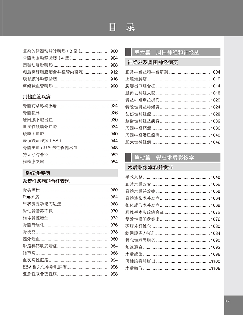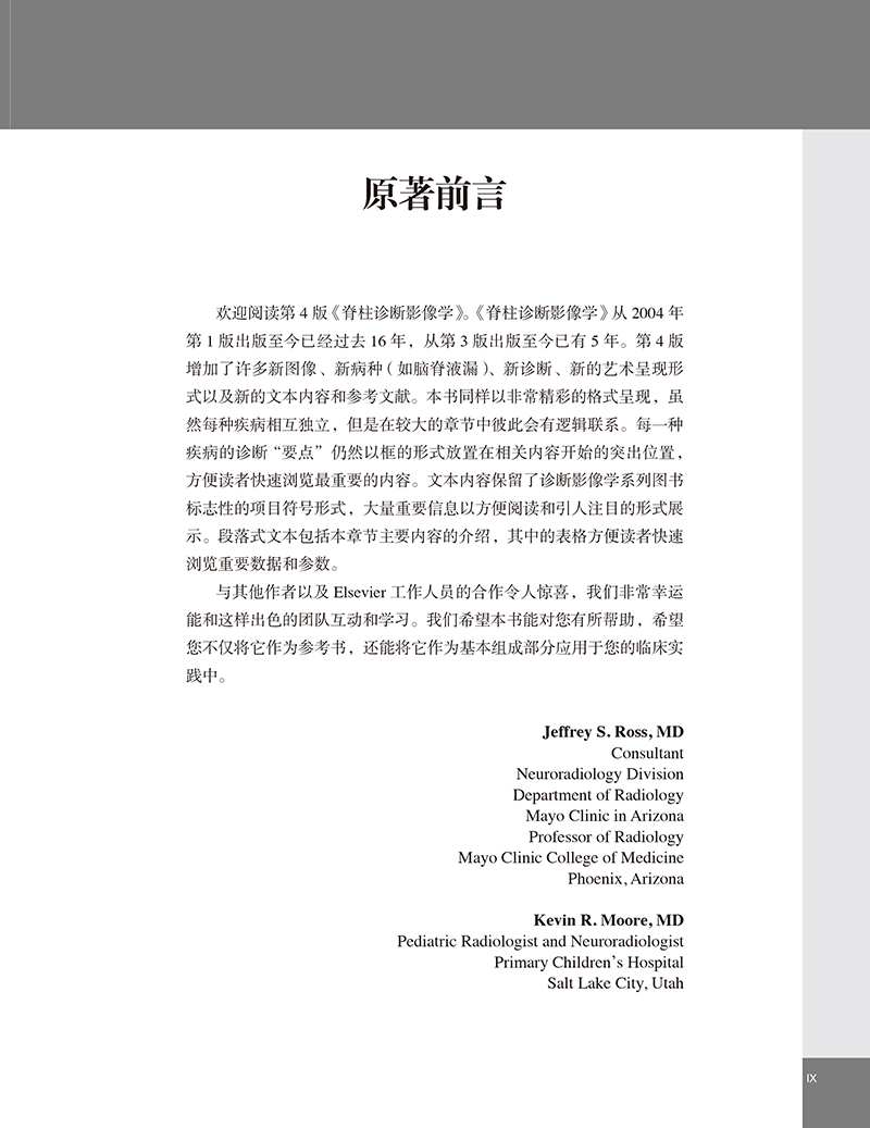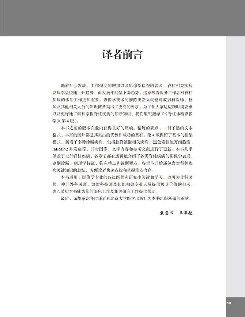 本书由世界著名影像学专家编写而成,这是本书的最新版本,第4版。中译本由北医三院放射科袁慧书主任等国内著名影像学专家担任主译。全书共分七篇17章用简练的文字和大量的影像资料片,详细介绍了400余种脊柱病变,内容涵盖先天性或遗传性疾病、脊柱侧弯、外伤、退变性疾病、感染和炎性疾病、肿瘤、血管性疾病、周围神经疾病、放化疗术后改变等,几乎囊括所有脊柱病变。对于每种疾病,除了在开始处以列表的形式给出疾病的诊疗要点外,又以简练文字给出了相关病因、病理、诊断要点、成像技术选择和影像特征、治疗和预后等;其中,以较大篇幅比较详细地介绍了各种成像技术的优缺点以及相对每种脊柱病变的*成像技术选择,每种脊柱病变的影像学特征。全书内容实用、全面,图片丰富,文字简练,是影像科、脊柱外科、神经外科等专业的临床医师的必备参考书。