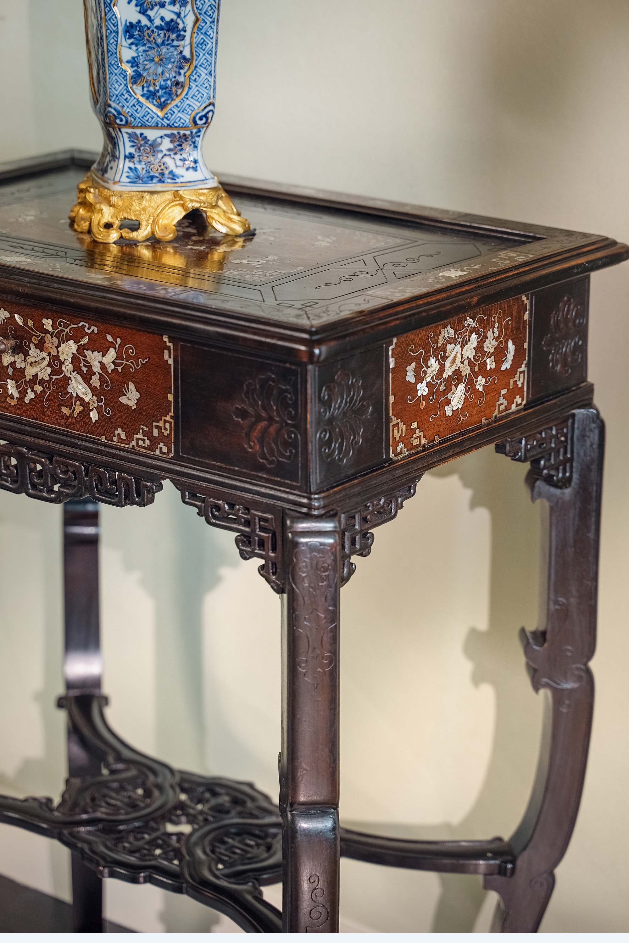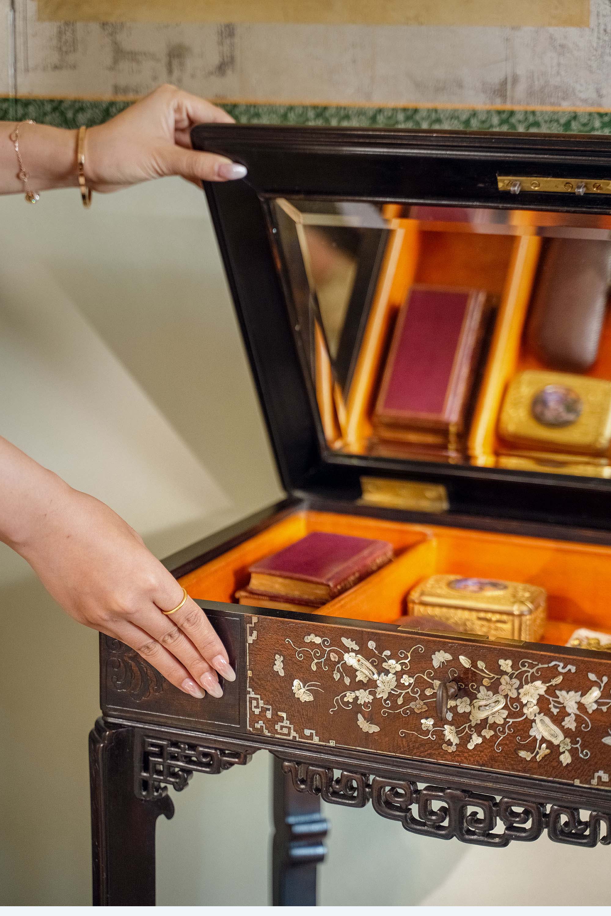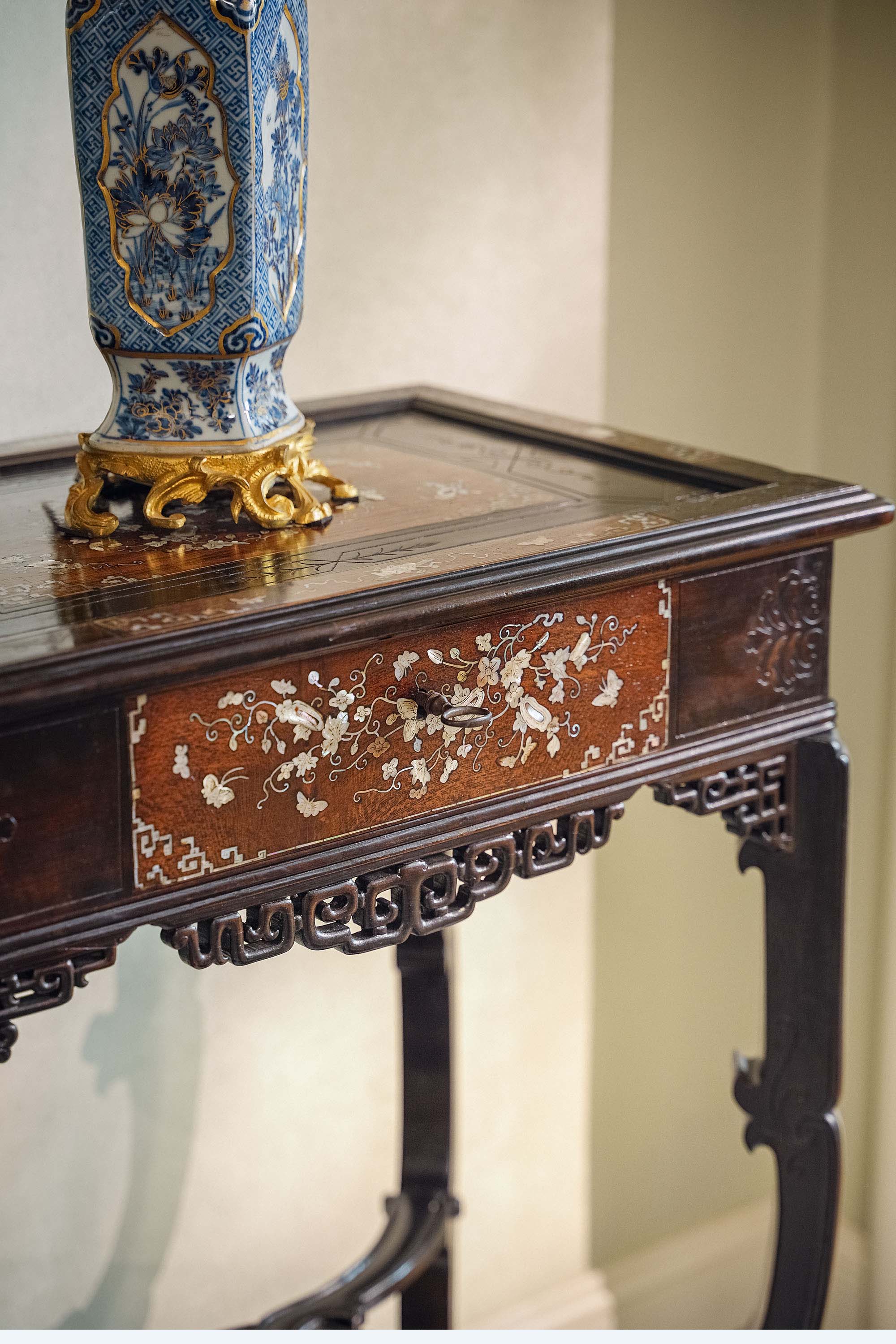 1880年代法国出品东方风格传统花卉主题螺钿镶嵌精雕桤木翻盖带镜抽屉桌