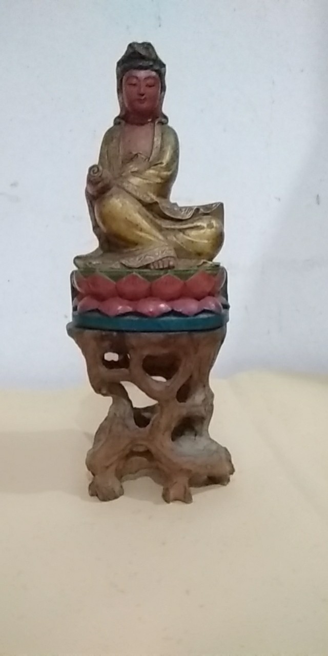 旧藏木雕 持卷观音 漆金 刻工精湛 极具收藏价值 带底座