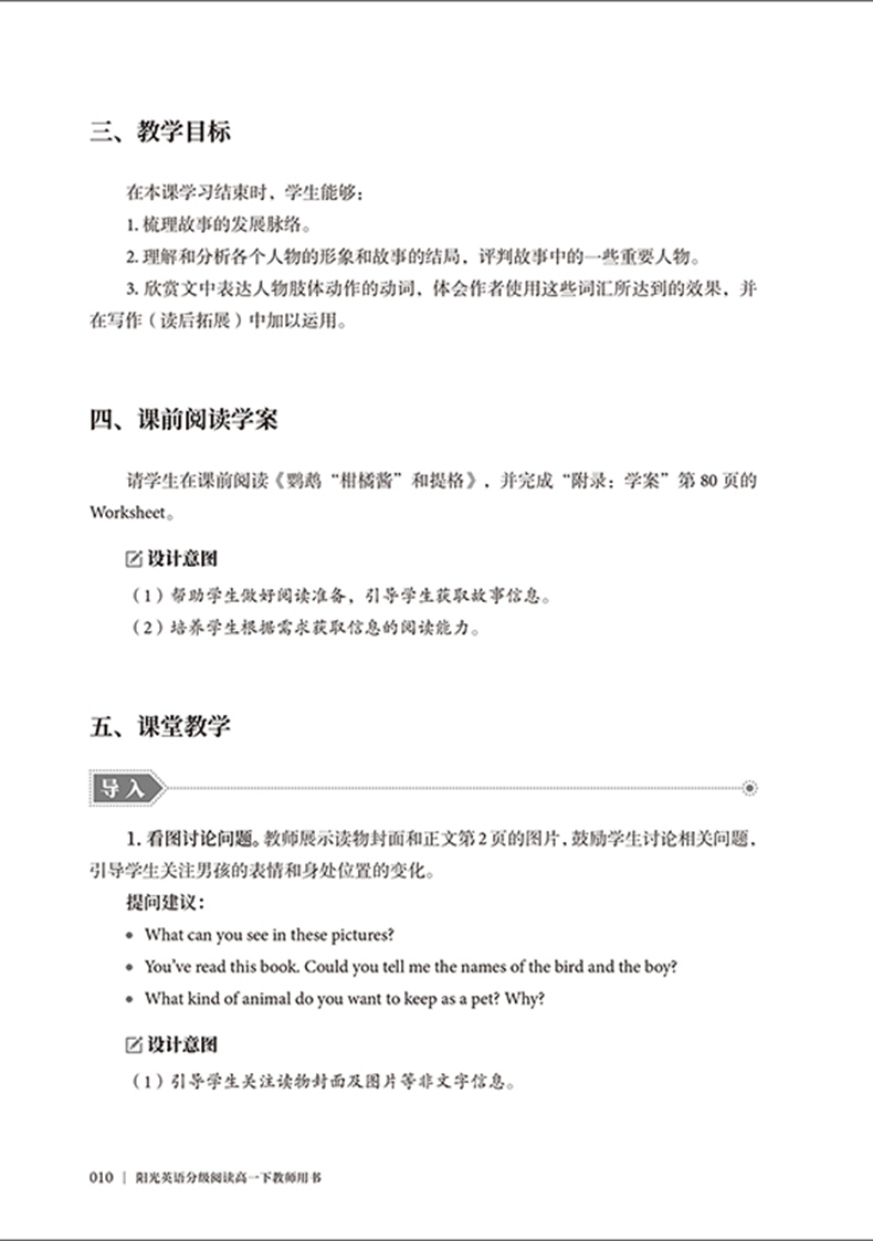 阳光英语分级阅读高一下教师用书》配合阳光英语高一下套装的9册英文读物使用,收录了9个优秀课例,帮助老师上好高一下学期的阅读/读写课。本书由北京师范大学外文学院教授、博士生导师罗少茜老师担任分册主编,优秀一线英语教师编写,为每一本读物撰写了详细的文本分析,为每一个课例设计清晰的思维导图、明确的教学目标、丰富的阅读学案以及具有综合性、关联性和实践性的课堂教学活动。配合使用的英语读物为