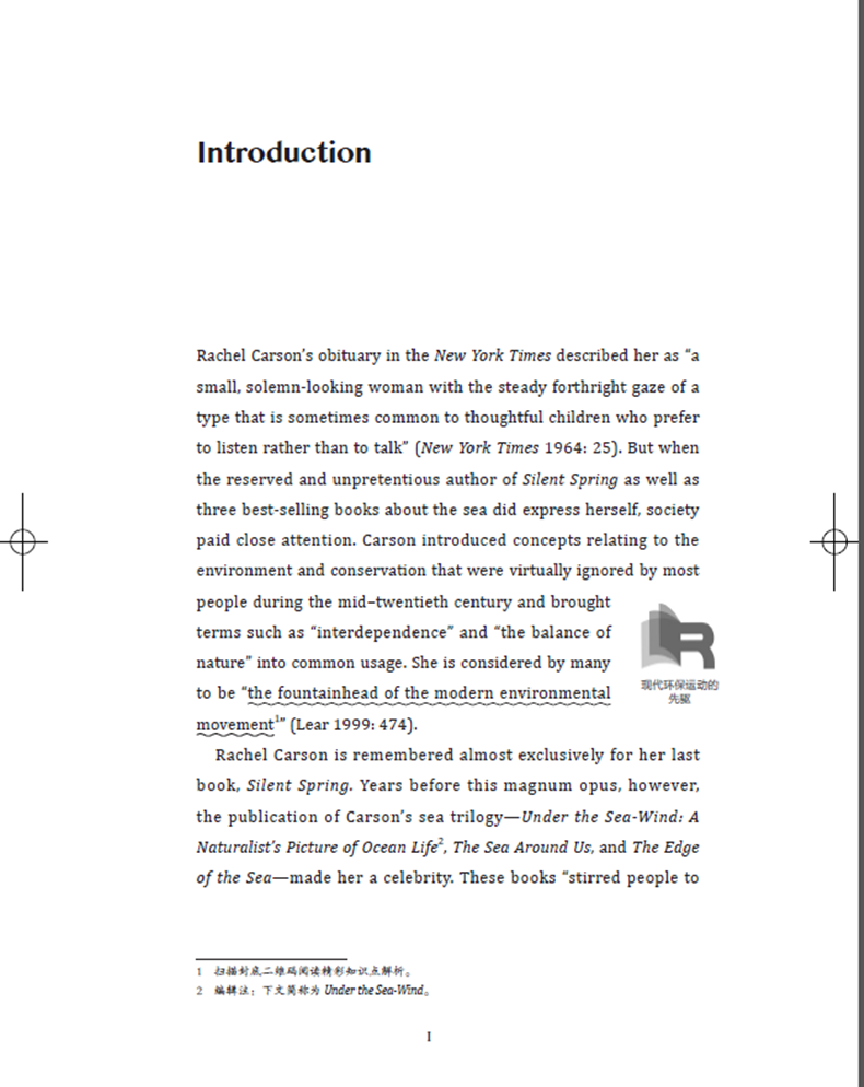 《环保时代的启幕人:蕾切尔·卡逊传》一书中既有原汁原味的英文,又有生动流畅的译文,书中还穿插了许多背景知识拓展,扫描封底二维码即可查看文内精彩知识点解析。蕾切尔·卡逊在逆境中笔耕不辍,完成了“海洋三部曲”,病魔缠身时又以《寂静的春天》敲醒了环境保护的警钟。如果没有蕾切尔·卡逊,环保运动或许很久以后才会发生。