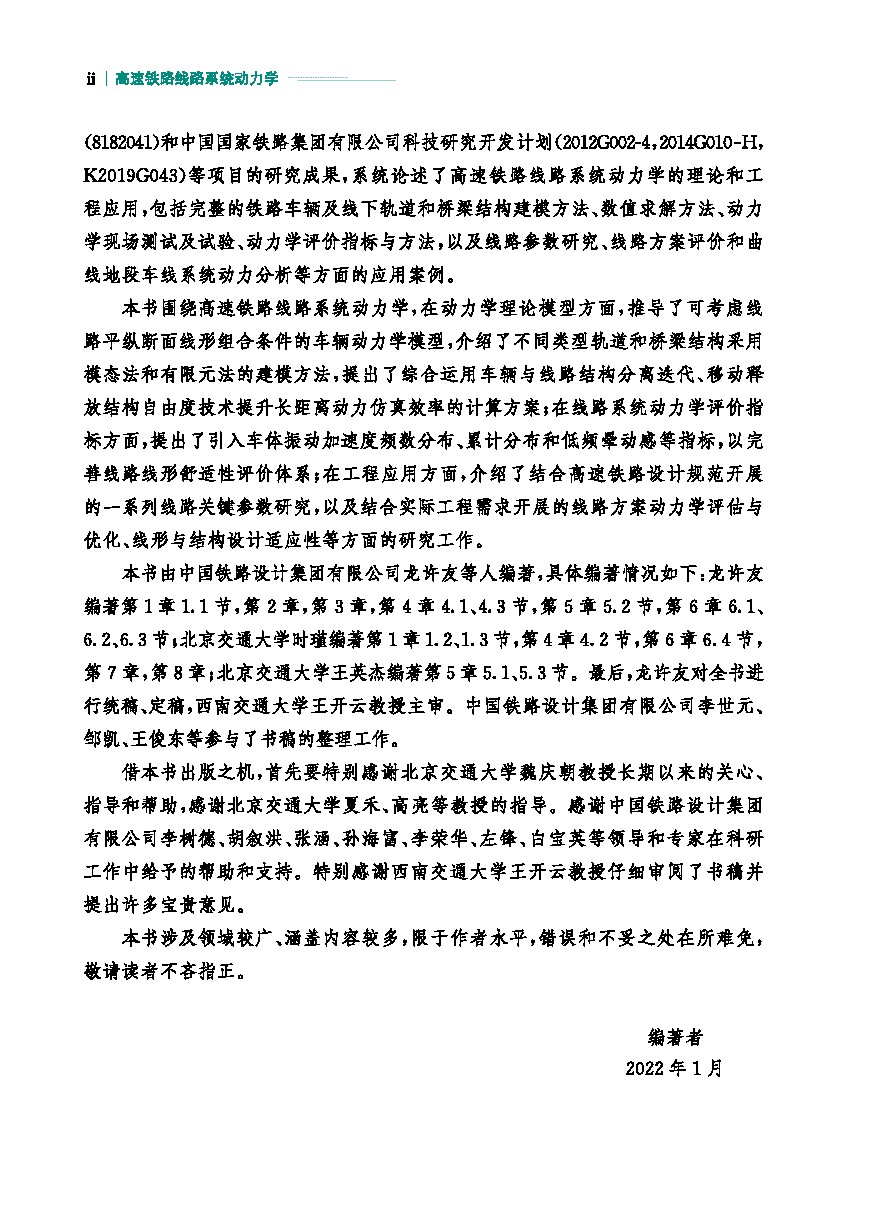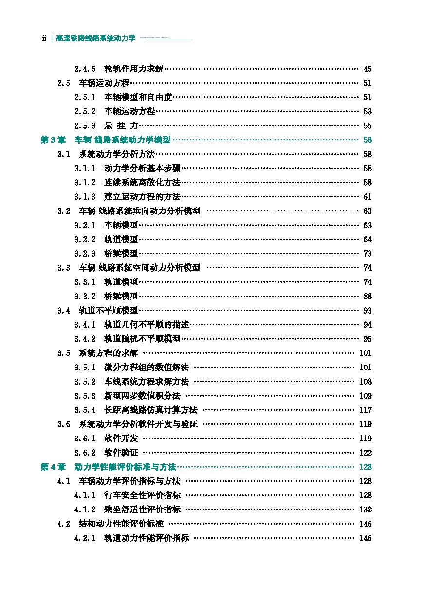 本书内容基于作者在该领域的研究成果及相关工程应用,全面论述了高速铁路线路系统动力学基本理论与工程应用实例。第一部分为动力学基础,论述了该研究领域必要的工程振动、随机振动和多刚体系统动力学等方面的基础知识;第二部分为动力学模型,详细阐述了铁道车辆以及线下轨道和桥梁结构的动力学建模方法、动力学性能评价标准和方法、现场动力学测试方法以及动力分析软件的开发。第三部分为工程应用,分析了铁路线路系统动力学在线路线形参数研究、线路方案动力学评估与优化以及轨道和桥梁结构动力分析等方面的应用。