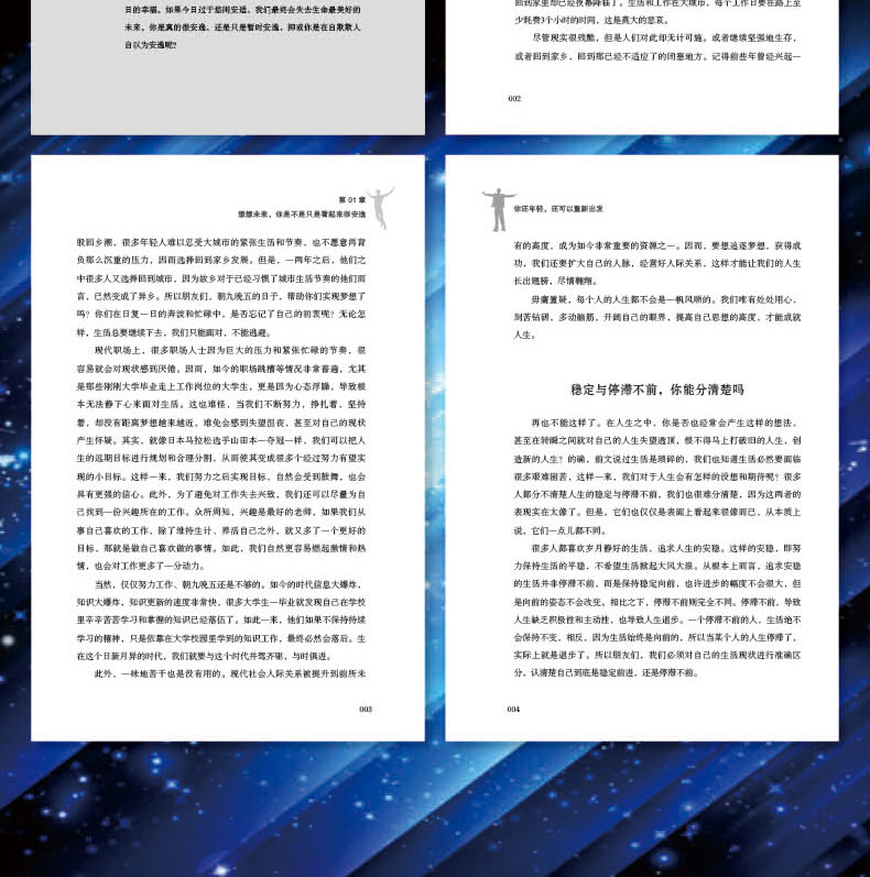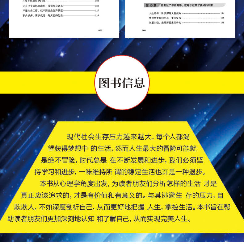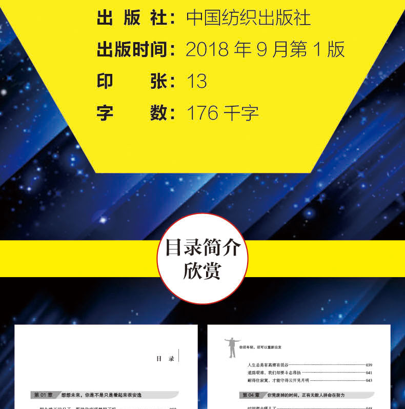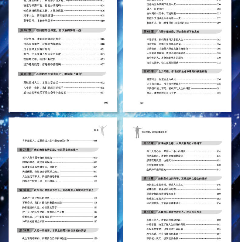 朝九晚五的日子,帮助你实现梦想了吗002稳定与停滞不前,你能分清楚吗 004使你激情燃烧的工作,才能点燃你 006对于人生,要常想常规划 008勤于思考,才能善于思考 010坚持努力,才能得到命运的善待 016拼尽全力地活,让世界为你喝彩 018这个世界上没有后悔药 021努力,才是面对人生应有的态度 023在磨难之中,我们不断成长 025世界越是残酷,你越要昂挺胸 027勇敢面对人生,才能主宰命运 032人生是一盘棋,我们要成为好棋手 035成功者的青春无不是在奋斗中走过的037人生总是有高潮有低谷 039道路艰难,我们却要斗志昂扬 041耐得住寂寞,才能守得云开见月明 043时间都去哪儿了 048当你的生命只剩下一天 050做人一定要守时 052在时间的长河中,不进则退 055要把今天当成生命中的一天 057超越平凡,你只需要付出1万小时的努力059不管多晚,我们都来得及掌控人生 062选对方向,才能让努力事半功倍 064认清自己,才能限度发掘自身潜力066人生有很多缺憾,我们必须正确对待 068会分享的人,才能拥有更多的朋友 070为自己圆梦,让人生更加圆满 072痛苦时分,你正在全力成长 076还有余力的人,没有权利说放弃 078不要借口能力不足,就放弃与人生的博弈081命运,掌握在我们自己手中 083有梦想的人,总要熬过人生中暗的时刻086每个人都有属于自己的道路 090拥挤的景色,注定是局促的 092笑对生活还是愁对生活,你做主 095天道酬勤,命运也会眷顾努力的人 097人生注定不平凡,我们要拒绝平庸 099你是这个世界上的自己 101不要过于在乎别人的想法 106不断尝试,我们才能找到的出路108扬长避短的人生,必然绽放异彩 111对于自己的人生之路,要做到心中有数112唤醒机会,让它们接踵而至 11510年后的你将会如何 117