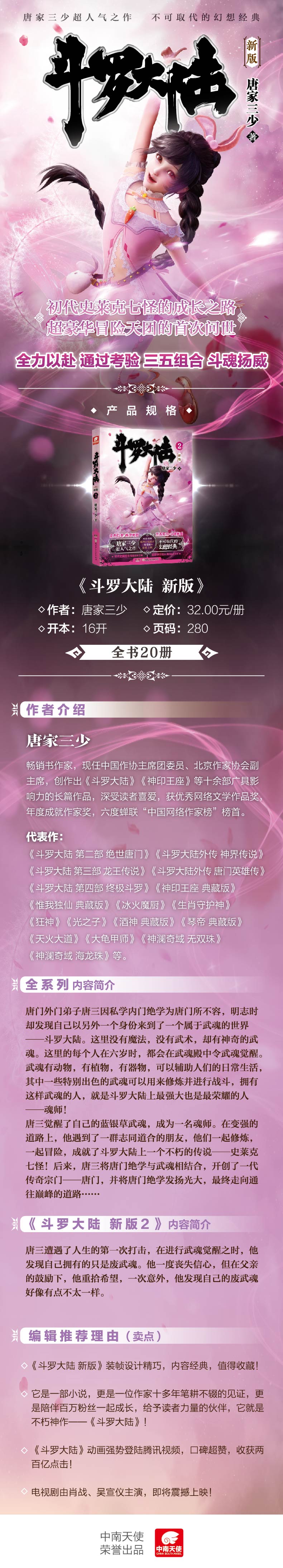 《斗罗大陆》是起点白金作家唐家三少的一部长篇玄幻小说,在起点中文网连载以来获得惊人超高点击量,多次登上月票榜榜首,人气、口碑双丰收,堪称唐家三少影响力和代表性兼备的小说之一。唐家三少在《斗罗大陆》中首创魂师、魂环、魂技等概念,设定魂士、魂师、魂尊、魂王……乃至魂斗罗、封号斗罗的升级体系,奠定了其作品热血、少年、冒险的正能量风格和基调。随着改编漫画的广泛传播,《斗罗大陆》在青少年人群中人气暴涨,成为青少年中影响力、人气双高的作品之一,是唐门粉丝心中的玄幻圣经!全书主要讲述:唐门外门弟子唐三因偷学内门绝学为唐门所不容,跳崖明志时反而以另外一个身份来到了另一个世界—— 一个属于武魂的世界,名叫斗罗大陆。这里没有魔法,没有斗气,没有武术,却有神奇的武魂。这里的每个人,在自己六岁的时候,都会在武魂殿中令武魂觉醒。武魂有动物,有植物,有器物,可以辅助人们的日常生活。其中一些特别出色的武魂可以用来修炼并进行战斗,这个职业是斗罗大陆上极为强大也是极为荣耀的职业——魂师!唐三的蓝银草武魂在这个世界中觉醒,在变强的道路上遇到了一群志同道合的朋友,他们一起修炼,一起冒险,成就了斗罗大陆上一个不朽的传说——史莱克七怪!唐三将唐门绝学与武魂相结合,开创一代传奇宗门——唐门,将唐门绝学发扬光大,最终走向成神的道路……1.新版《斗罗大陆》,设计装帧别出心裁,独具匠心,值得收藏。2.持续五期《斗罗大陆 第四部 终极斗罗》图书广告投放!3.《斗罗大陆 第二部 绝世唐门》、《斗罗大陆 第三部 龙王传说》、《斗罗大陆 第四部 终极斗罗》小说、漫画火爆热售市场热度居高不下,缔造销售神话。4. 《斗罗大陆》在唐门粉丝人群有强大的受众基础,是读者心目中影响力、人气双高的作品。营销计划:★图书联动——《斗罗大陆第四部终极斗罗》连续五期广告宣传。累积庞大阅读群体的《琴帝典藏版》、《酒神典藏版》等产品广告海报宣传推广。★动画广告宣传——上百亿播放同名动画《斗罗大陆》广告宣传。★刊物联动——《神漫》在刊物上整版宣传。★微信微博联动——唐家三少百万书友会会员微信、百万微博粉丝在线推广,神漫、中南天使官方微信微博滚动式新闻宣传!★门店宣传——全国各级经销商,招贴海报、易拉宝、店旗重点宣传。★《斗罗大陆》电视剧即将上映。肖战、吴宣仪主演,制作班底强大——《庆余年》《大宋少年志》的王倦编剧、《十月围城》《倩女幽魂》的杨振宇导演、《甄嬛传》《赵氏孤儿》的造型指导、《长安十二时辰》的视效指导、《中国合伙人》《武林外传》的艺术总监!