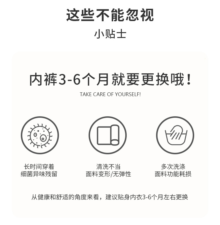 贴身的内裤,一般建议3个月左右就要换一次,这样才能保证个人的身心健康。勤换内裤,呵护自己大健康。