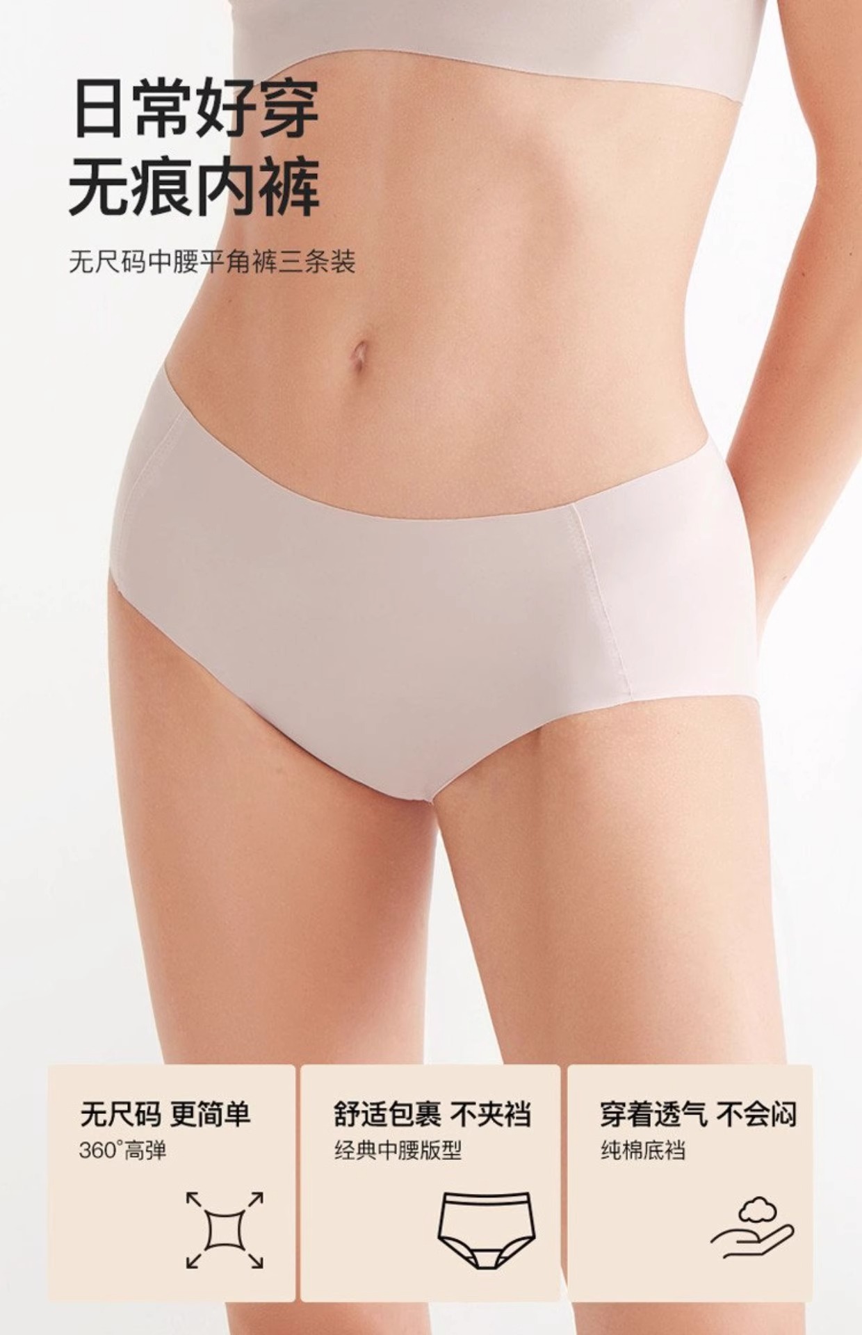 ubras无尺码裸感超薄无痕中腰平角裤(三条装) ✅超弹裸感面料,细腻轻柔顺滑,舒爽不闷汗 ✅全无痕设计结合进口点胶工艺,真隐形真无痕 ✅7A级纯棉底裆,水洗150次仍有效抗菌呵护