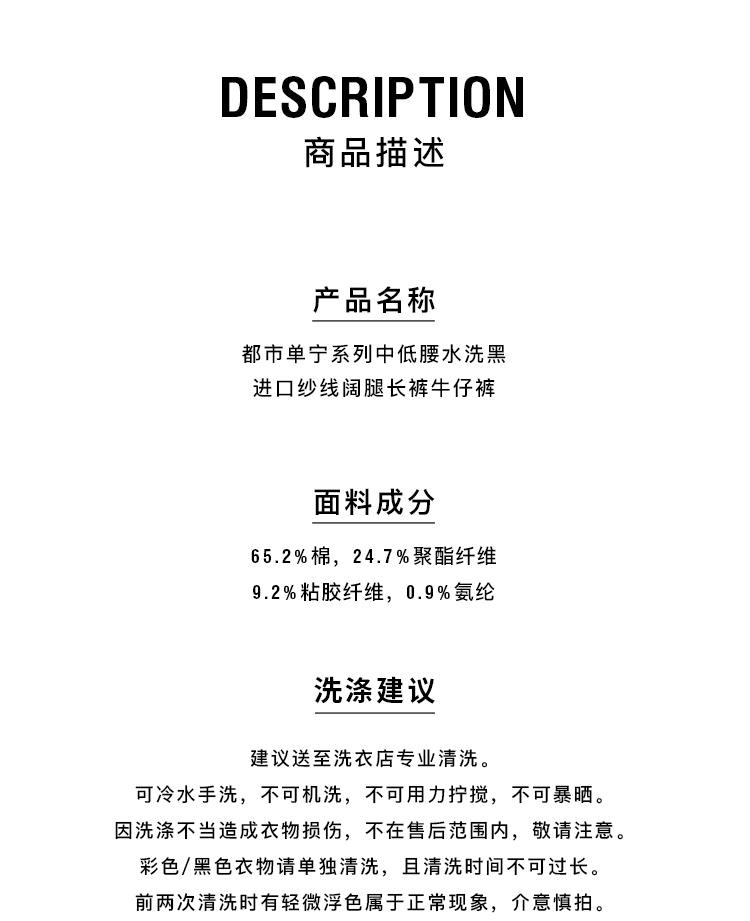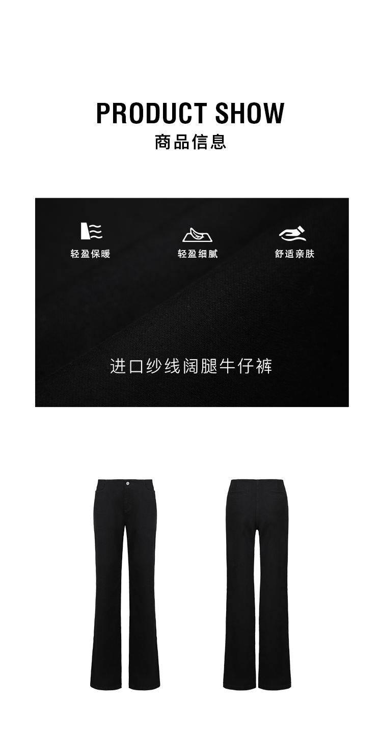 HIDEMI 都市单宁系列中低腰水洗黑进口纱线阔腿长裤牛仔裤