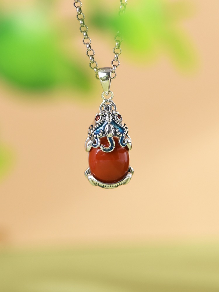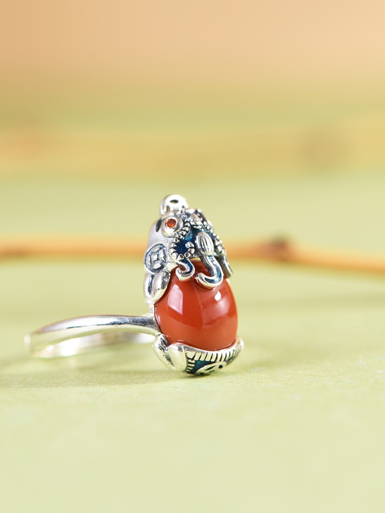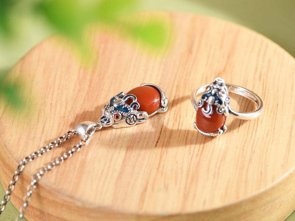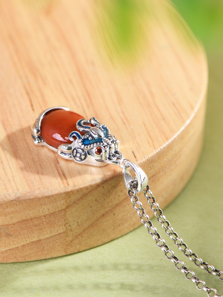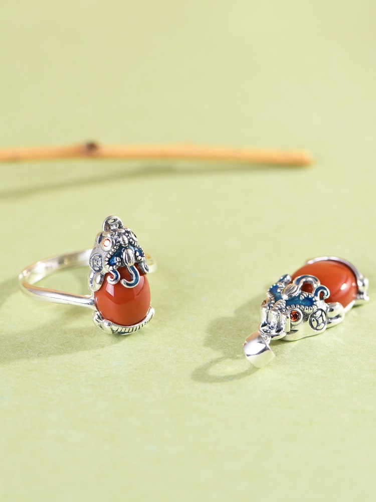 【鸿运貔貅】S925银貔貅烧蓝镶蛋形南红玛瑙瑞兽戒指吊坠【SCH-TRS13773】