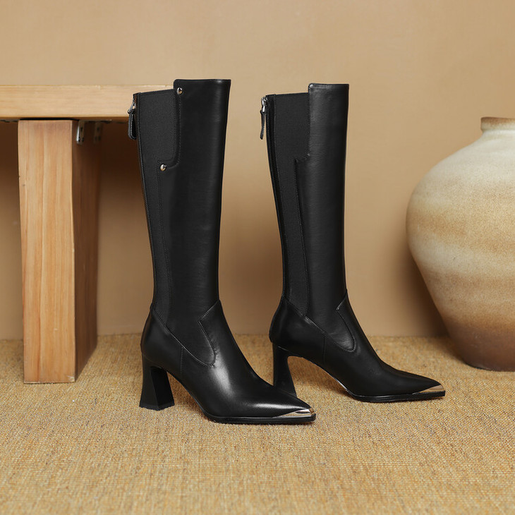 【预售7天】防踢尖头全牛皮骑士靴韩版秋冬新款粗高跟后拉链真皮高筒长靴女LD&6991