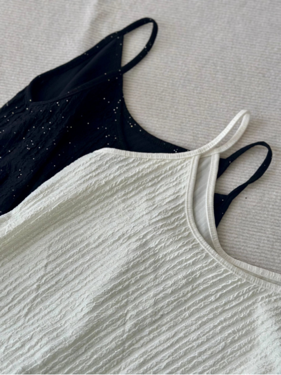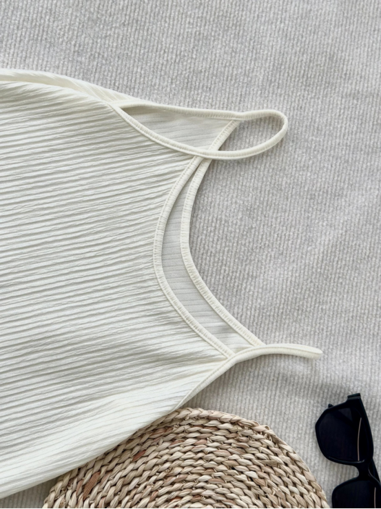 很经典的款式 简约大气,永不过时! 这性价比, 直接闭眼入! ◼肌理感混纺材质、 舒适亲肤、 有弹性 ◼采用特殊褶皱织法,纯色不单调,透气不会粘身 ◼前后小U领设计,露出锁骨显脸小修身 收腰显瘦,很显身材的裁剪 ◼细肩带,内搭外穿都不错 ◼材质舒适, 做工不错, 关键这价格太香了!!