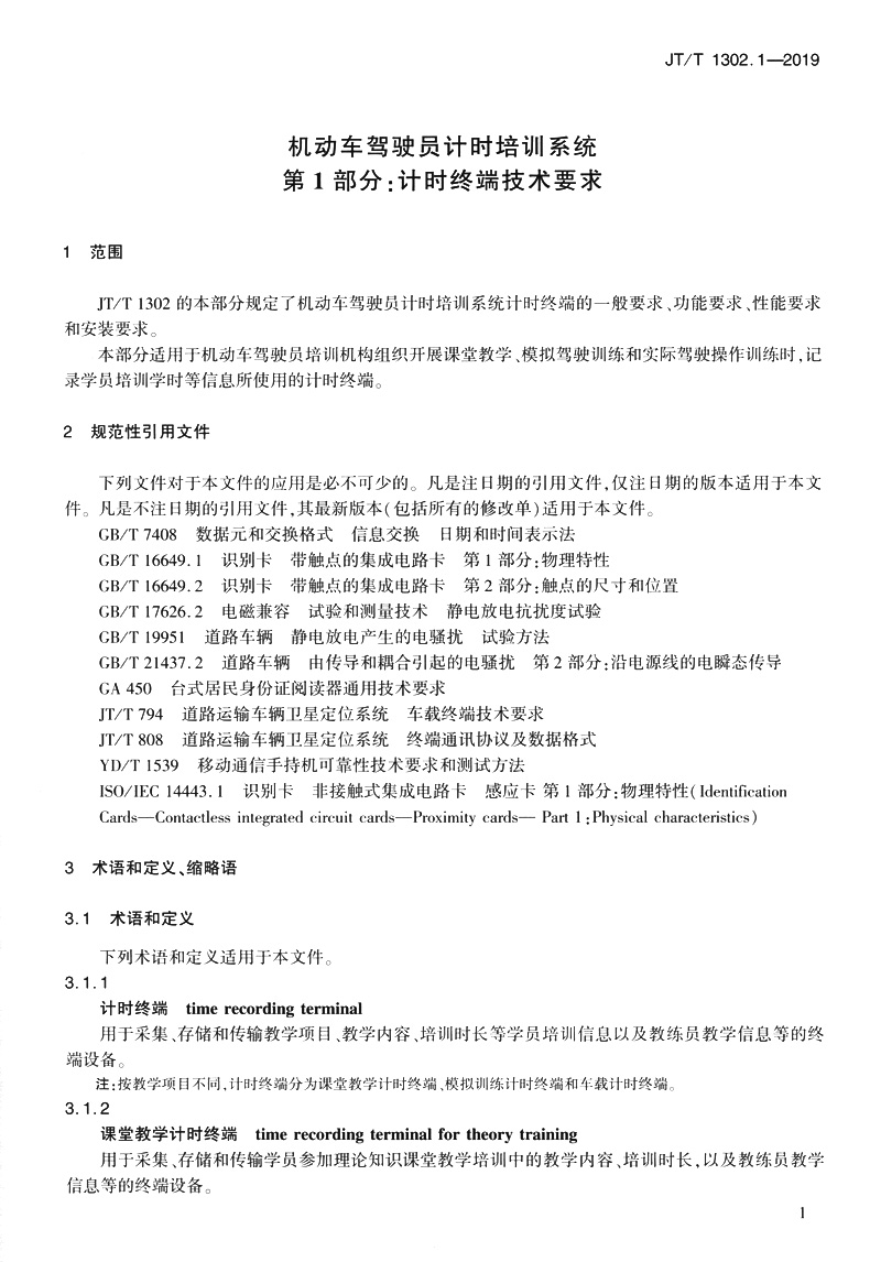 书名:机动车驾驶员计时培训系统 第1部分:计时终端技术要求(JT/T 1302.1—2019)