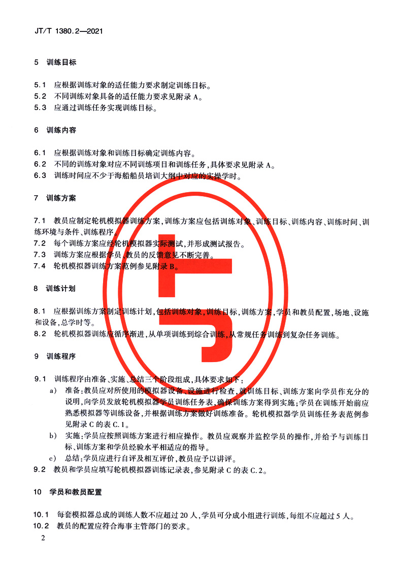 海船船员培训模拟器训练要求 第2部分:轮机模拟器(JT/T 1380.2—2021)