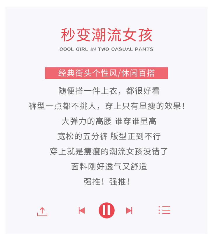 A字版型,巨显瘦,经典街头个性风/休闲百搭,不管什么身材都能轻松驾驭。随便搭一件上衣,都很好看,大弹力的高腰,谁穿谁显高,宽松的五分裤,穿上就是瘦瘦的潮流女孩没错了。