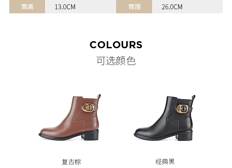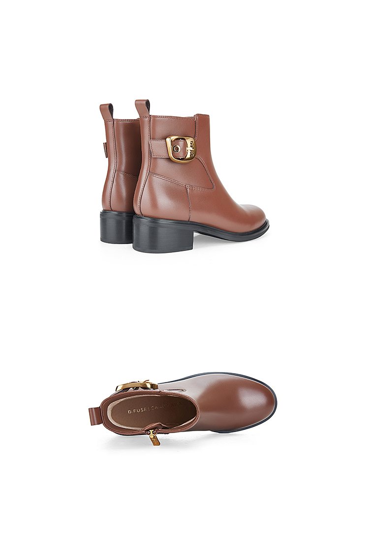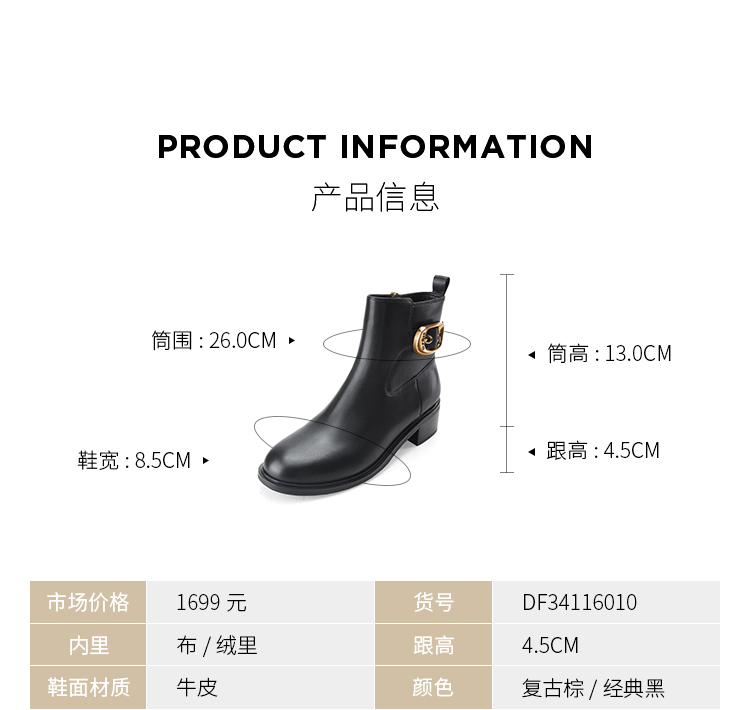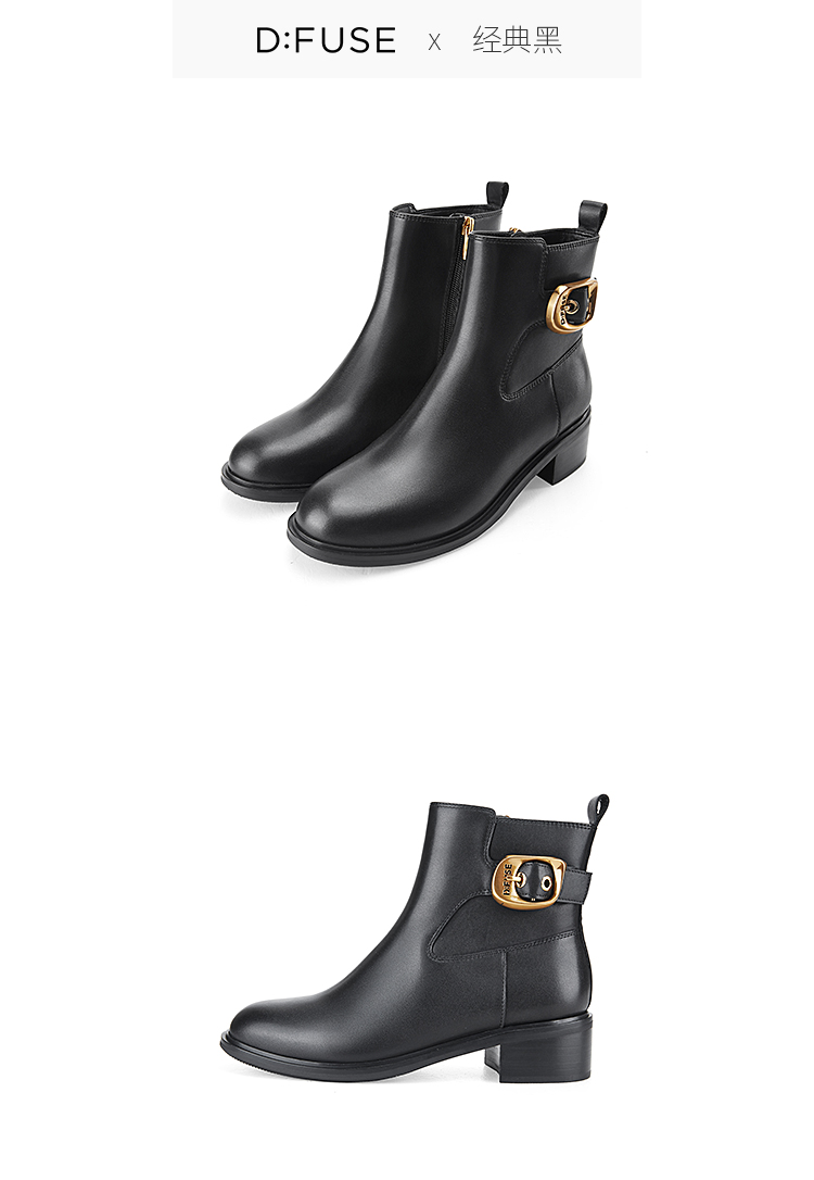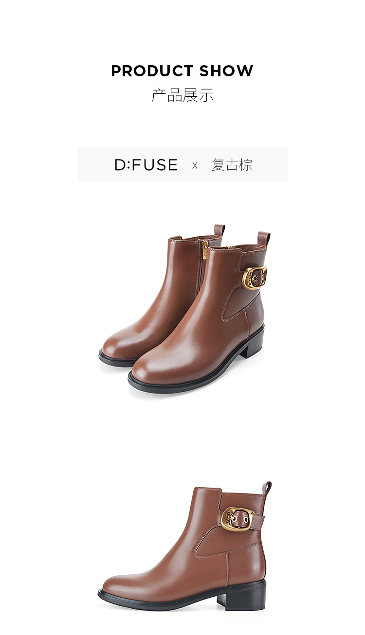 Dfuse迪芙斯冬季新款牛皮圆头休闲复古金扣短靴女DF34116010/DF34118010
