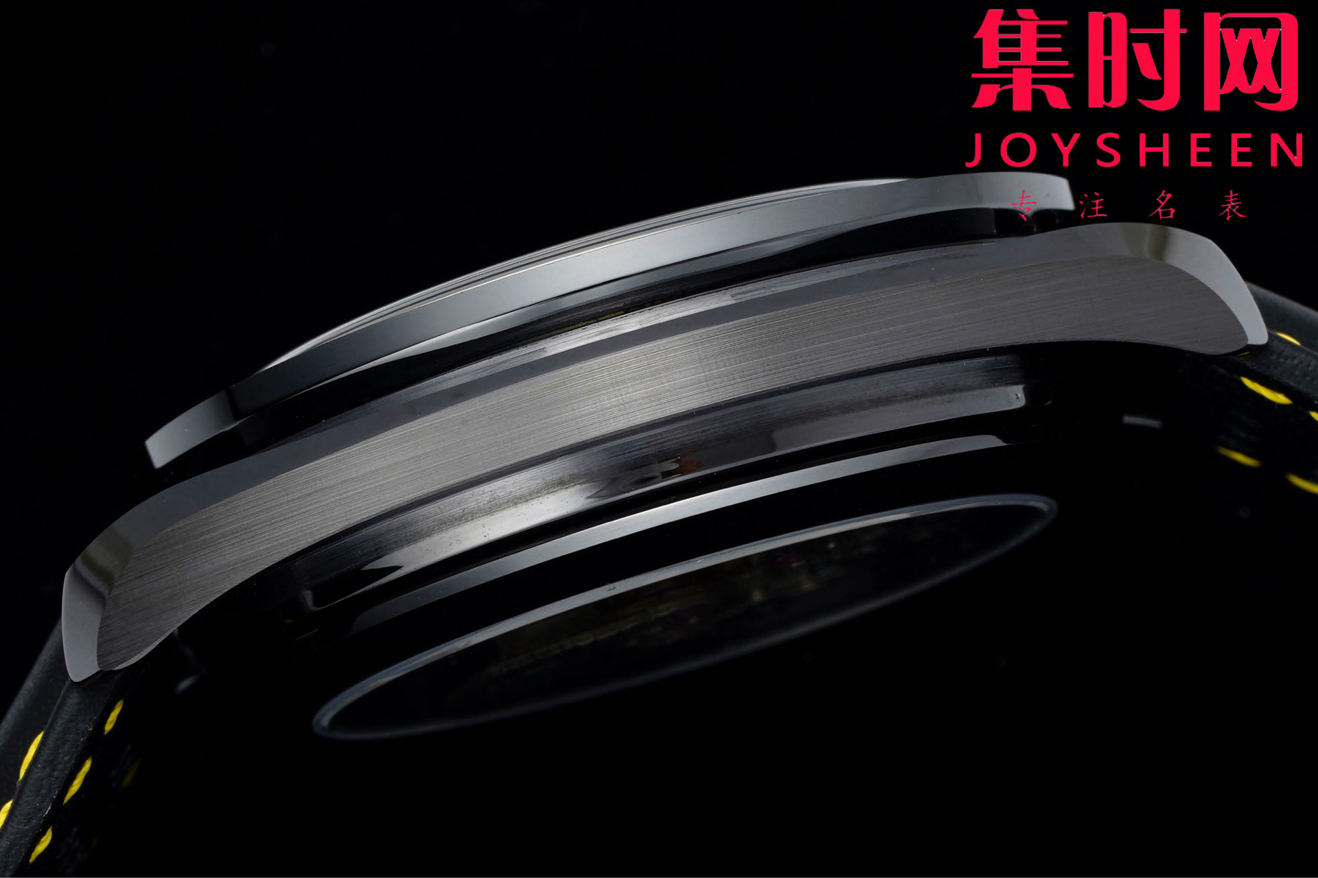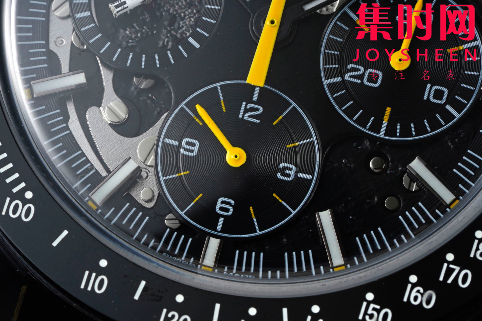 腕表搭配黑色微孔橡胶表带,中间饰有黄色橡胶材质内衬,引人瞩目。整枚腕表采用黑色陶瓷打造而成,中央计时秒针饰以黄色亮漆,表圈饰有激光镌刻的亮白色珐琅测速刻度。小秒盘指针采用五级钛金属材质制成,以别出心裁的"土星5号运载火箭"造型呈现。这一3D立体造型由激光车削技术制成,并由附着白漆、激光烧蚀和激光黑化工艺呈现出了不同的色彩效果。