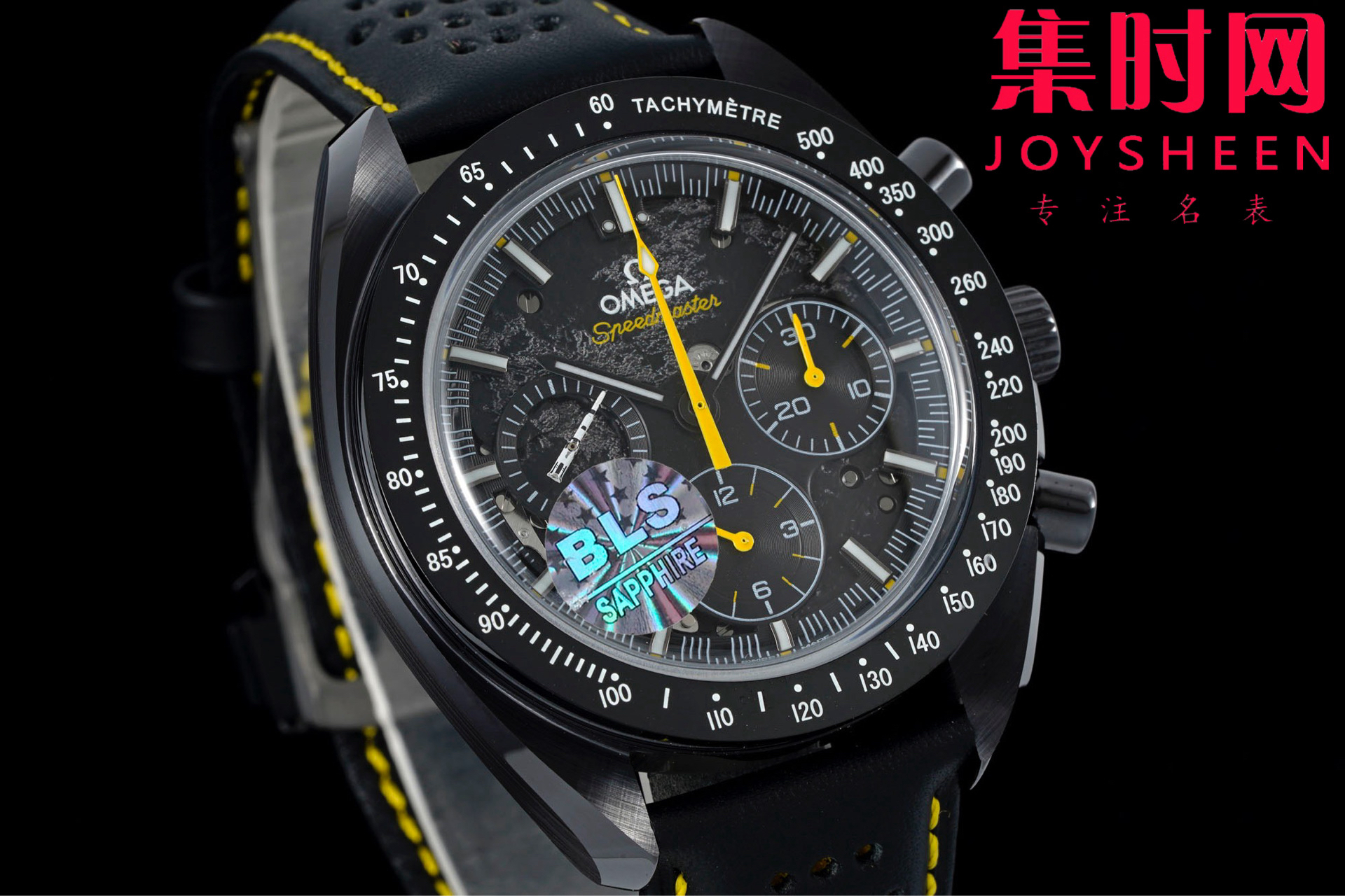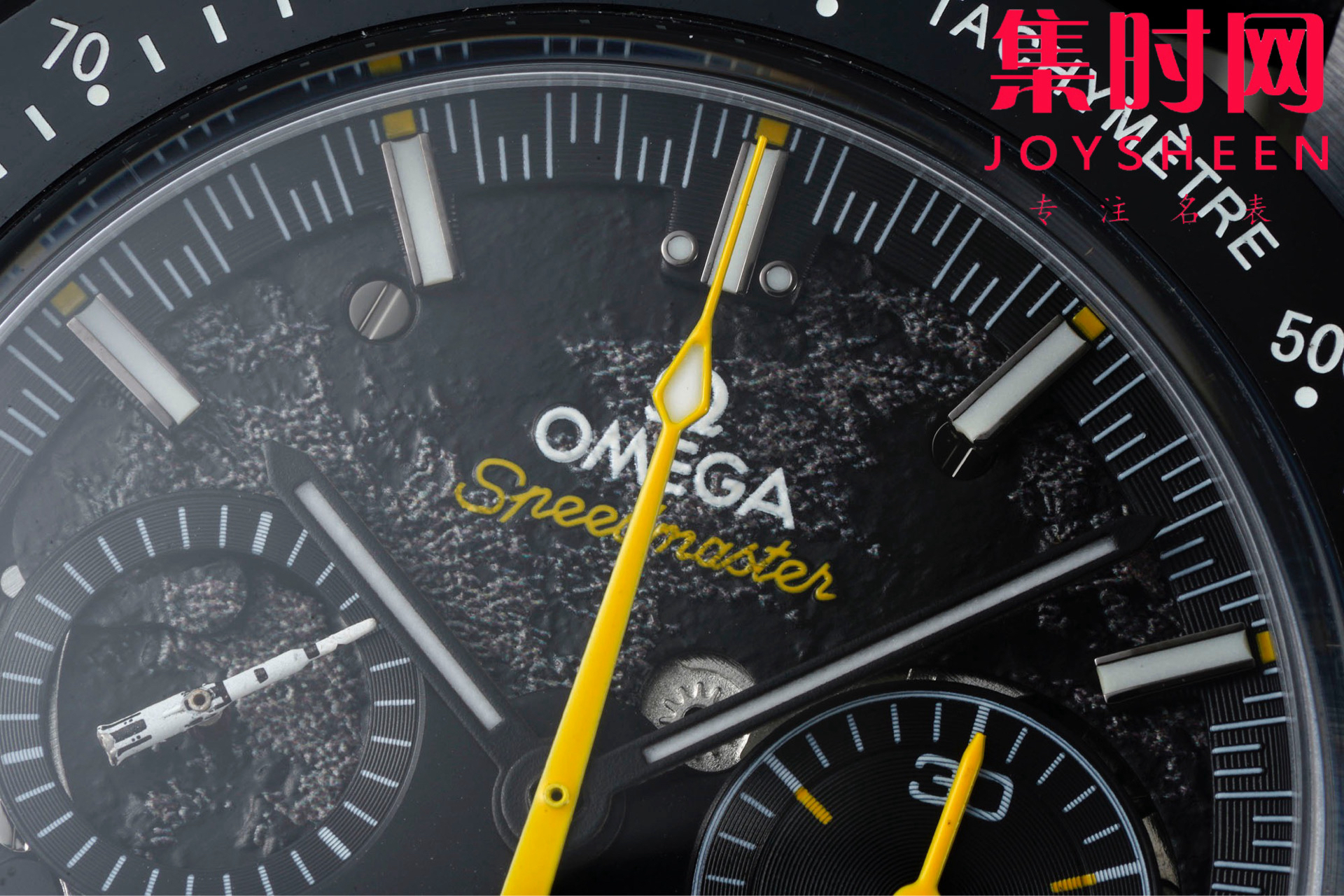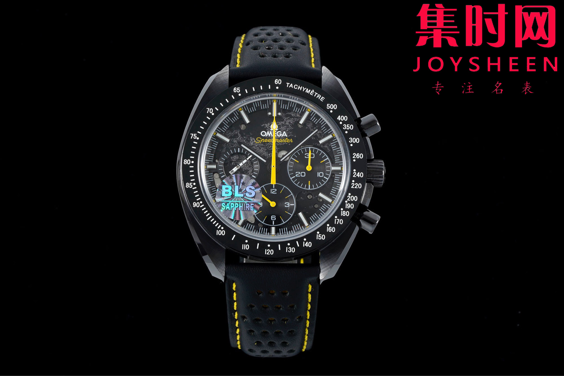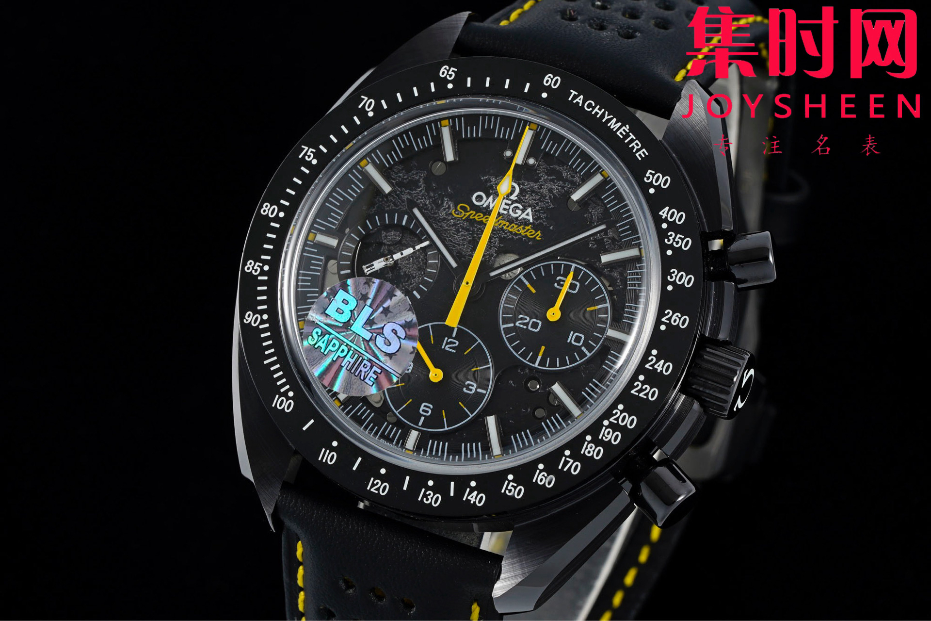 BLS欧米茄 超霸计时系列“月之暗面” 阿波罗8号 小火箭 陶瓷壳 男士腕表 搭载定制Cal.3869手动上链机械机芯,陶瓷是一种通过高温烧制而成的无机非金属物质。这一材质可以用于制造机械性能特殊的高密度腕表部件。陶瓷是消费者在选购腕表时备受青睐的材质之一,这得益于其瞩目而多样的色彩和特殊性能,陶瓷的重量比精钢轻两倍,耐磨、高抗划性、高生化惰性、低过敏性而且无磁性。这款腕表的表壳尺寸为44.25毫米,搭载经过黑化处理的机芯,并通过激光烧蚀技术在机芯夹板呈现月球表面的真实景象,旨在致敬超霸腕表为"阿波罗8号"任务做出的杰出贡献。透过黑色阳极氧化铝的镂空表盘,清晰可见人们从地球可以观测到的月之正面(近地面),表背则展示了仅有宇航员看到过的 " 月之暗面 "(远地面)。
