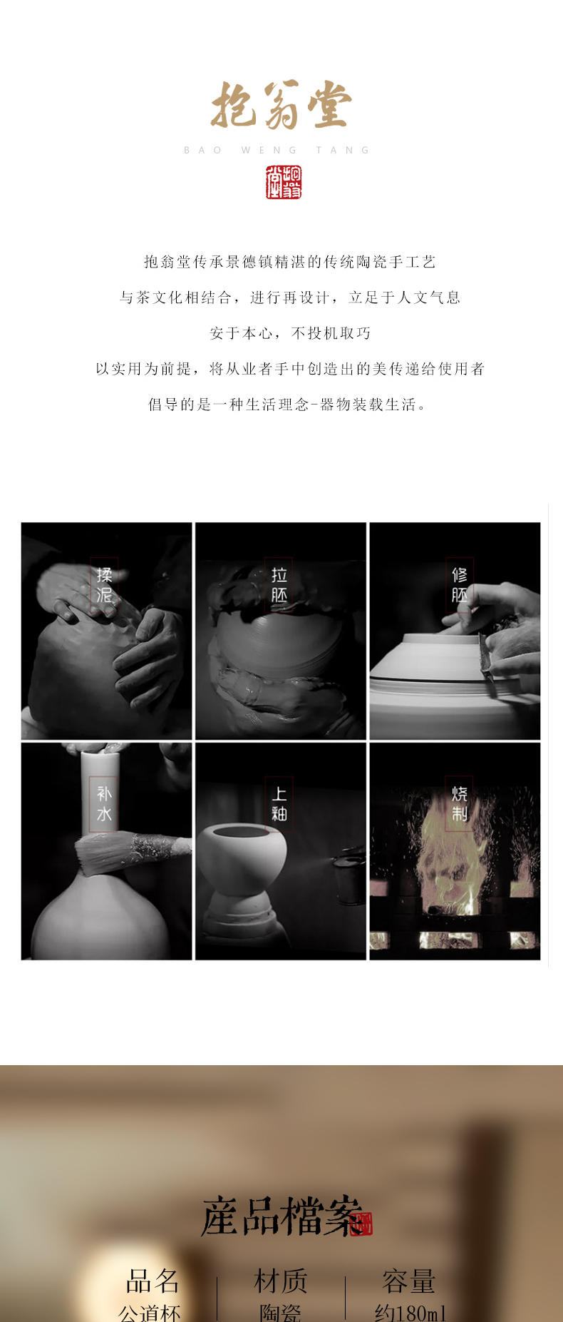 景德镇抱翁堂 素白手拉公杯180cc 陶瓷茶海家用公道杯分茶器