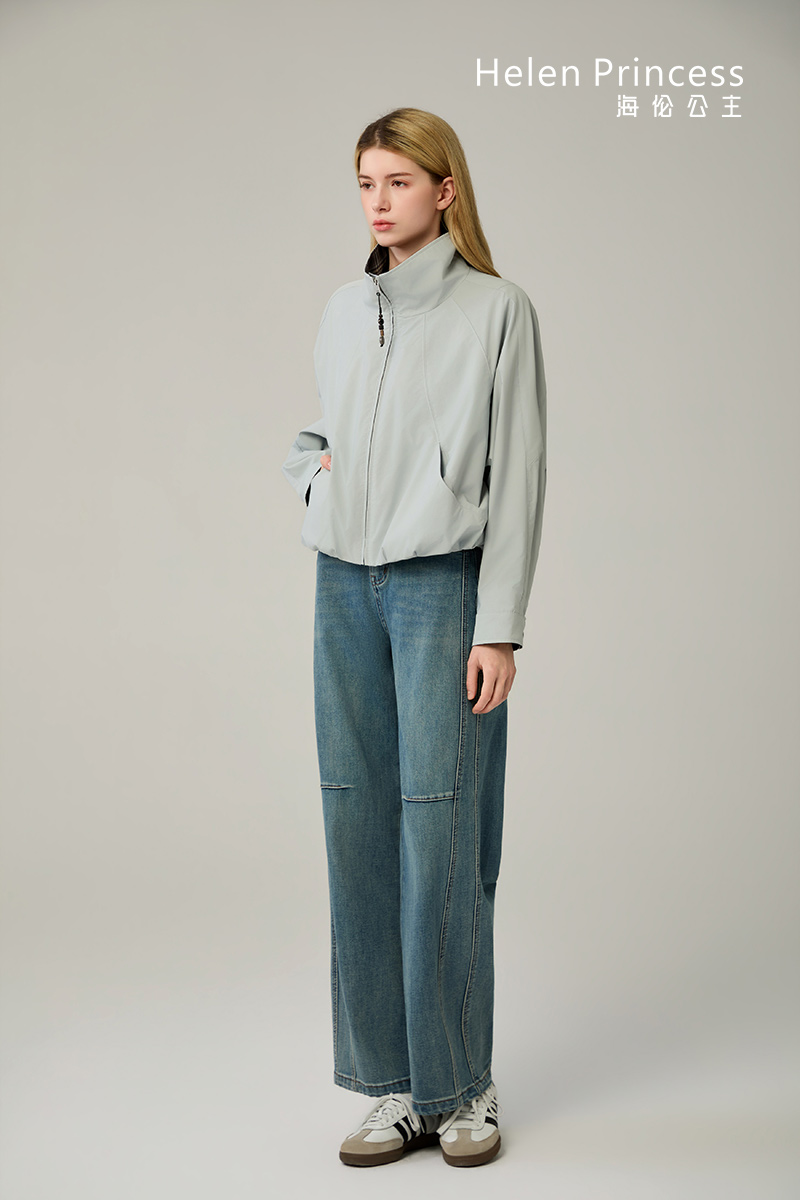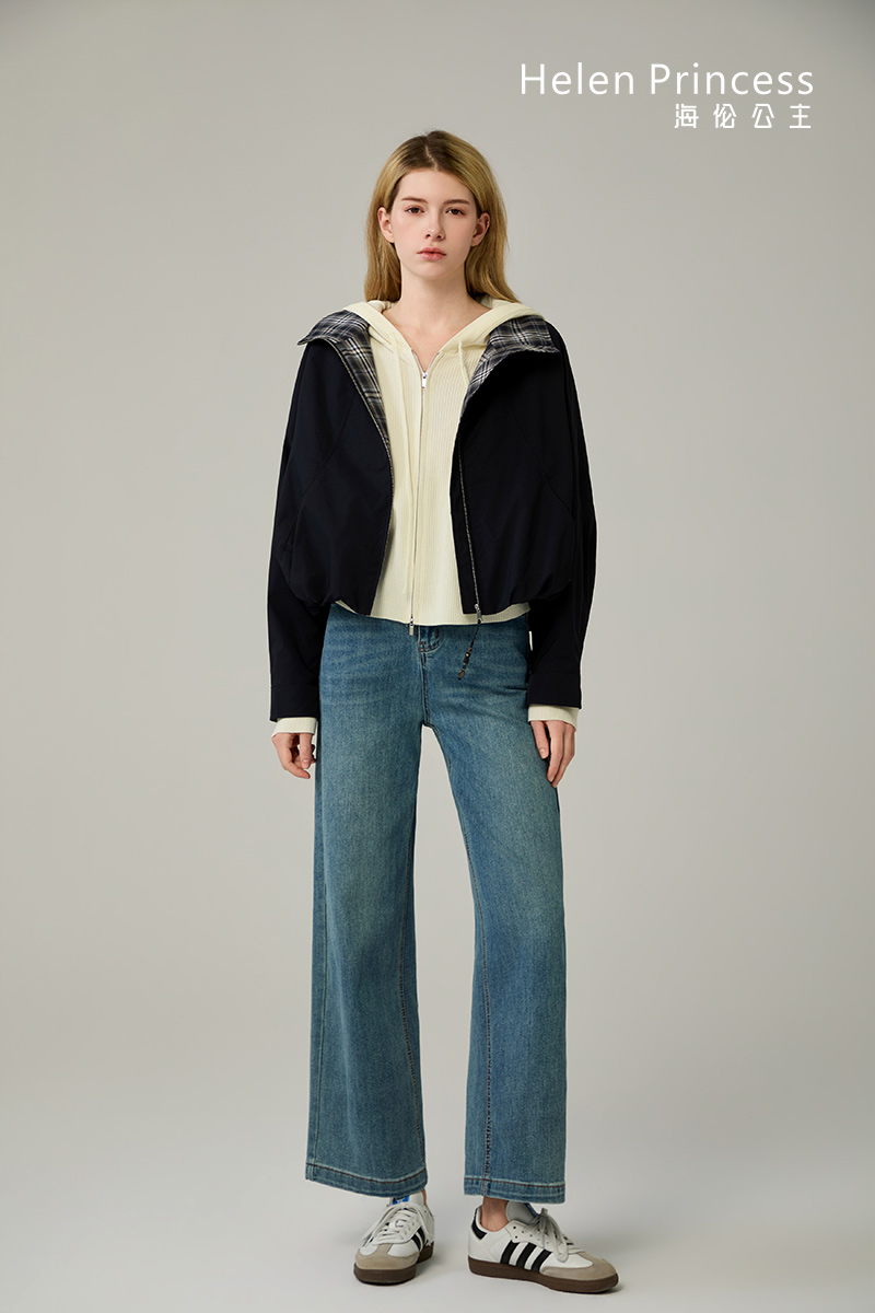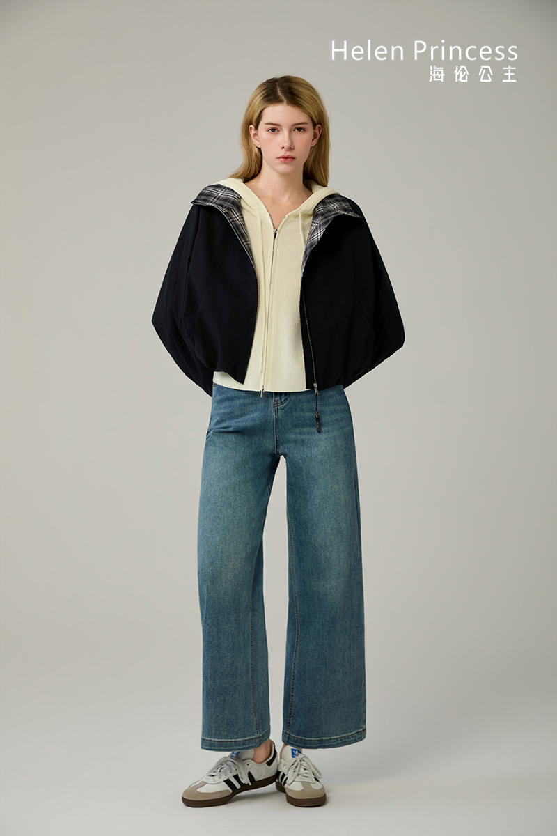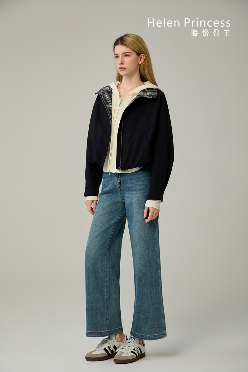 纯色衣身搭配渐变格纹翻领,打破单调色系,增添复古时尚。衣领可翻折或立起,可实现多种搭配风格。利落短款剪裁,优化身材比例,显高显瘦。