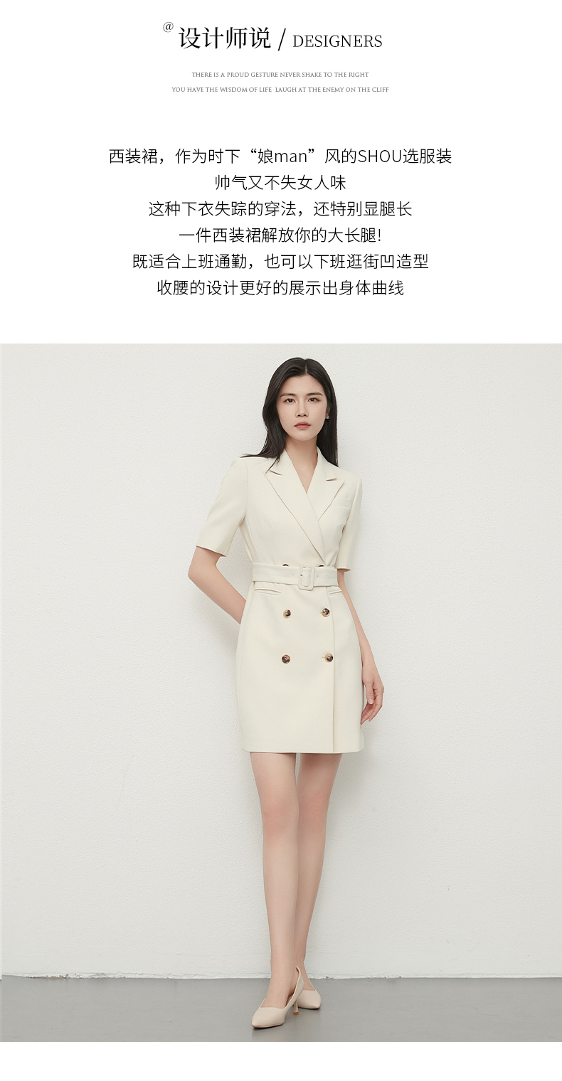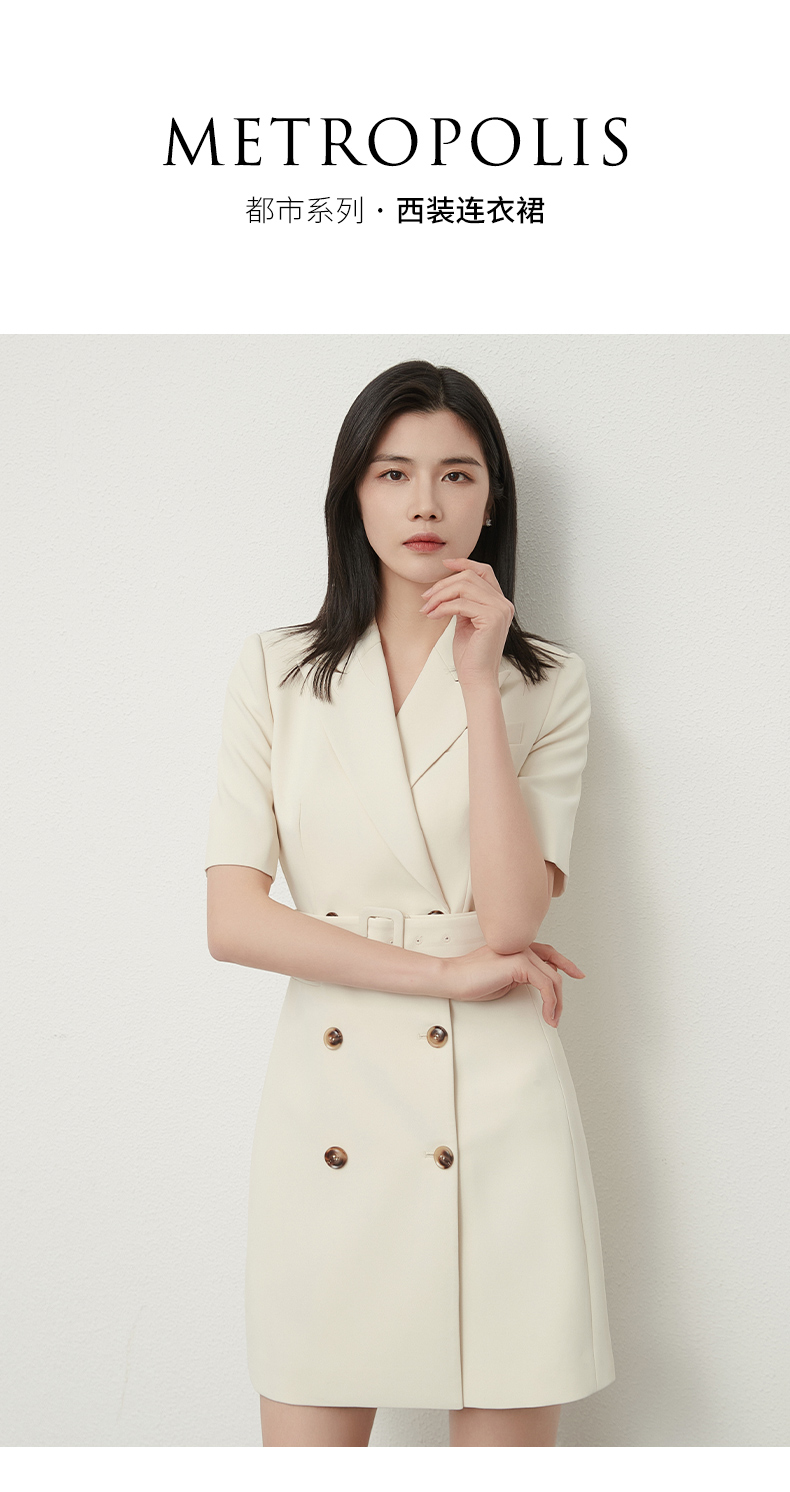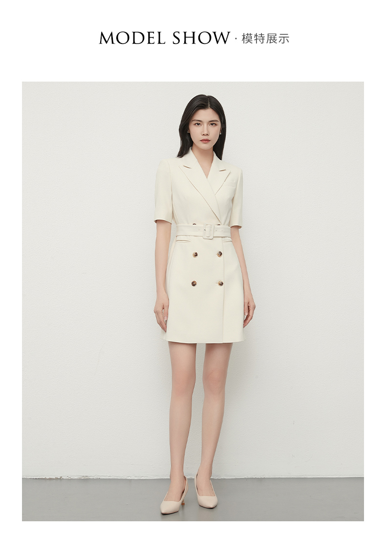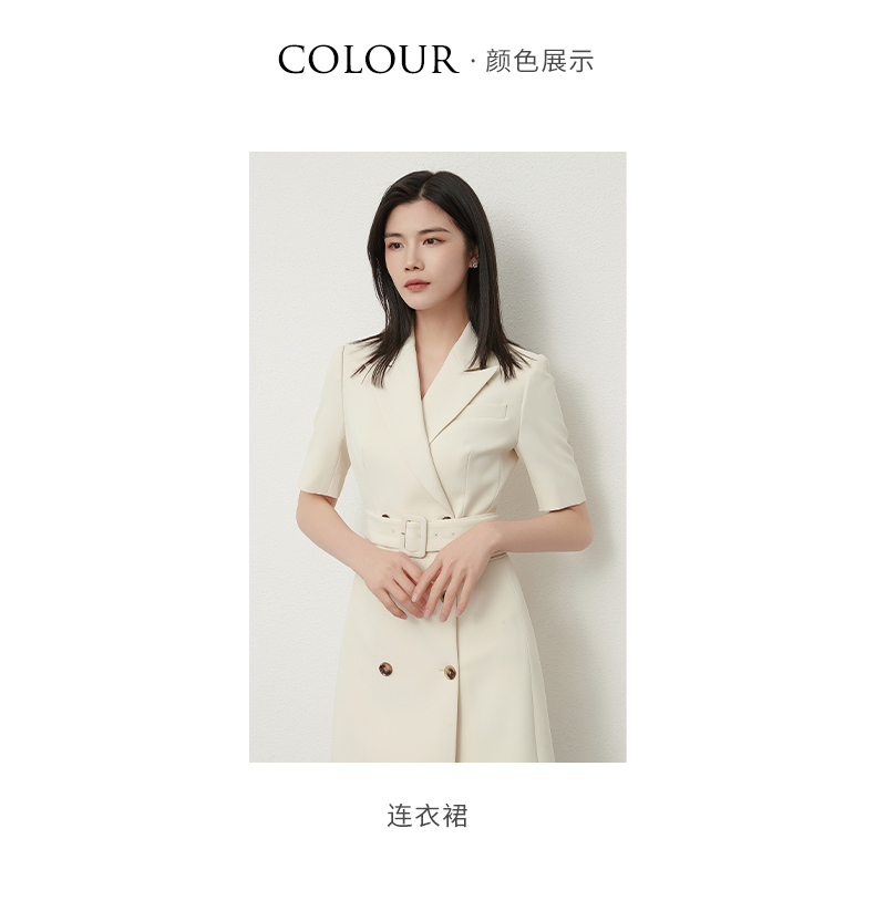 IWY/夏季短袖杏色西装连衣裙女薄款收腰显瘦气质播音主持人正装女Q13248
