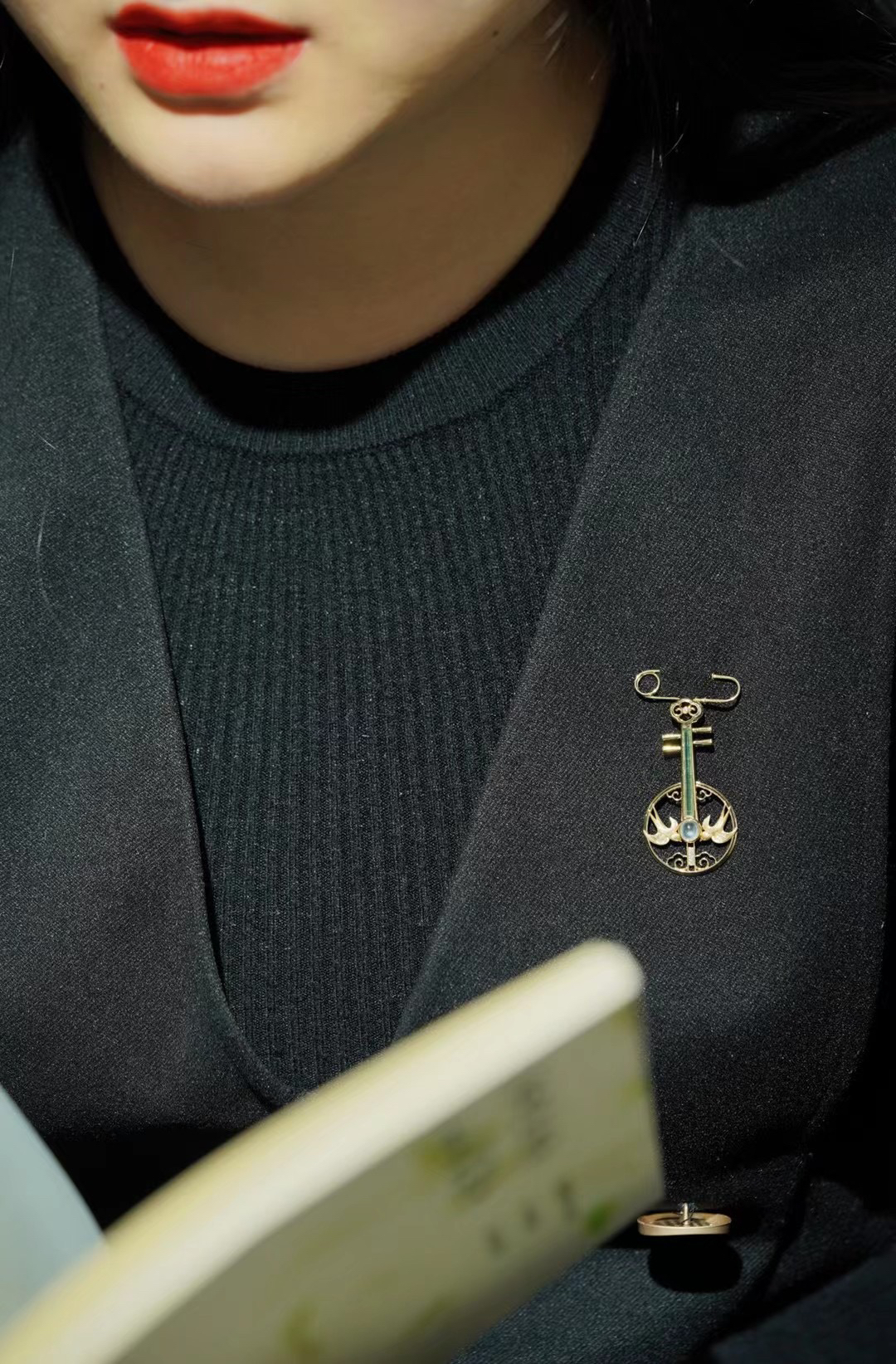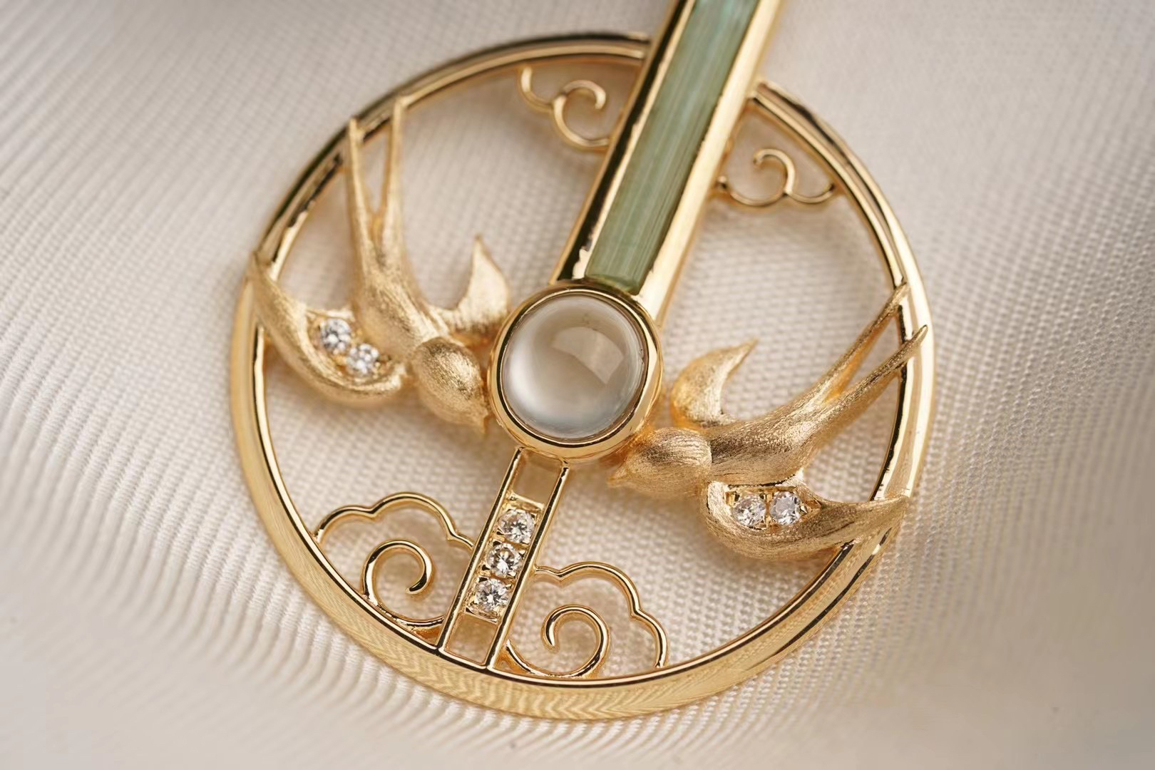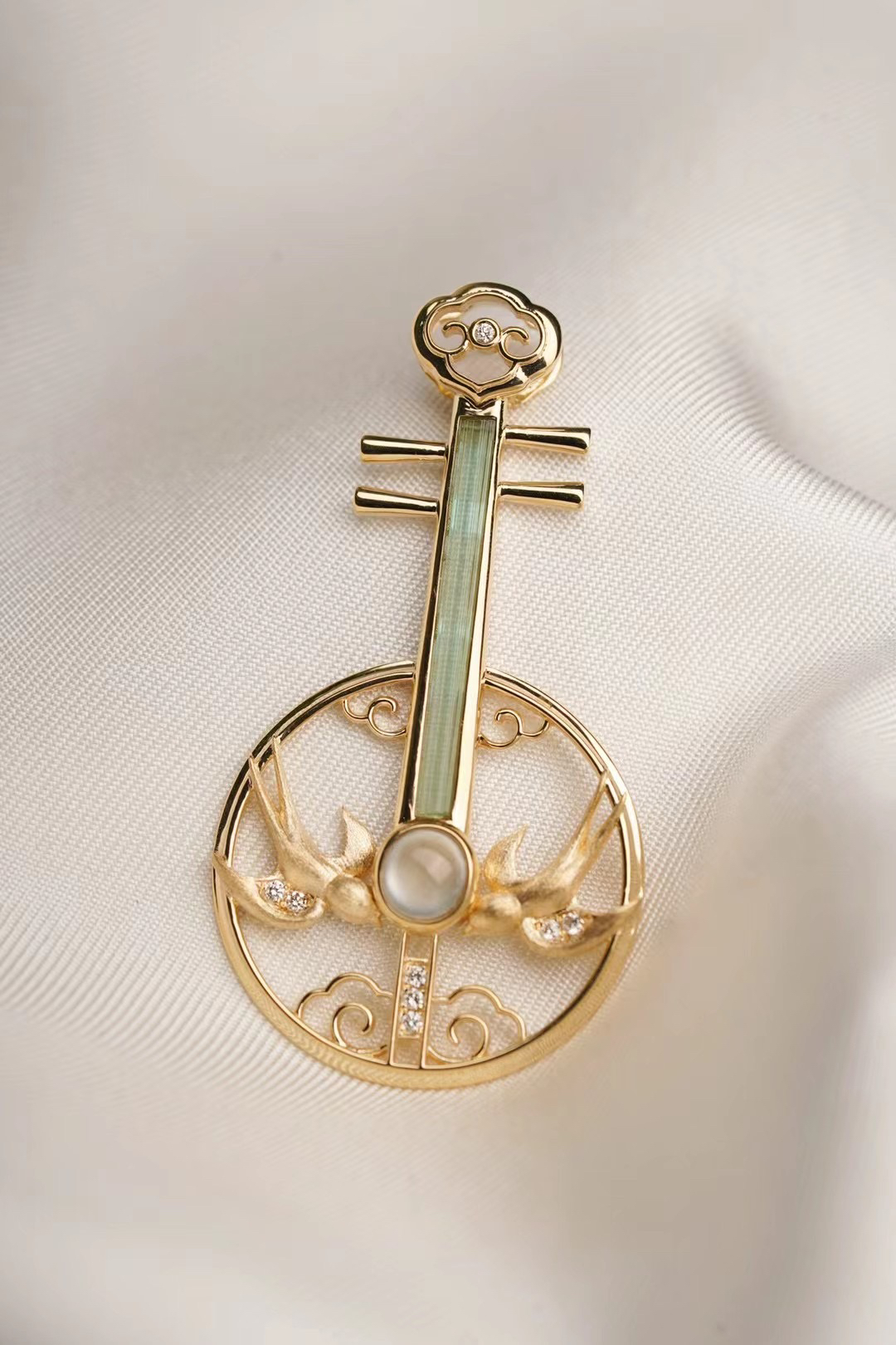 如果您仔细观察阮,会发现乐器的左右总有类似月牙🌙或鸟雀🦜的形状。我们选了这枚较粗的祖母绿柱体,取义"谁家新燕啄春泥",燕子的部分嵌入了绒质质感的花丝工艺。