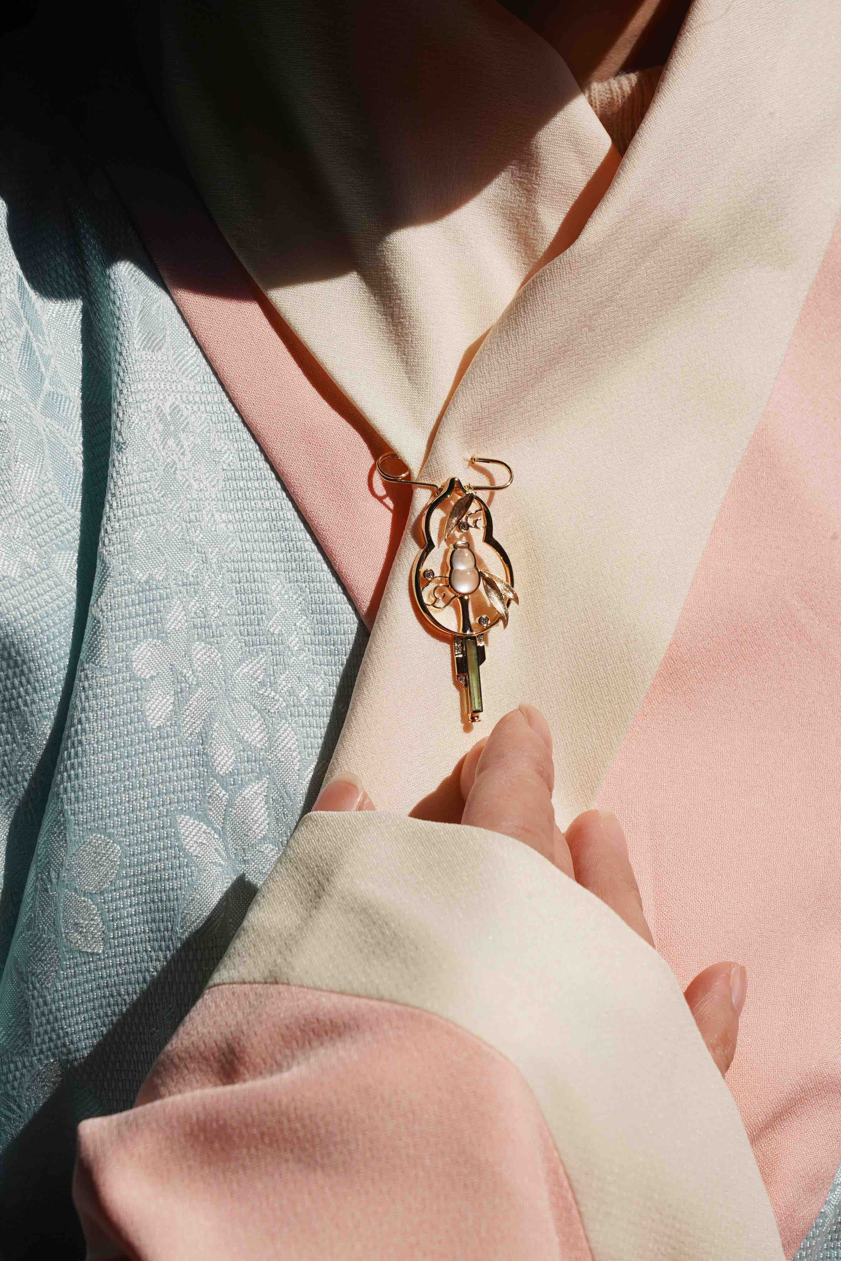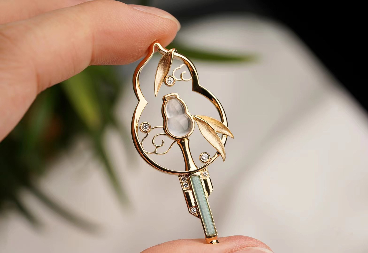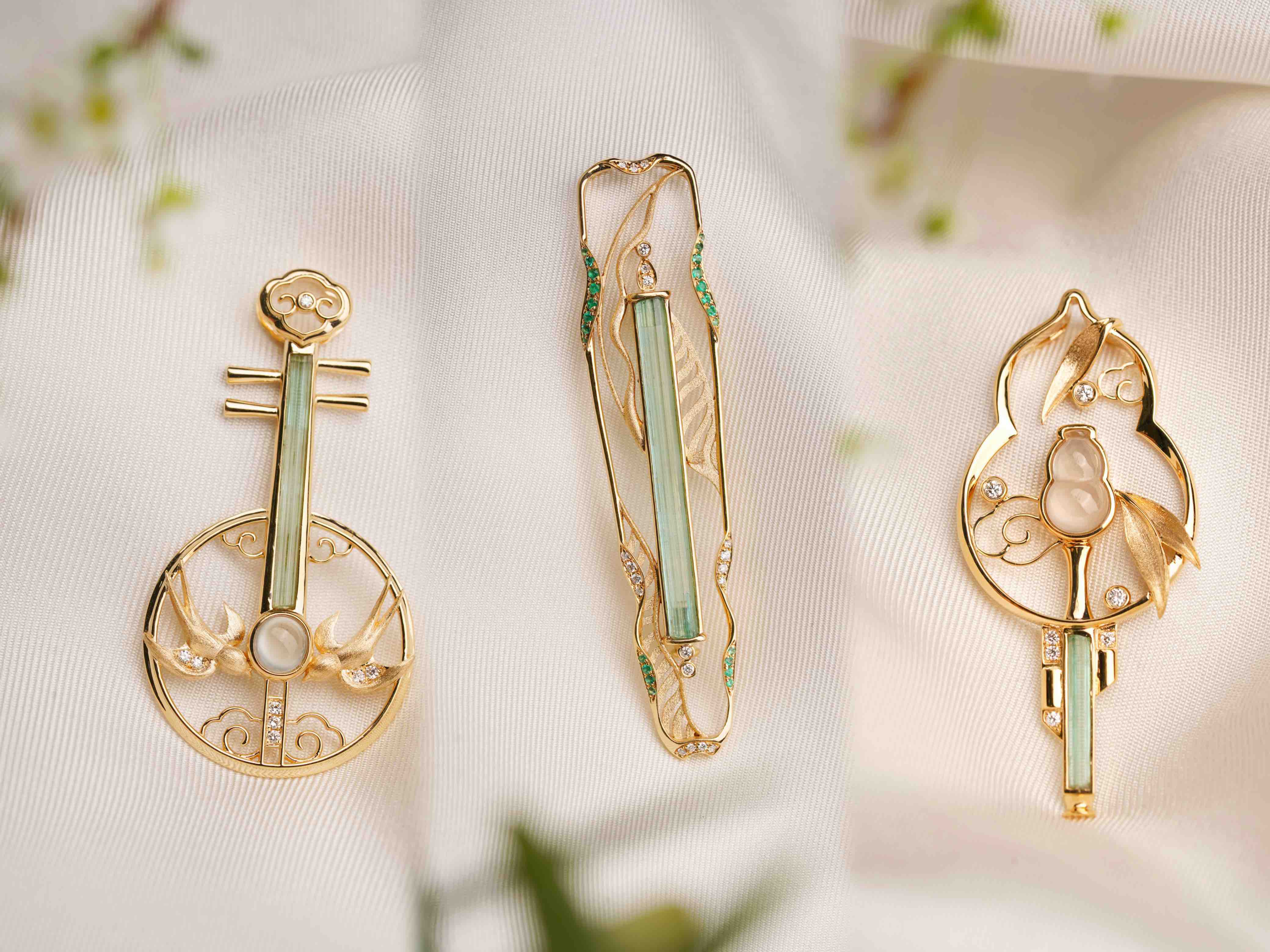 这是我们的原创,市面上也没有这样的作品。因为哥伦比亚无油祖母绿晶体住的限制,每个也是独一无二的,我们没有办法再去复刻。通过18 K金与钻石还原了葫芦丝的丝竹感,搭配一枚冰种的翡翠葫芦。