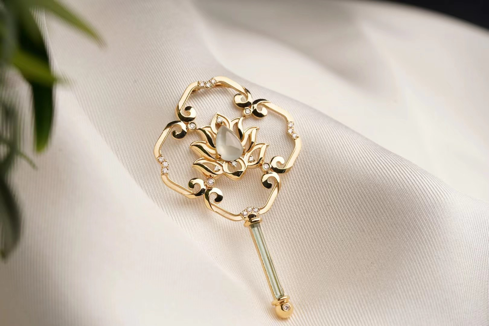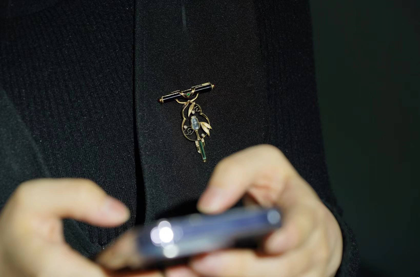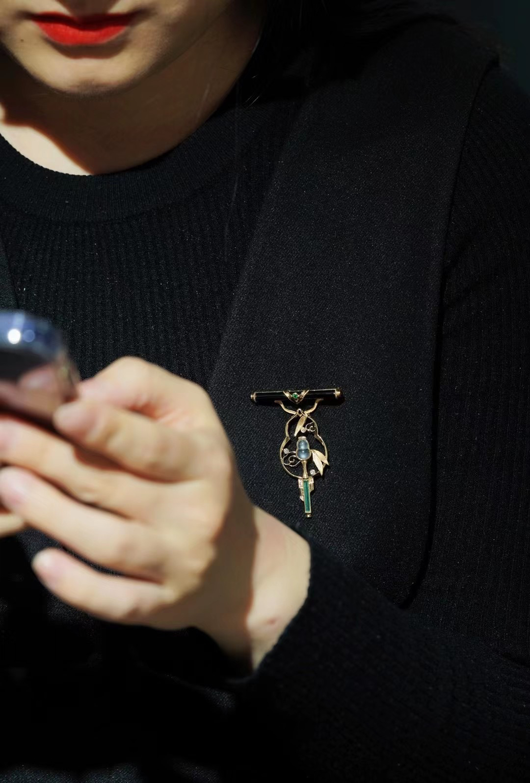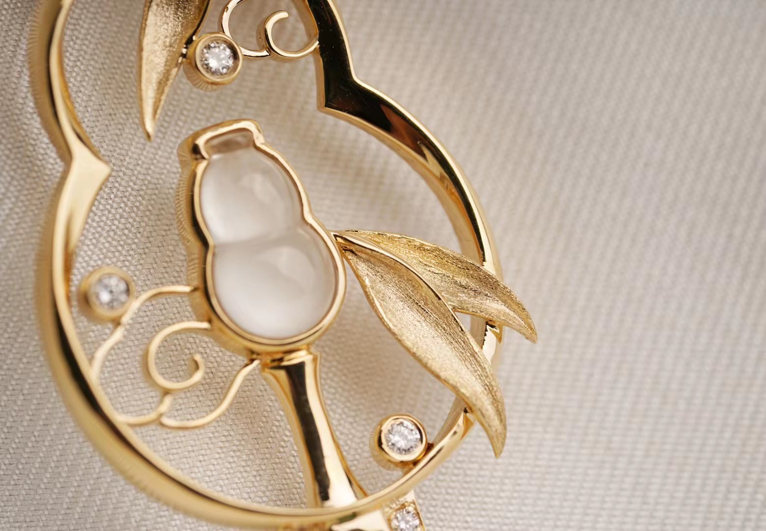 这是我们的原创,市面上也没有这样的作品。因为哥伦比亚无油祖母绿晶体住的限制,每个也是独一无二的,我们没有办法再去复刻。通过18 K金与钻石还原了葫芦丝的丝竹感,搭配一枚冰种的翡翠葫芦。