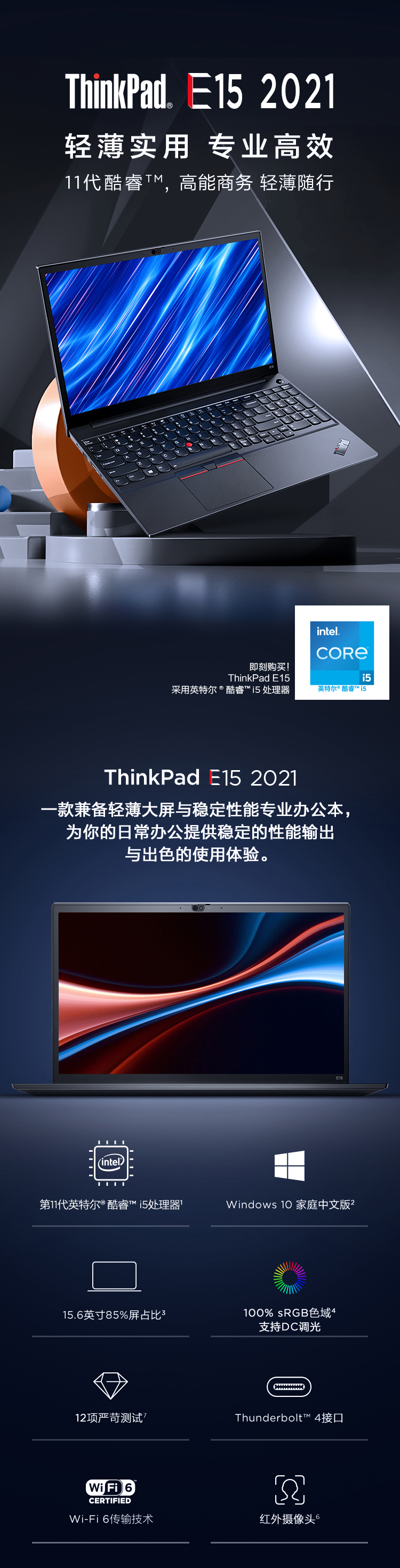 Thinkpad E15:i5-1135G7/16G内存/512GSSD固态硬盘/MX450-2G独显/高性能设计办公商务本