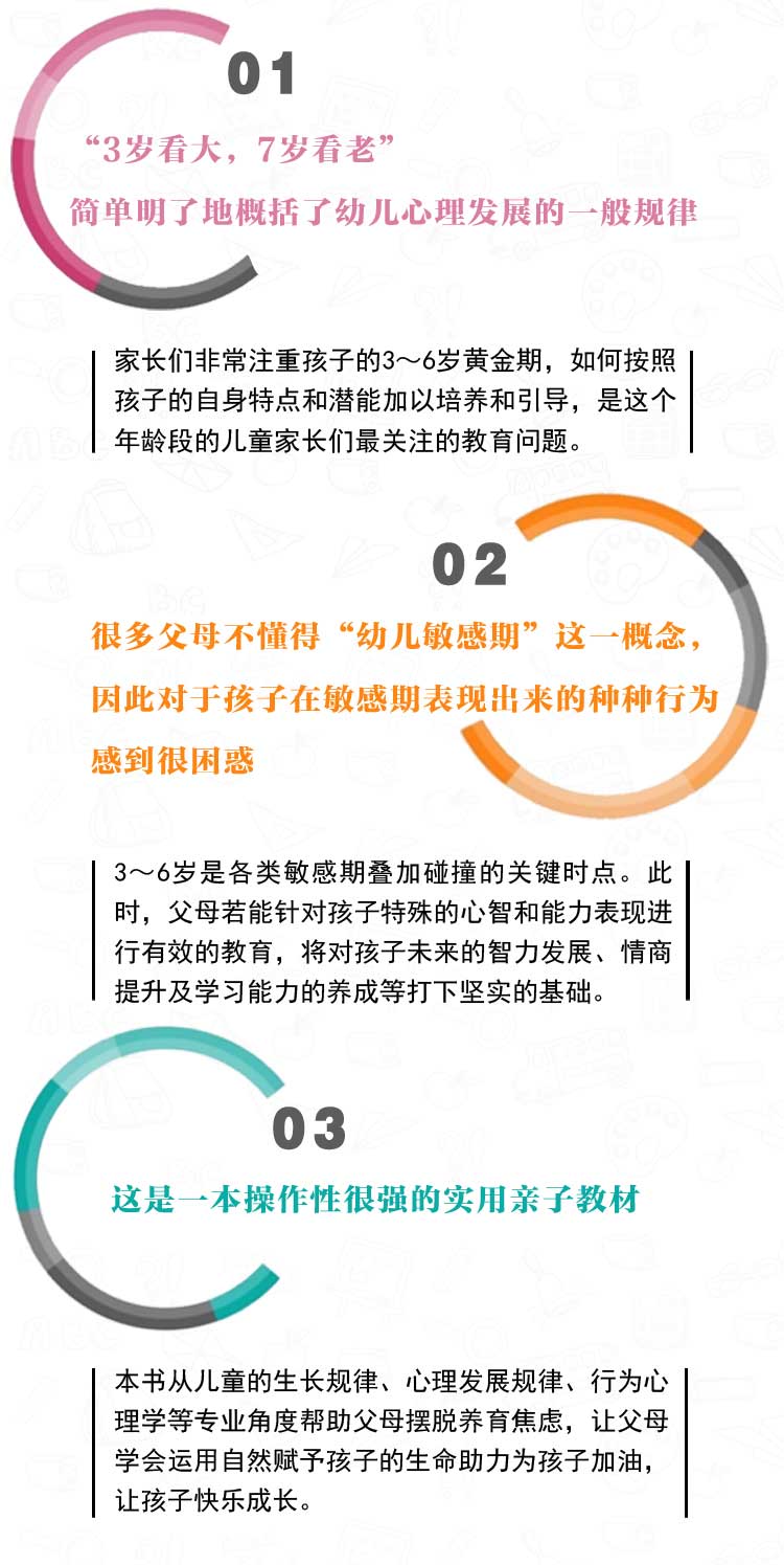 3~6岁,是孩子处于敏感期迸发惊人力量和学习兴趣的阶段。此时孩子接受教育的效果*为明显,可以说敏感期是孩子各项能力发展的黄金时期。在这一阶段,父母教育孩子不应只看表面,要探究孩子行为背后的心理因素,这样才能对症下药,正确引导。可以说,读懂孩子,抓住孩子的成长敏感期,解开孩子行为背后的心理密码,是父母的*课。