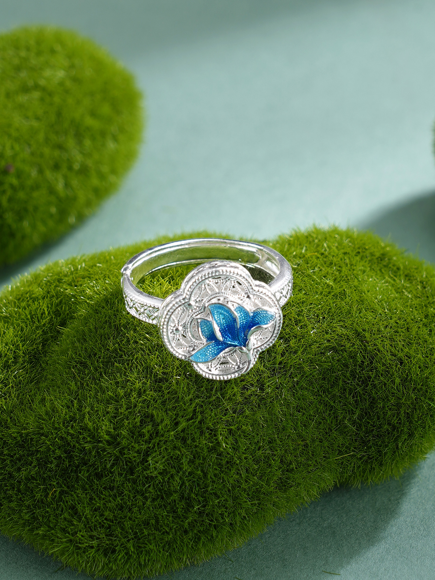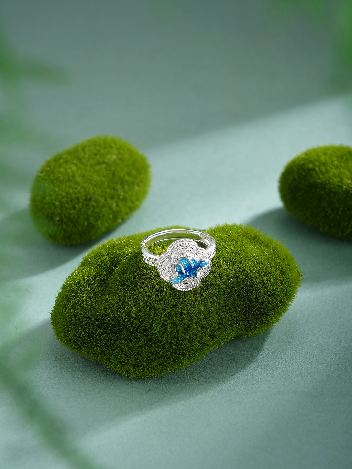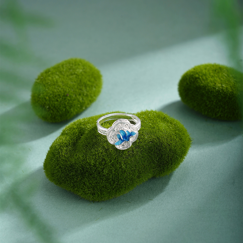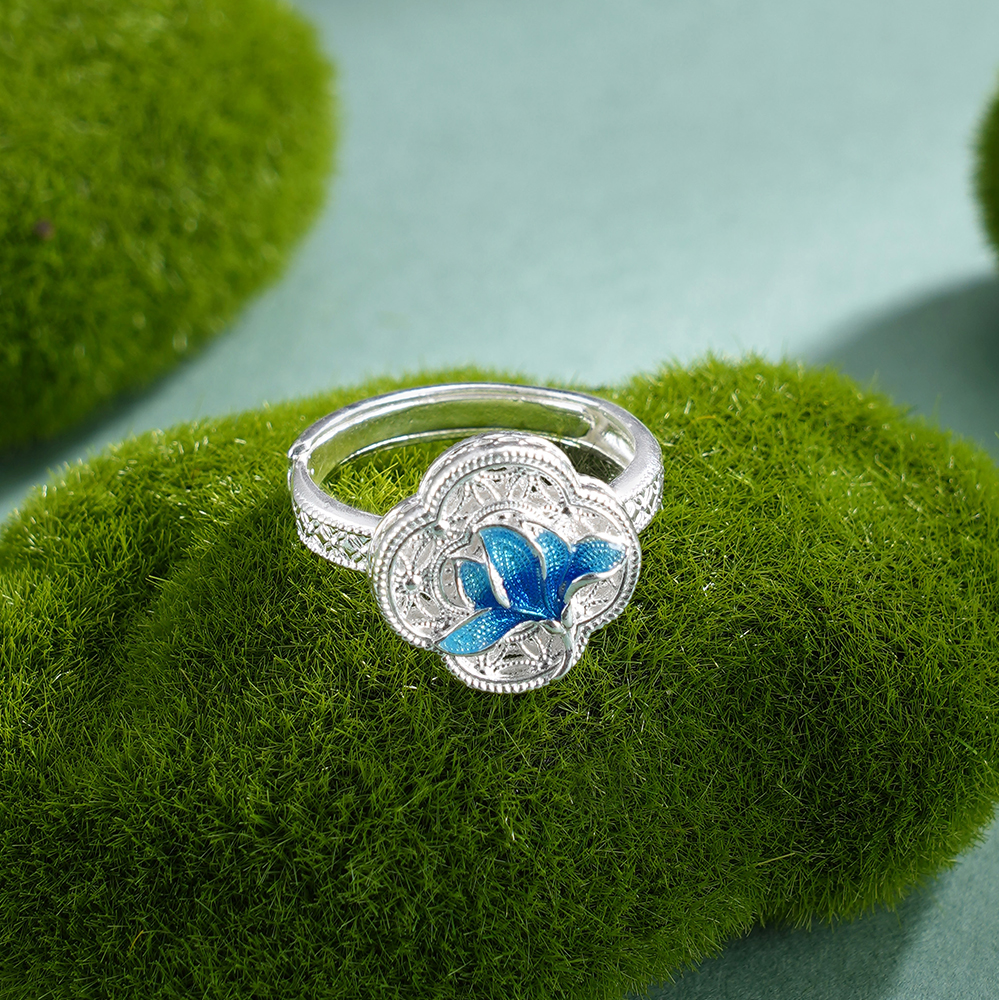 子佩集【轩畔玉兰】银S990戒指【QFJZ011】原创作品花丝珐琅彩四叶玉兰莲2602