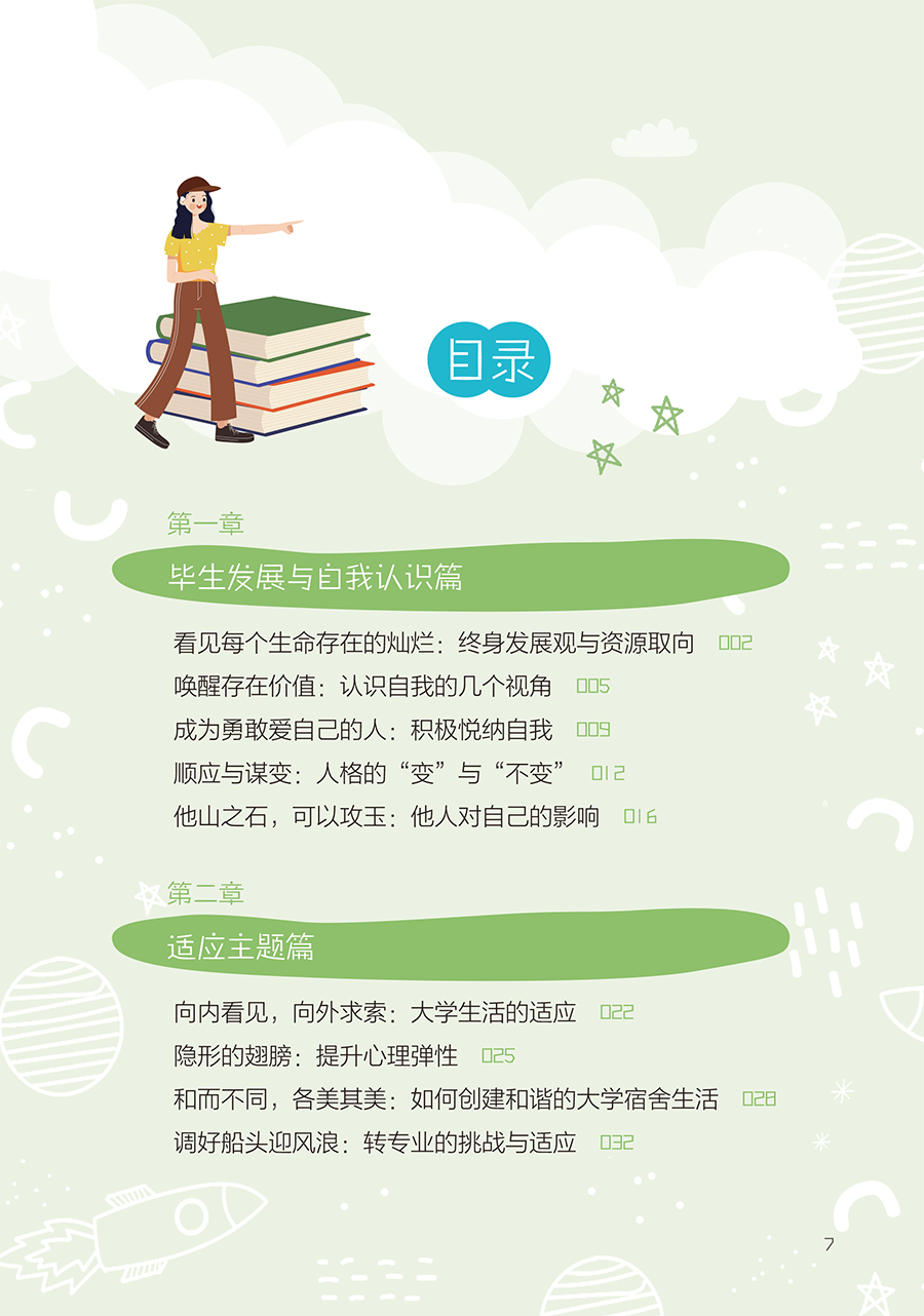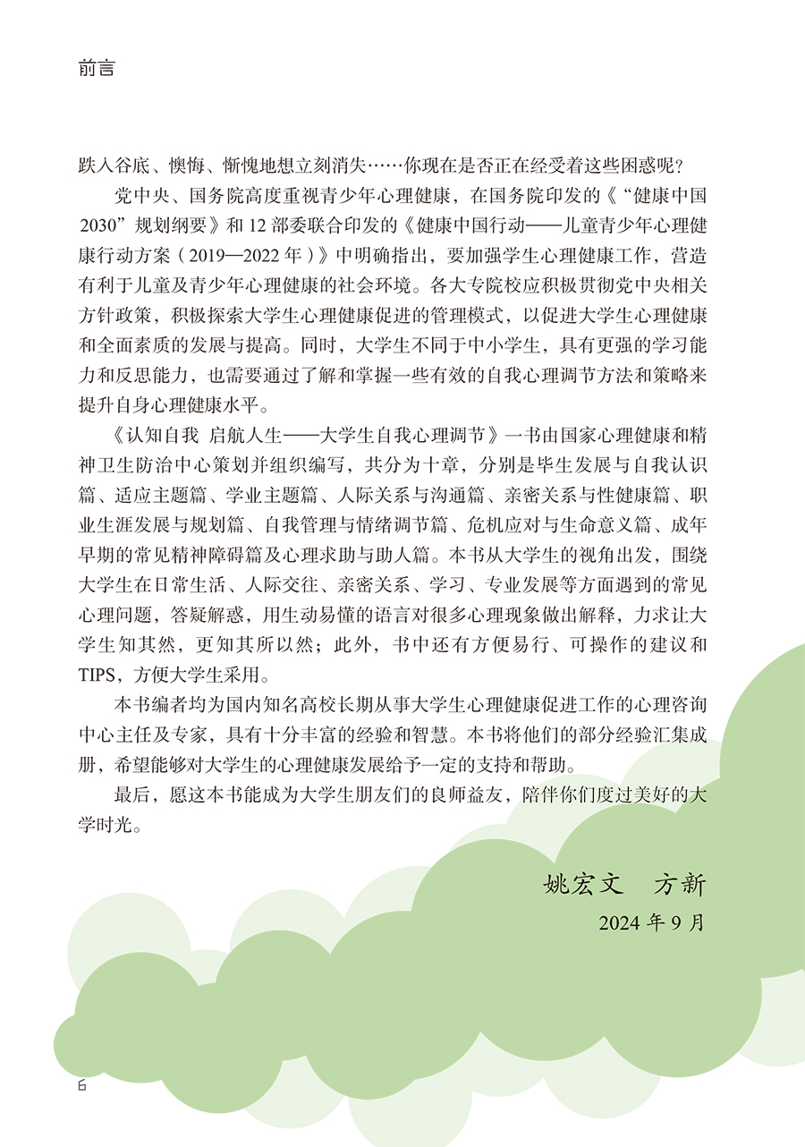 本手册着眼大学生心理健康的热点问题,内容通过主题式的设计,借助典型案例的分析,聚焦大部分学生遇到的典型发展性心理问题,如学业、人际交往、恋爱关系、情绪管理、求职、融入社会等,提供可以操作的方法和策略,为大学生的心理健康赋能。紧密围绕目标读者所处年龄段的典型心理问题,给予一定的心理健康知识普及,同时更注重大学生学校到职场转换的特殊阶段,通过生动案例引发读者共鸣,提供便捷、可操作性心理自助策略和方法。