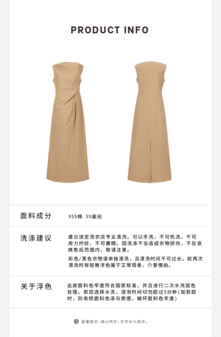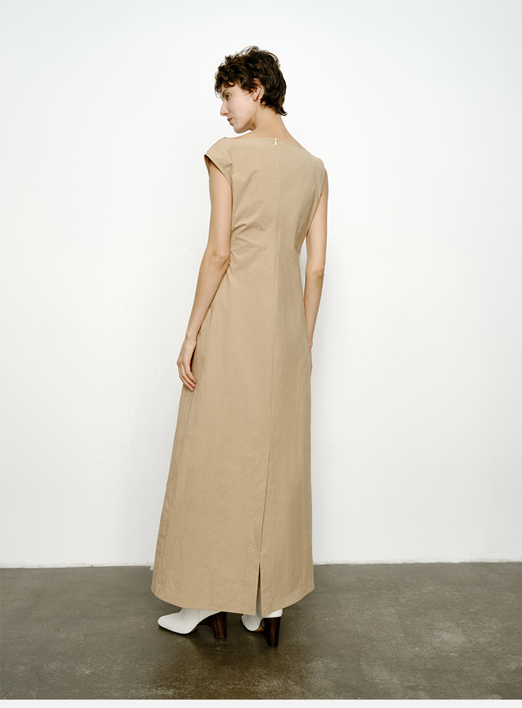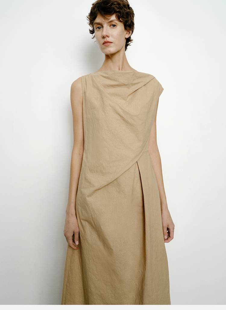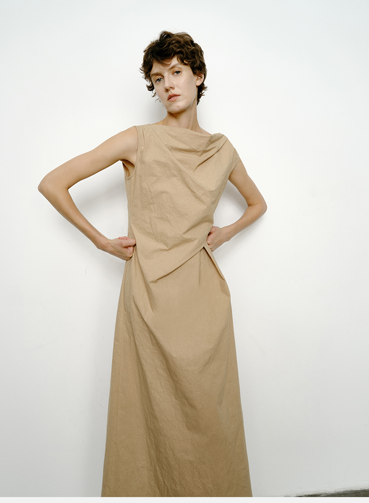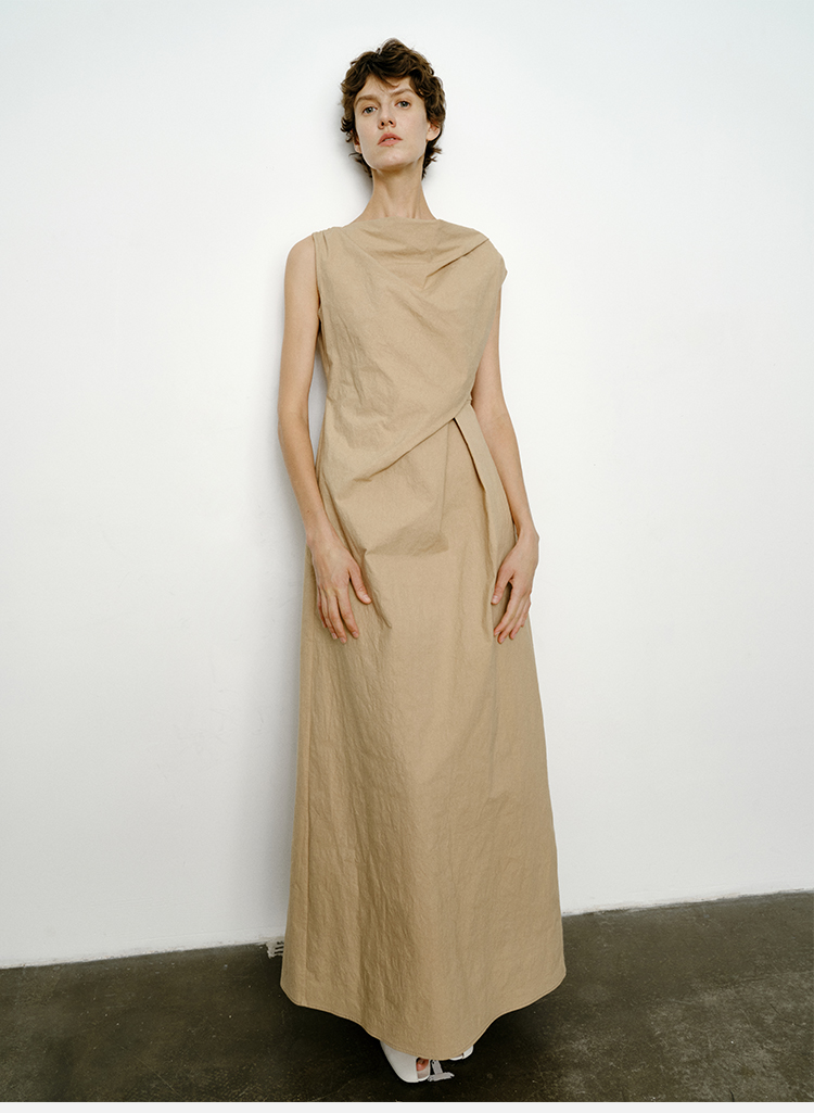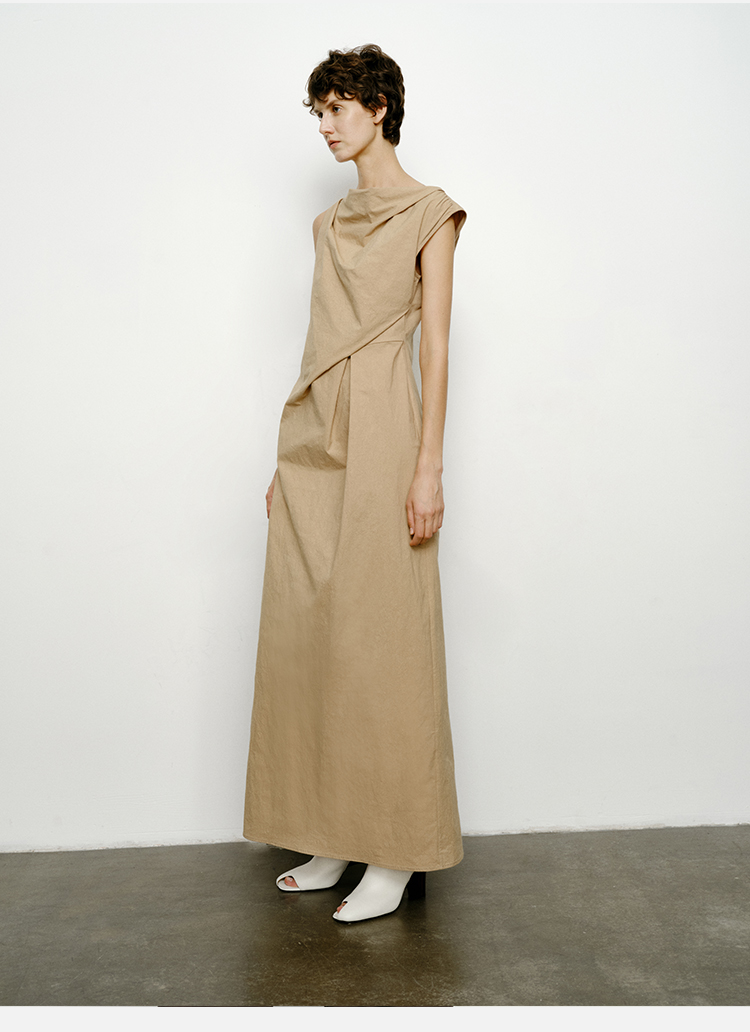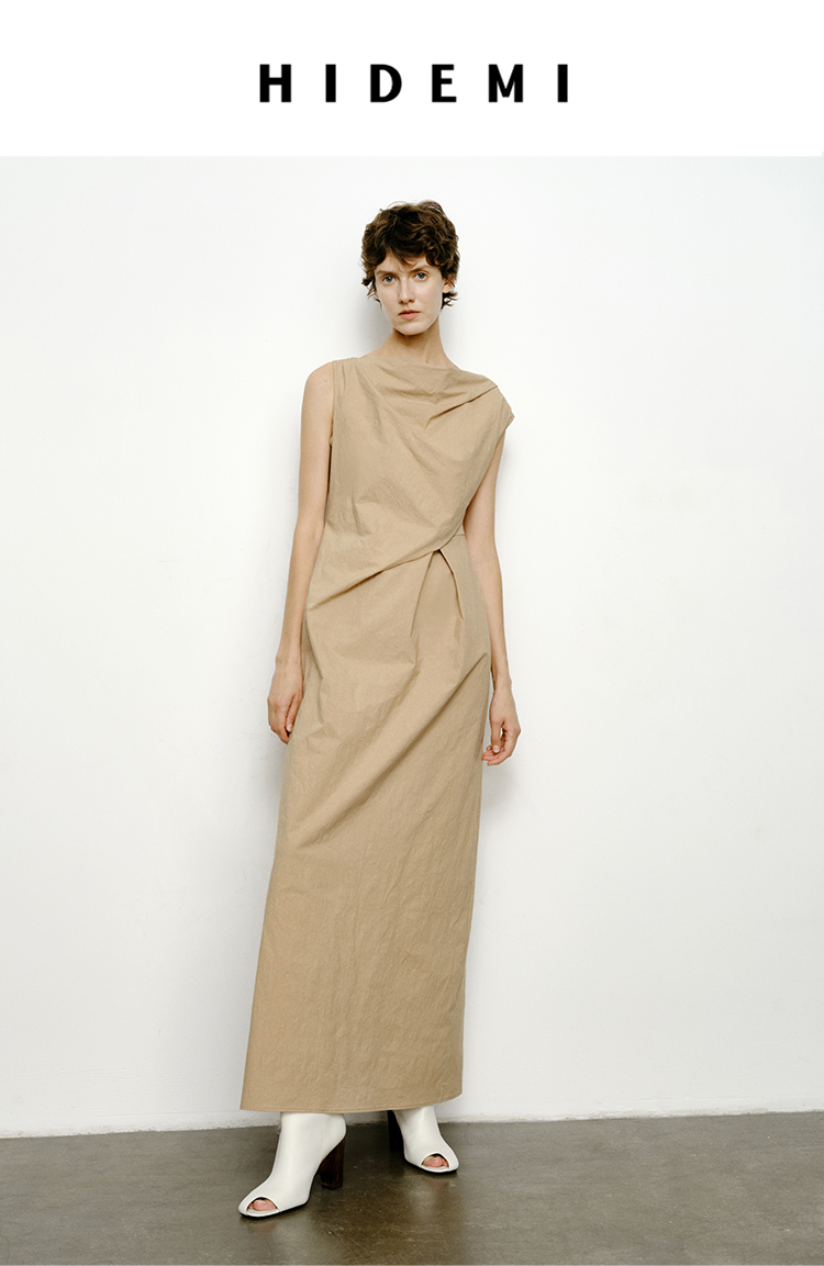 HIDEMI 沙丘色极简不对称雕塑感褶皱特殊工艺纸感立裁连衣裙长裙