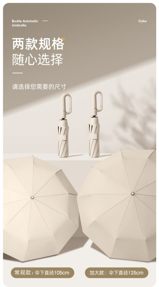 简约经典款的晴雨两用伞 各种突发天气,有它在,满满的安全感!! 这款环扣自动晴雨伞,优点实在太多👇👇 ✅高韧性玻纤材质,吹不翻伞骨 ✅仿生荷叶的设计,雨伞轻轻一甩就干 ✅能遮挡99%的紫外线,出门必备 ✅包包、行李箱、架子上面随处可挂 ✅合金钢伞杆,防锈坚固
