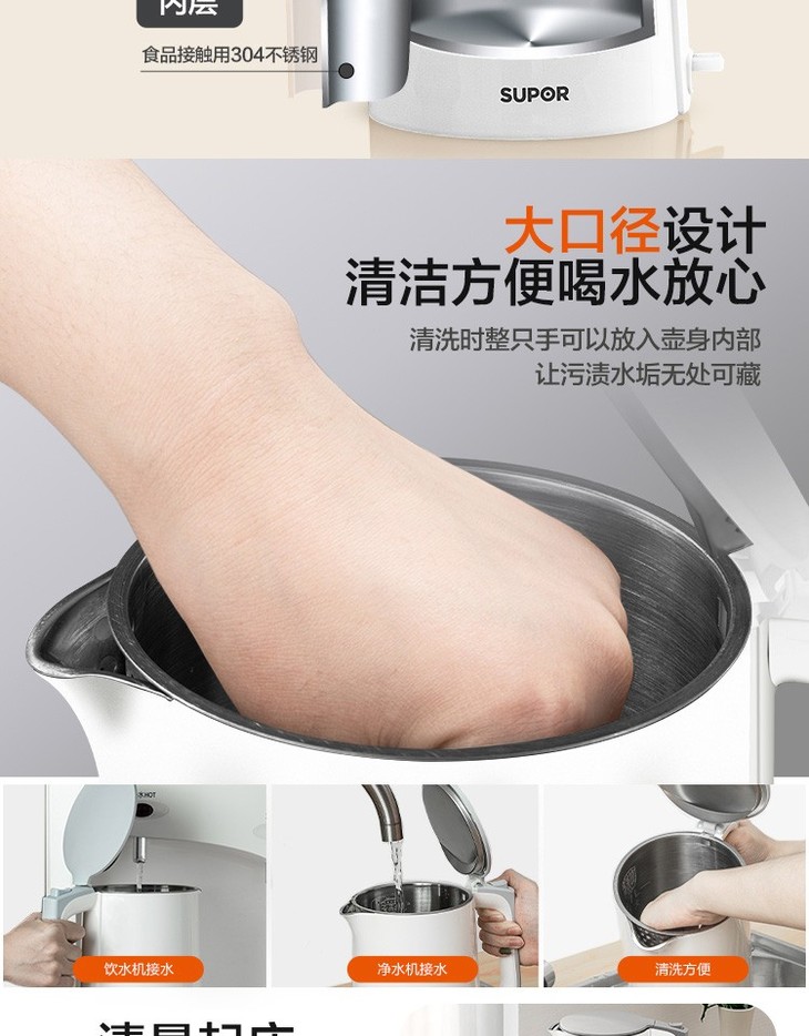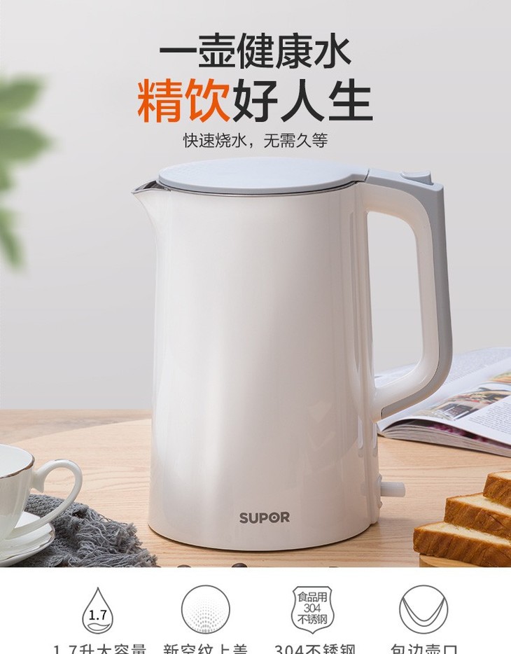 苏泊尔(509680)(SUPOR) SW-17S13A 电水壶 1.7L容量 全钢无缝内胆 双钢防烫保温 一键开盖 白灰英国品牌温控器
