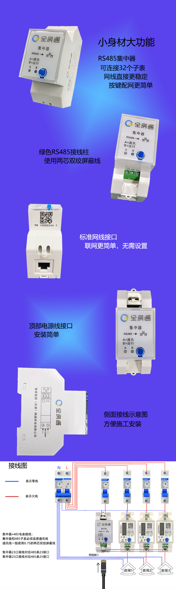 集中器需要搭配485电表使用,1个485集中器最多可以连接32个485电表。