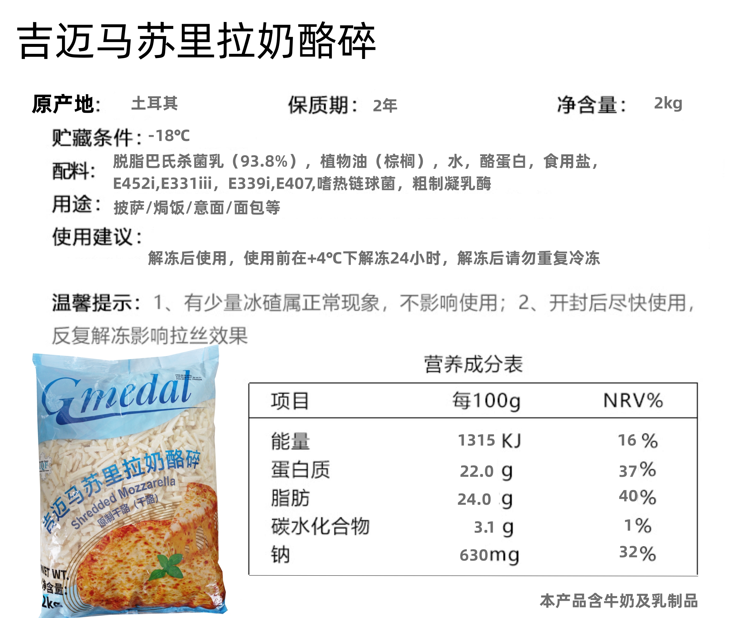 2kg 吉迈马苏里拉奶酪碎 原制干酪 土耳其进口 冷冻芝士碎 披萨焗饭意面面包原料