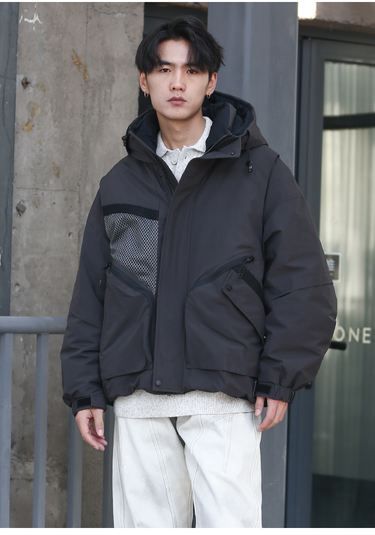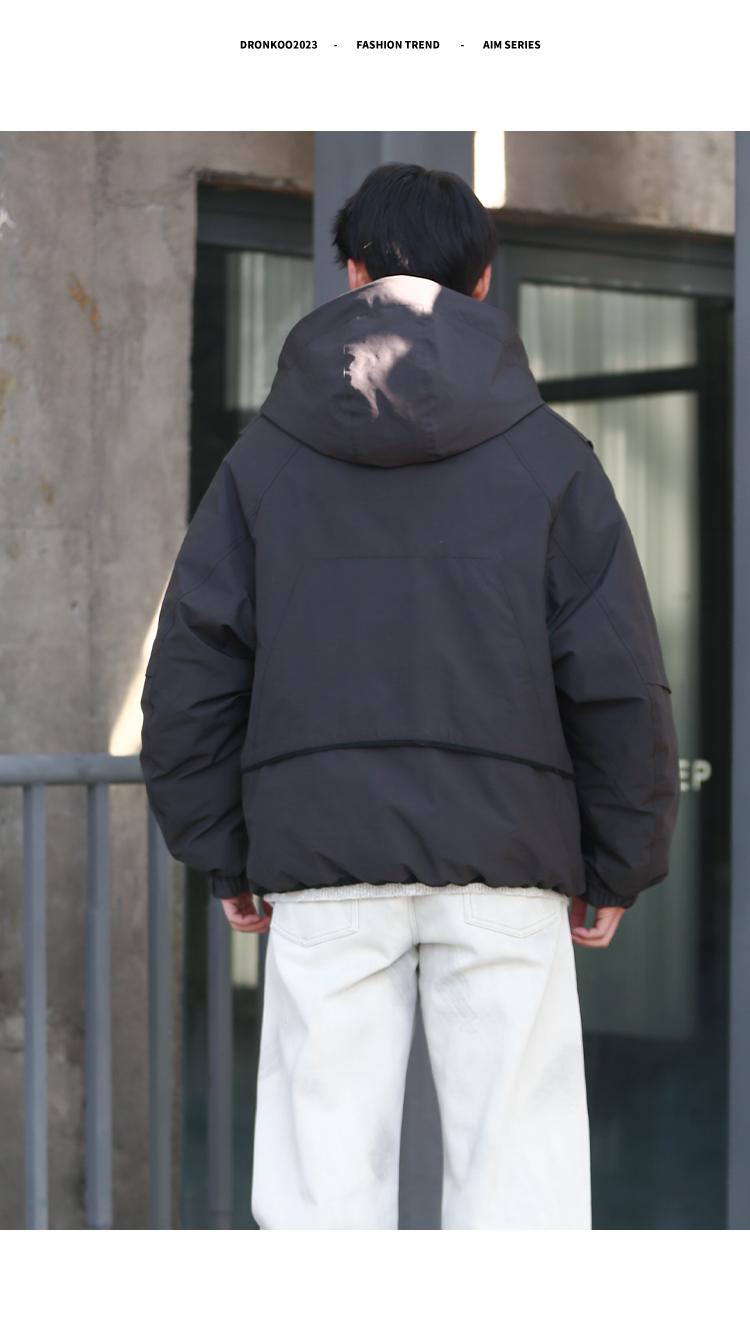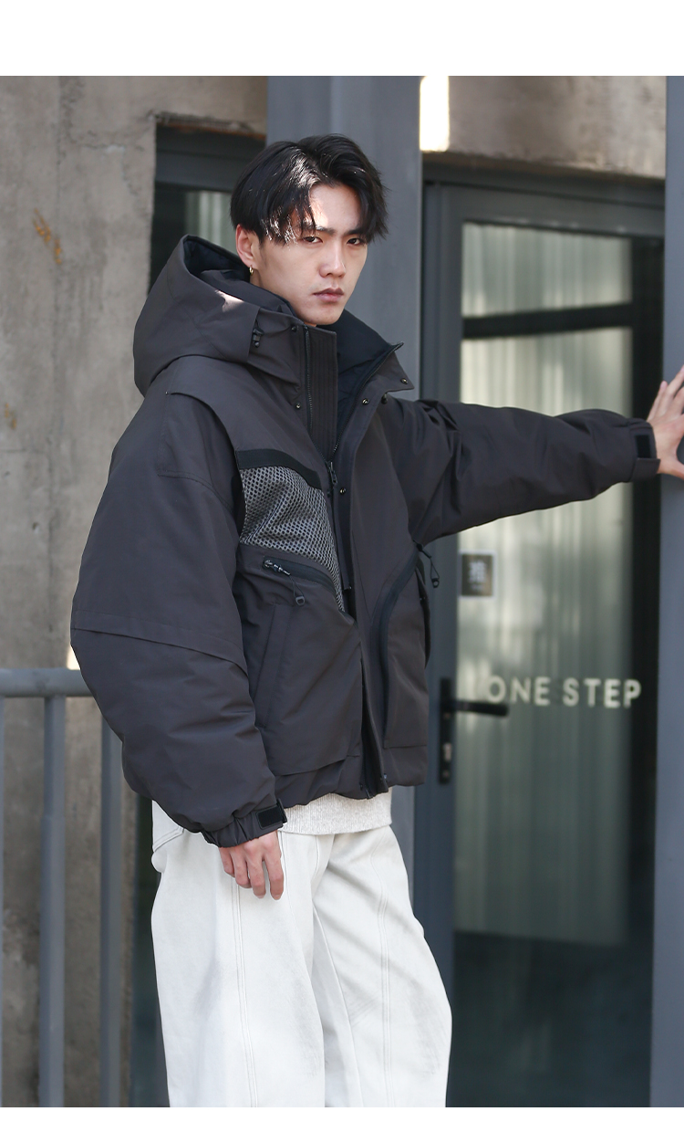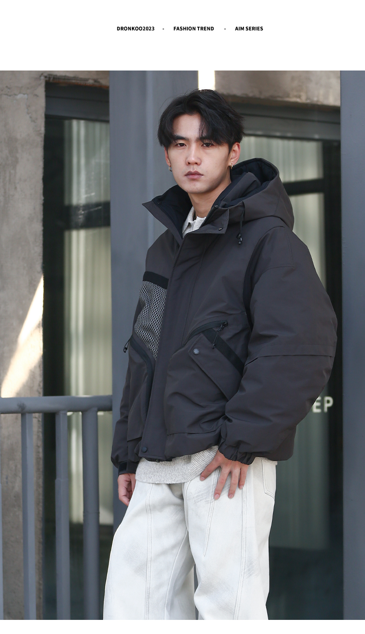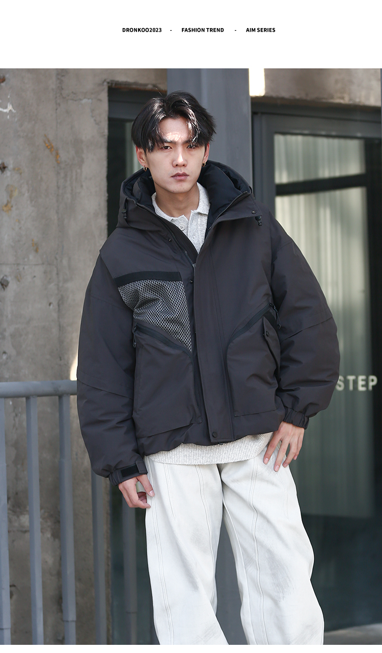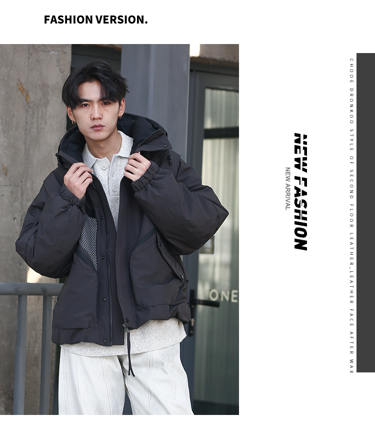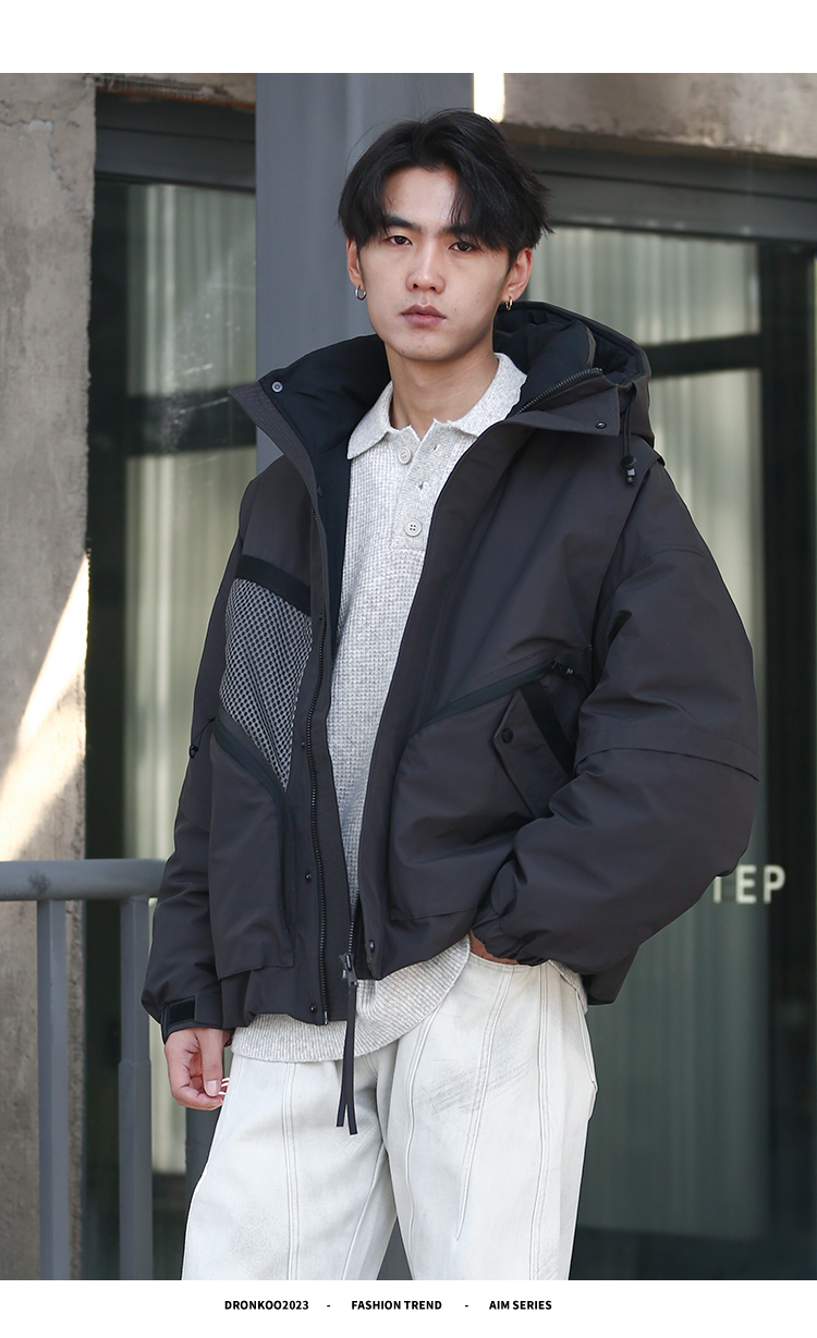 DRONKOO 2025 连帽右织带网布左袋盖织带洗水做旧工装风短款厚羽绒服