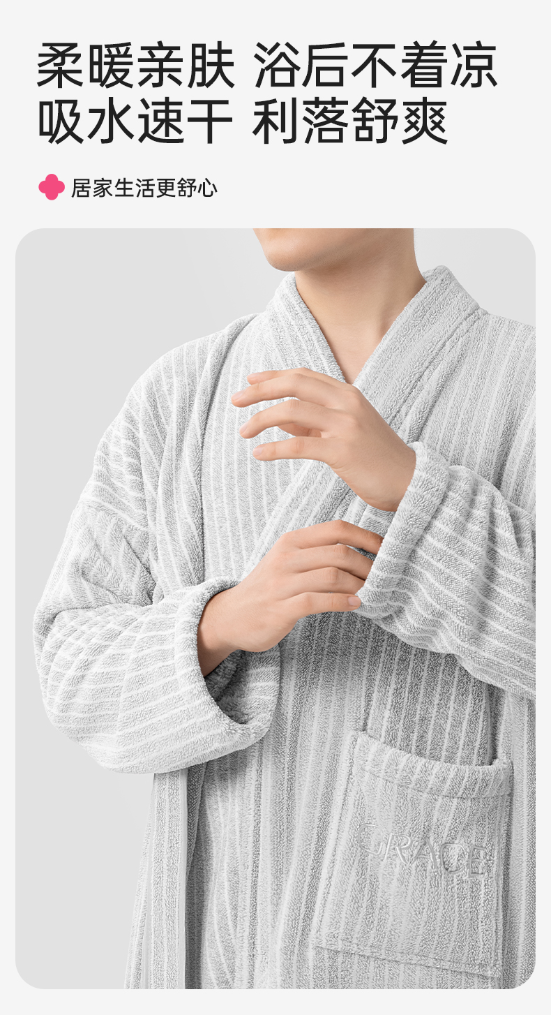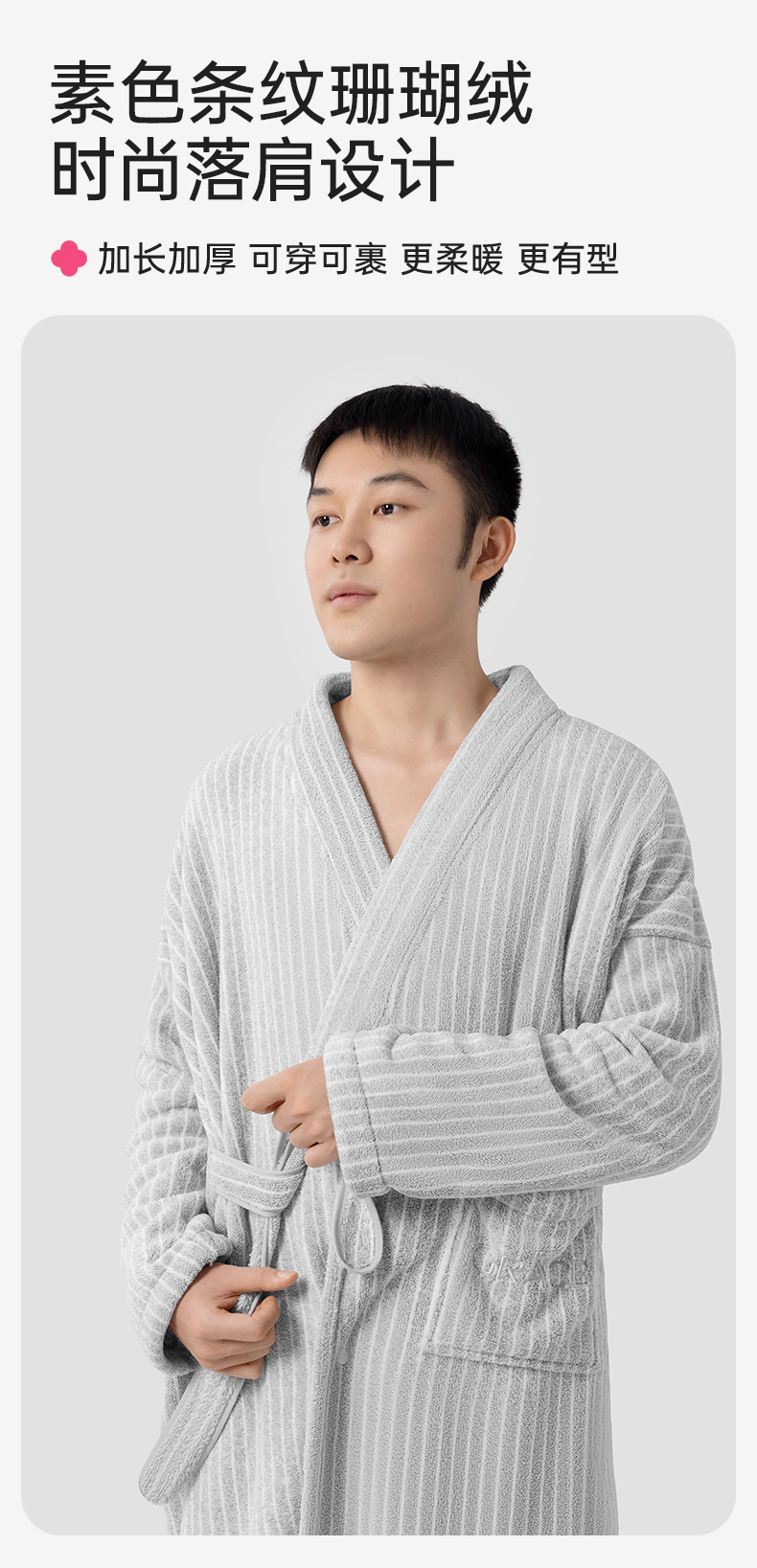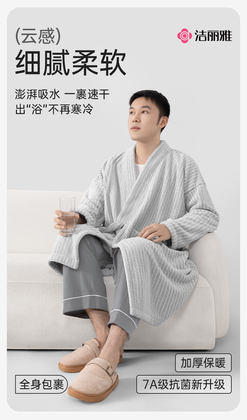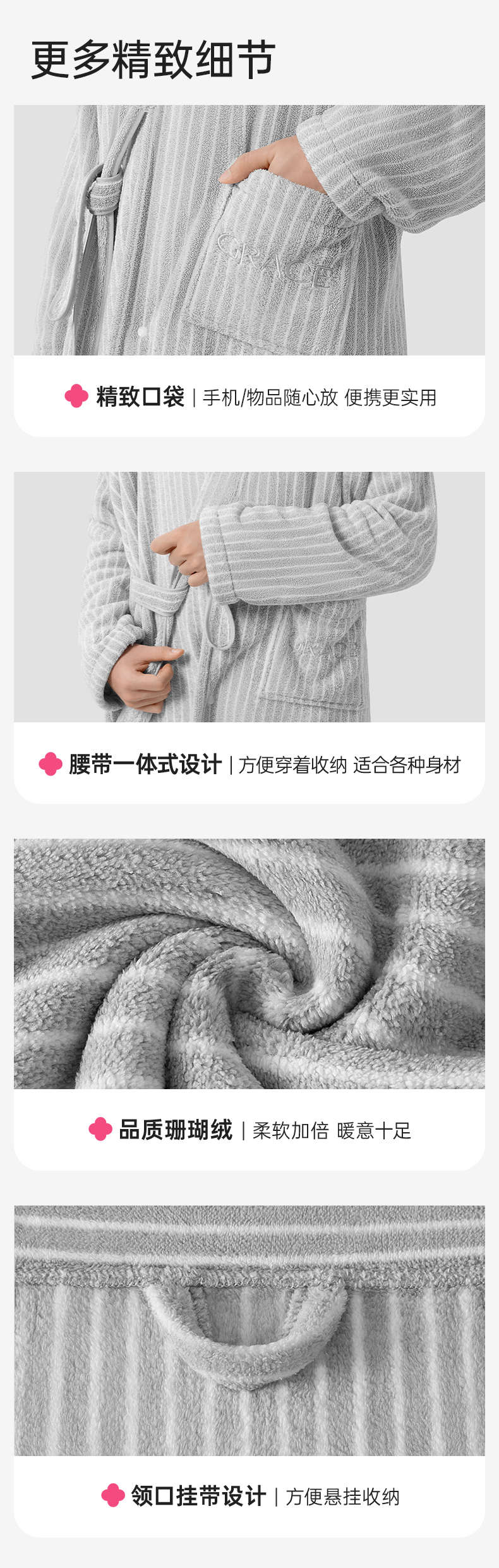 洁丽雅条纹浴袍加厚珊瑚绒男女吸水成人家用情侣浴衣保暖家居服