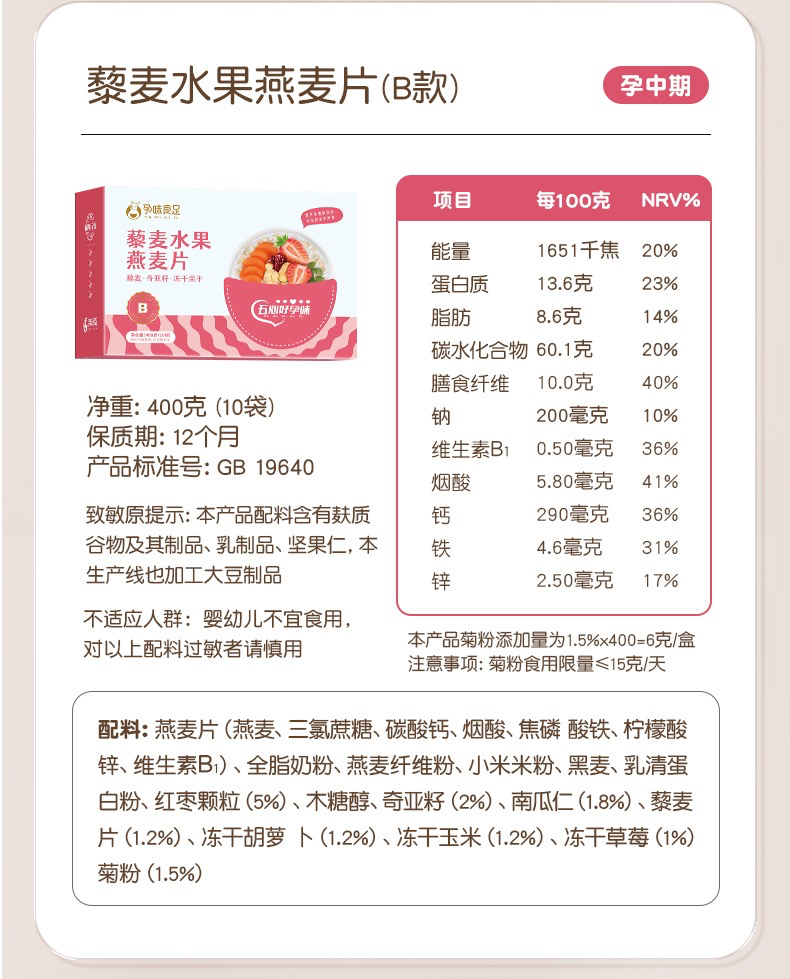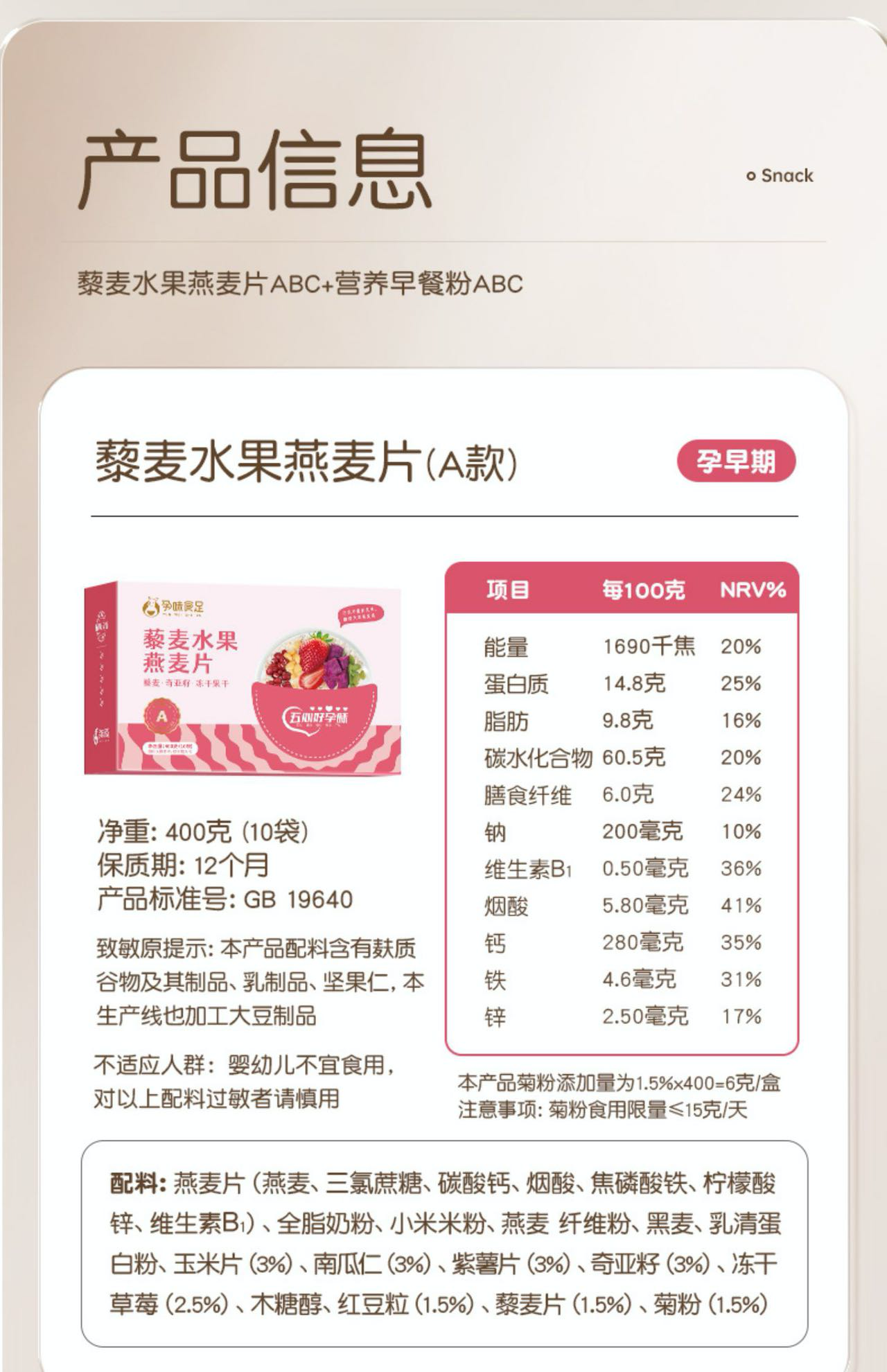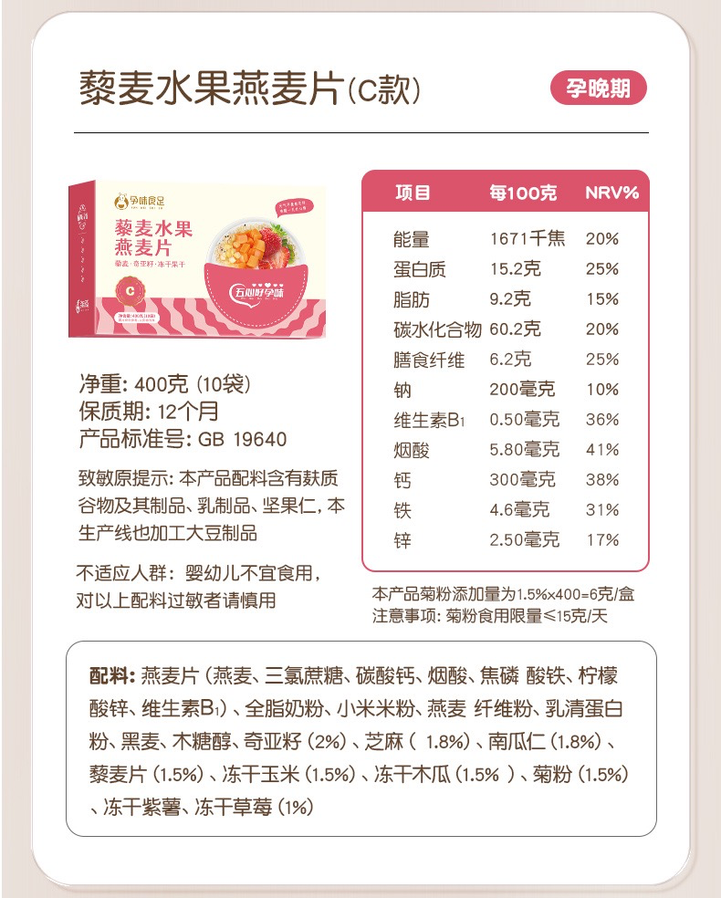 【包邮到家|孕味食足-藜麦水果燕麦片】400g一盒(内10袋)高钙+高蛋白 独立袋装 非孕妈人群也可食用 如风生活特惠