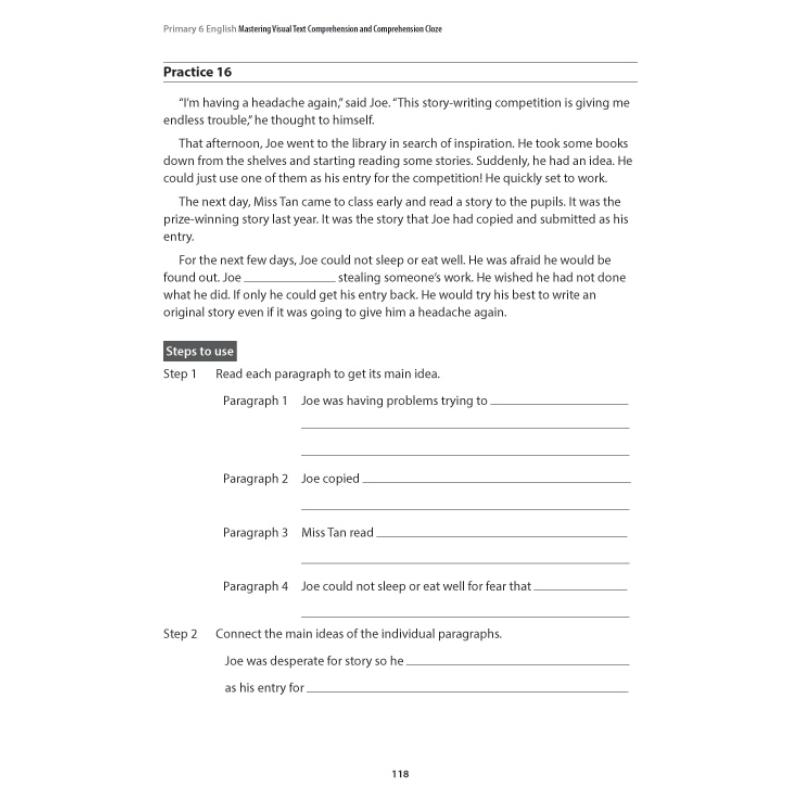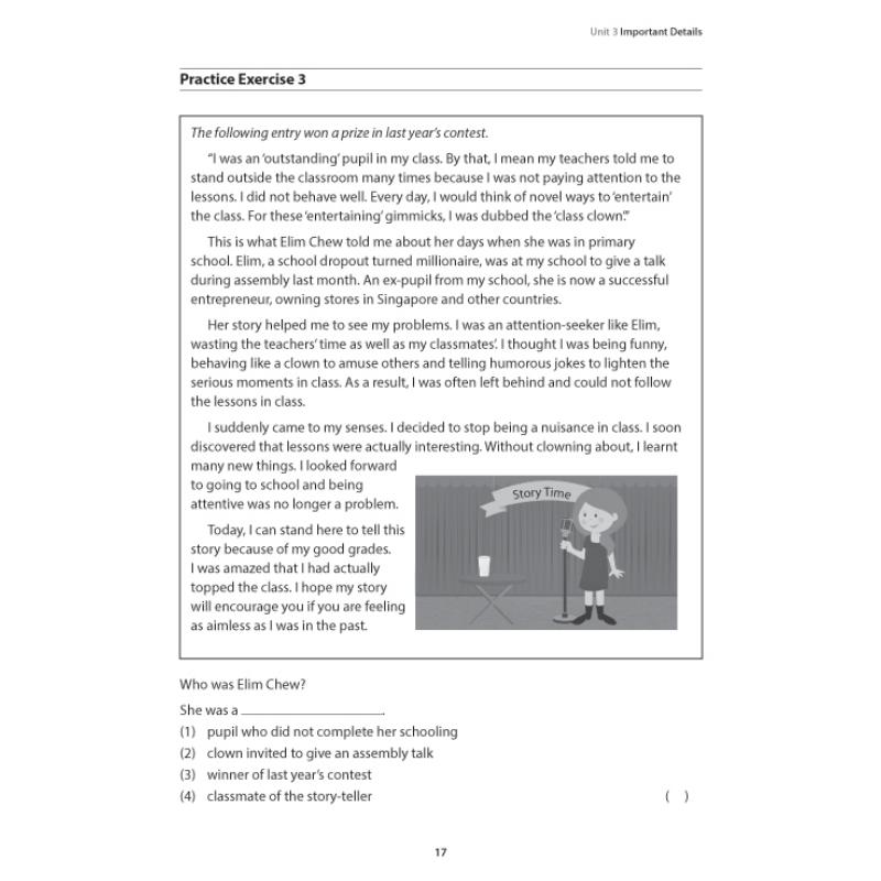Comprehension cloze is a test of pupils’ ability to comprehend a text. There are 15 deletions in the text. The missing words are from different word classes. The following are some useful strategies on comprehension cloze covered in this book: (a) Collocations, (b) Contextual clues, (c) Connectors, (d) Synonyms / Antonyms, (e) Summary, (f) Grouping, (g) Referring back and forward, (h) Cumulative and global comprehension. 10 tests in Comprehension Cloze follow this section.